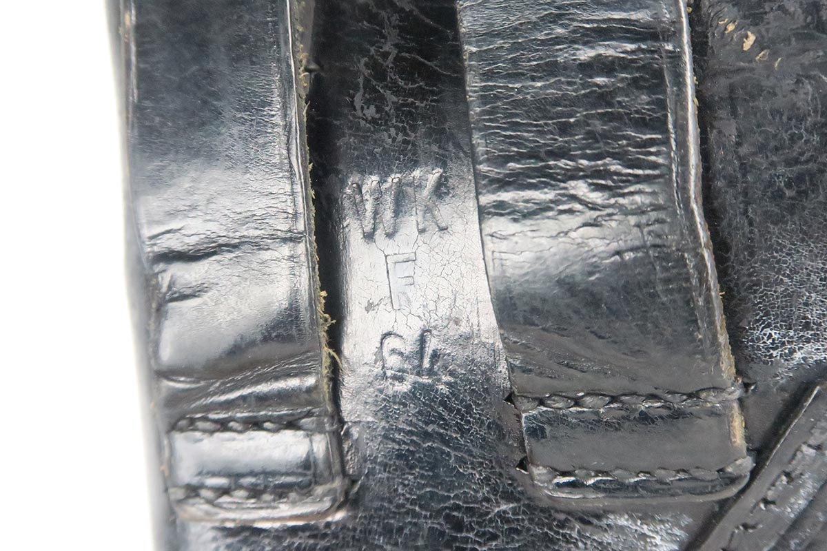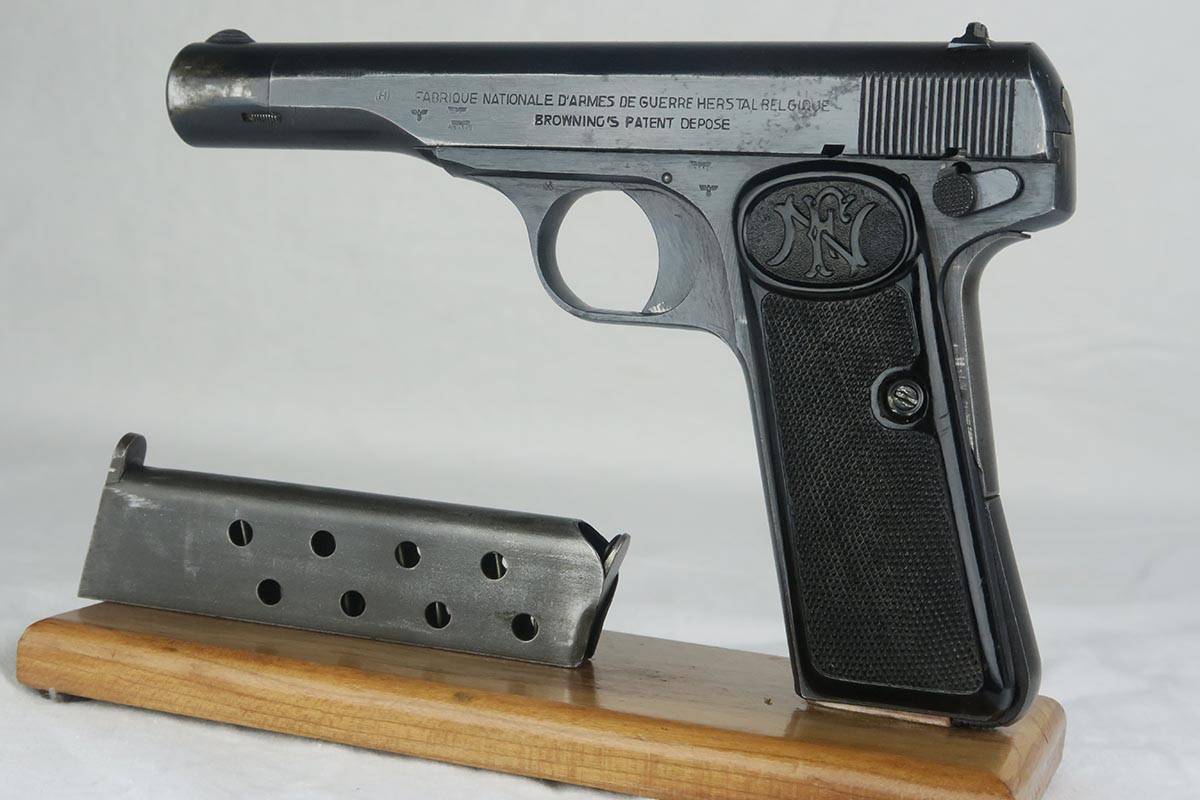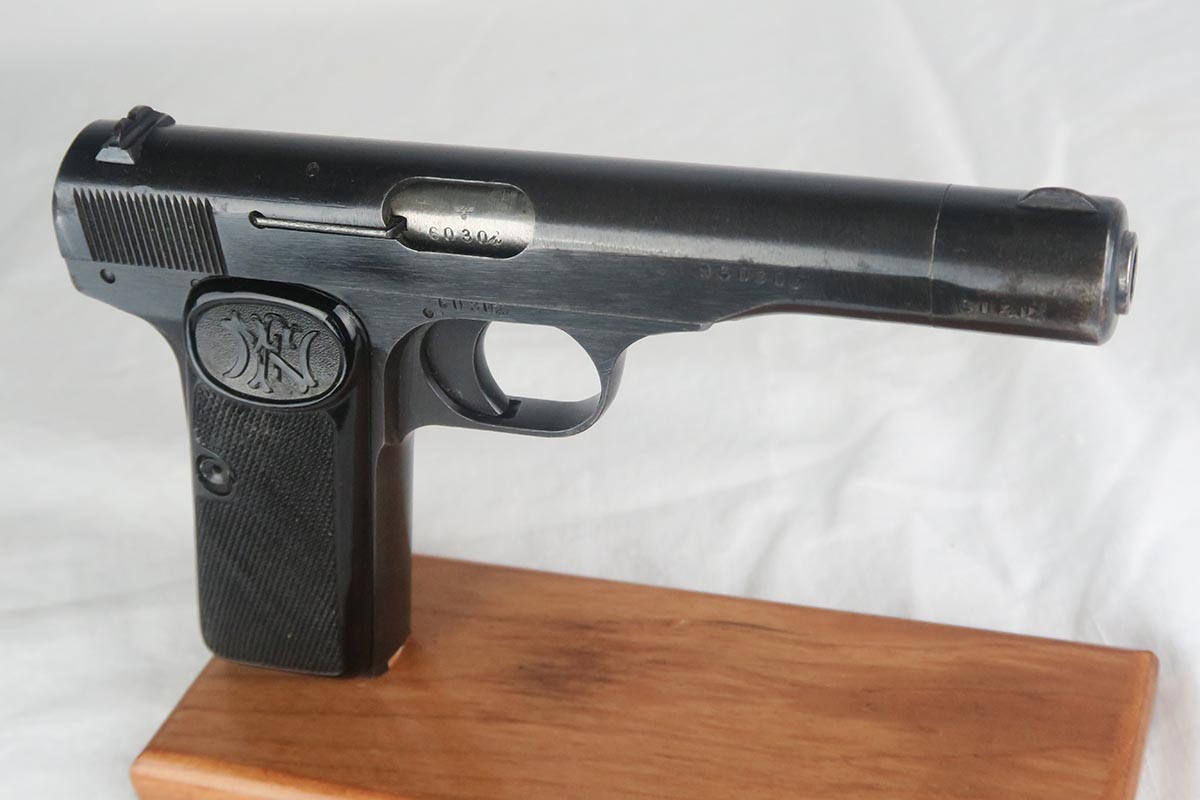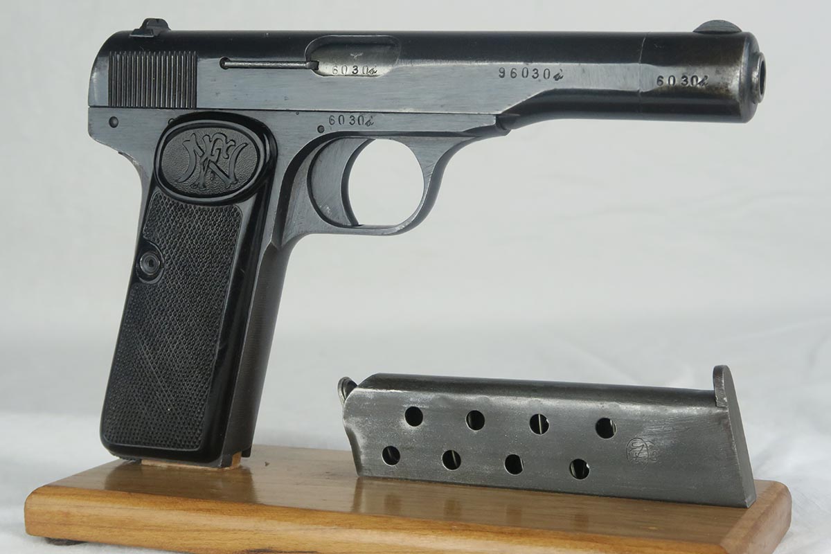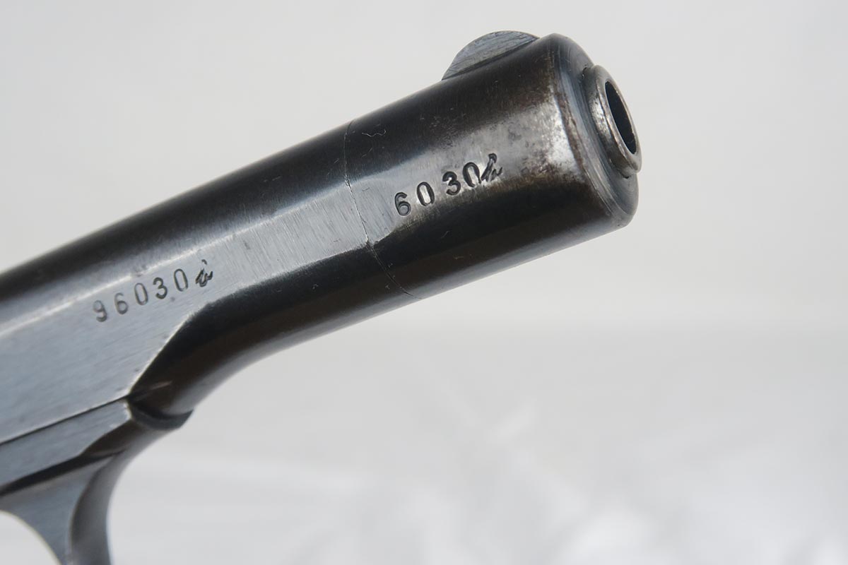 11/29/17 – This is a Nazi Browning M1922 from late in World War 2.  All original and matching with finish in the low 90’s.  The back strap is thin and there is finish loss on both sides of the muzzle.  WaA140 proofed on frame and slide.  Plastic grips are unusual on a 1944 gun but not totally uncommon.  Comes with excellent holster which looks German made and period correct but not positive.  Pistol bore is excellent.