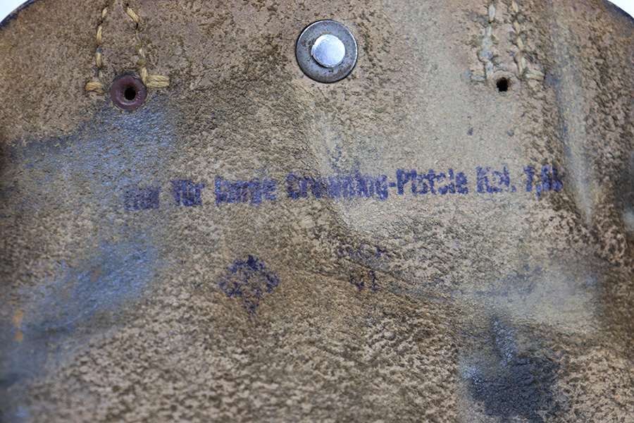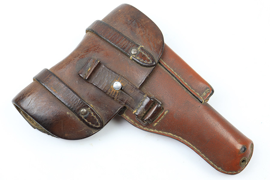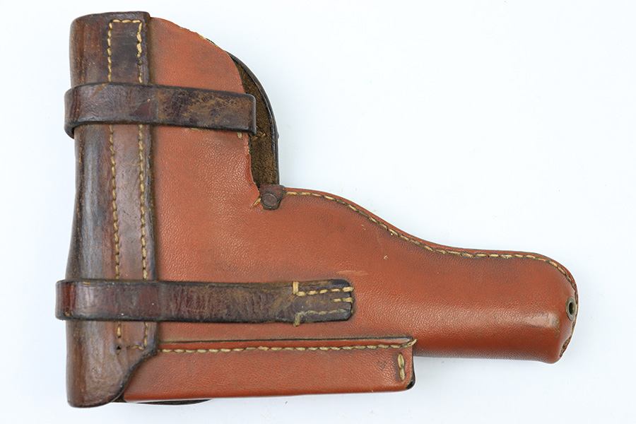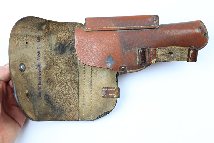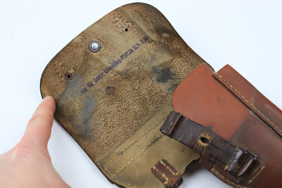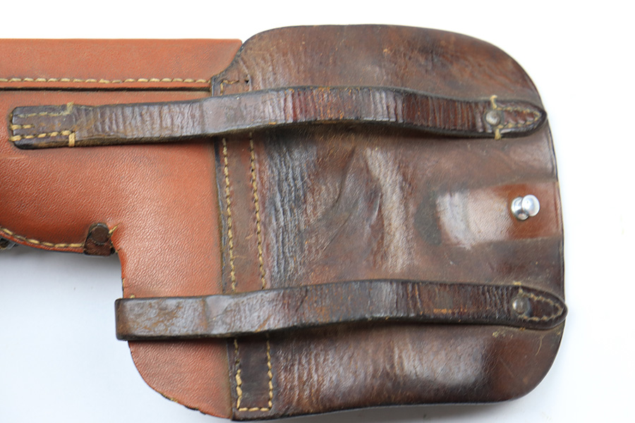 6/23/22 – This is an original FN M1922 holster made during WW2. The holster is made from both Ersatz and leather material. The interior of the leather lid is ink stamped for FN Browning 7.65mm pistol, and has a faint “hck 41” maker and date stamp. The rough outline of the waffen eagle proof stamp is still barely visible as well. The holster has typical aging and use wear without any excessive damage. No notable stitching issues.