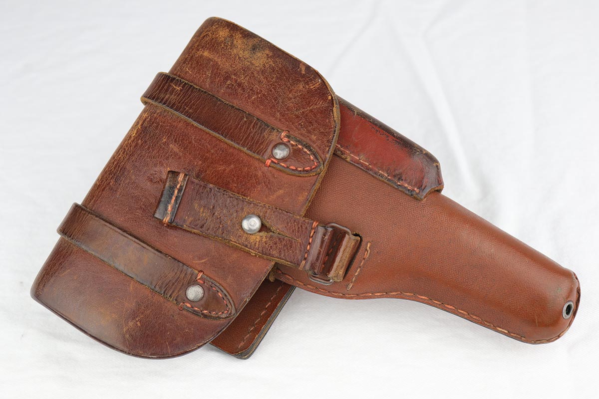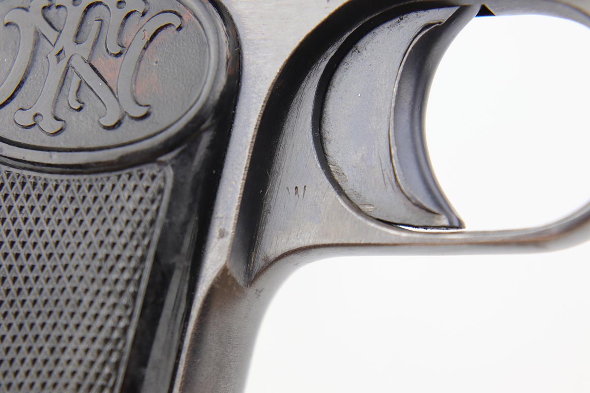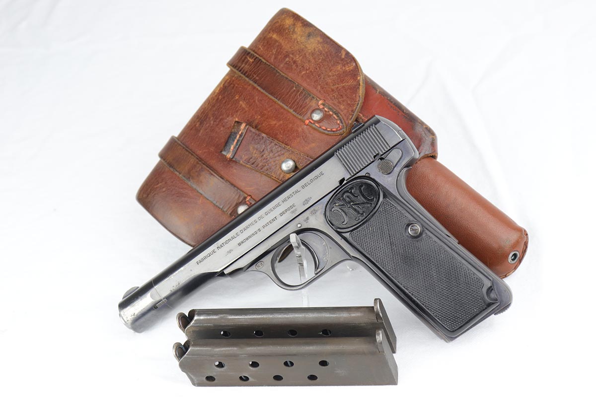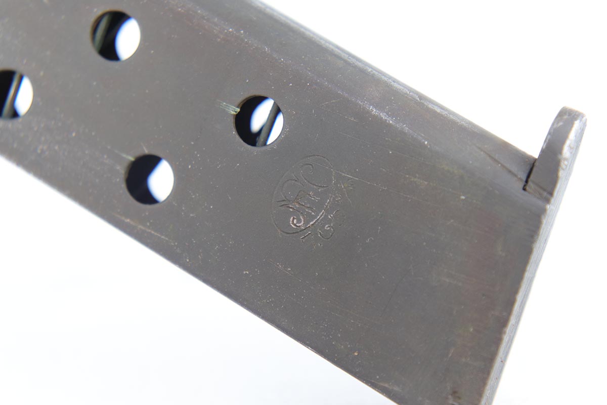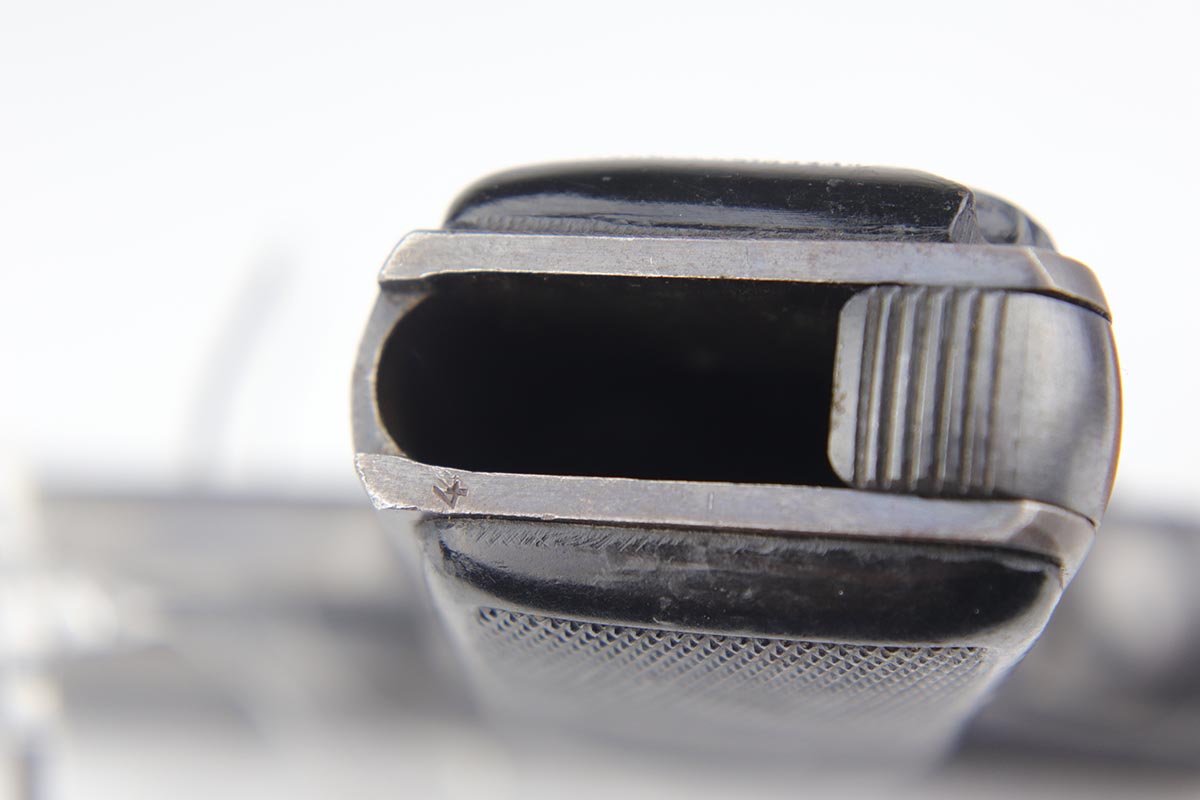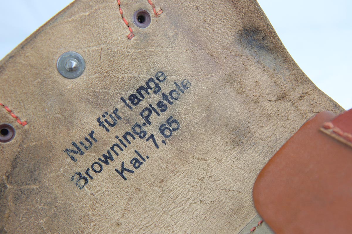 12/20/18 – This is a complete, “as issued” early FN 1922 rig that comes with two original magazines and a scarce Krieghoff marked and Luftwaffe Eagle/2 proofed holster. The gun is all original with no import markings. It retains around 95% of its original blue with majority of finish loss on either side of the muzzle, which is super common due to the holster shape for these pistols. Also has some light toning of the grip straps as per pictures. The bore and the grips are excellent as well. All numbers match. The holster is a rarely seen late war variation, made with pressed paper body and a leather flap. Great Krieghoff Anchor marking on the belt loop and a luftwaffe Eagle/2 on the flap. Sharp markings inside the flap as well. The gun has desirable early WaA103 waffenamts.