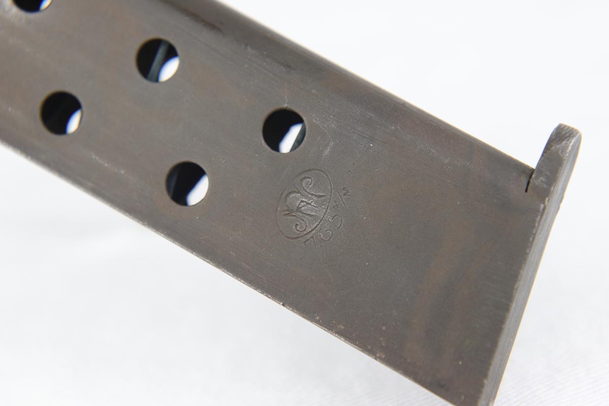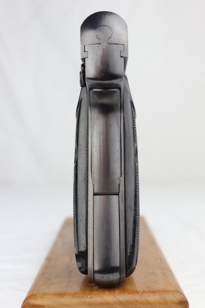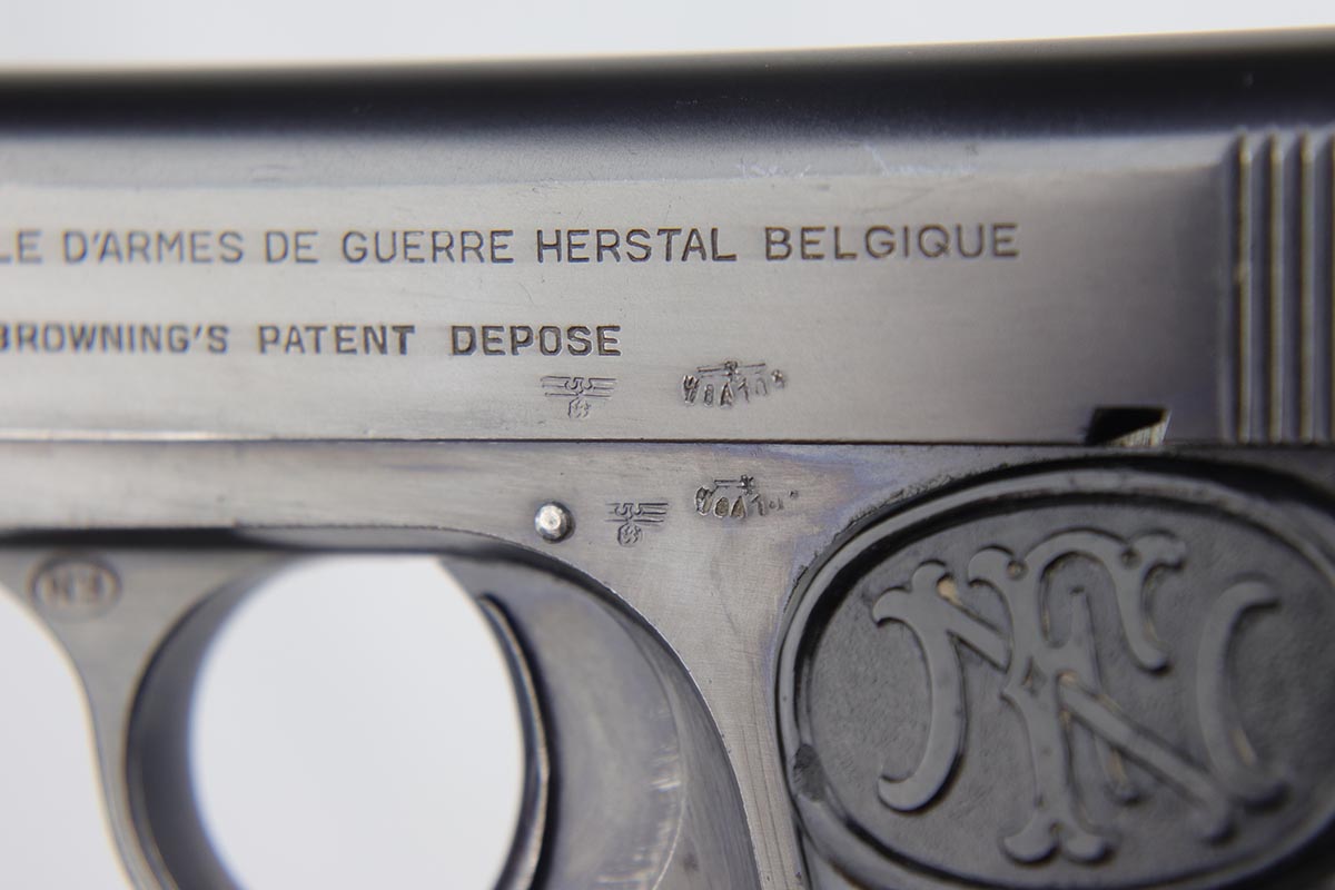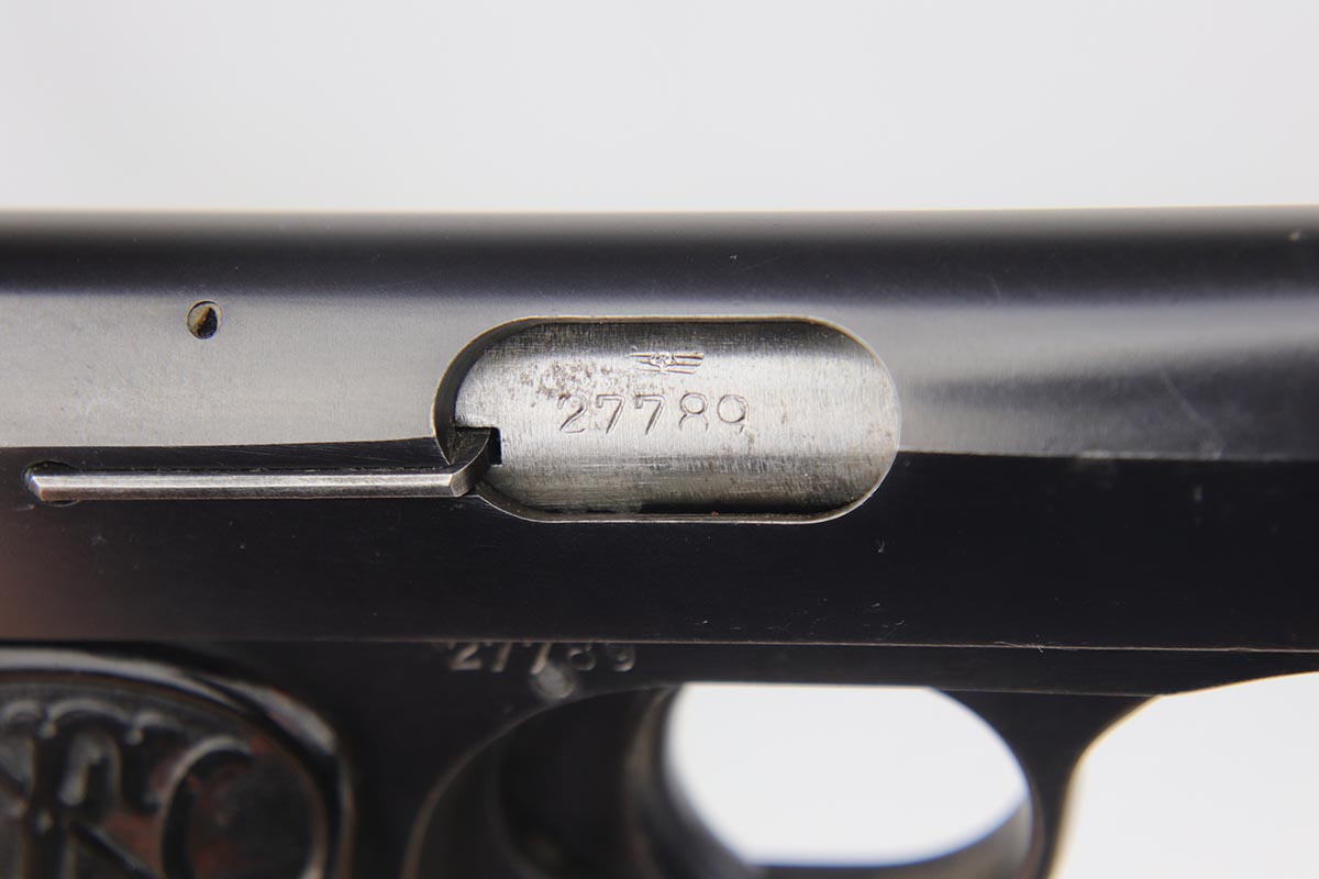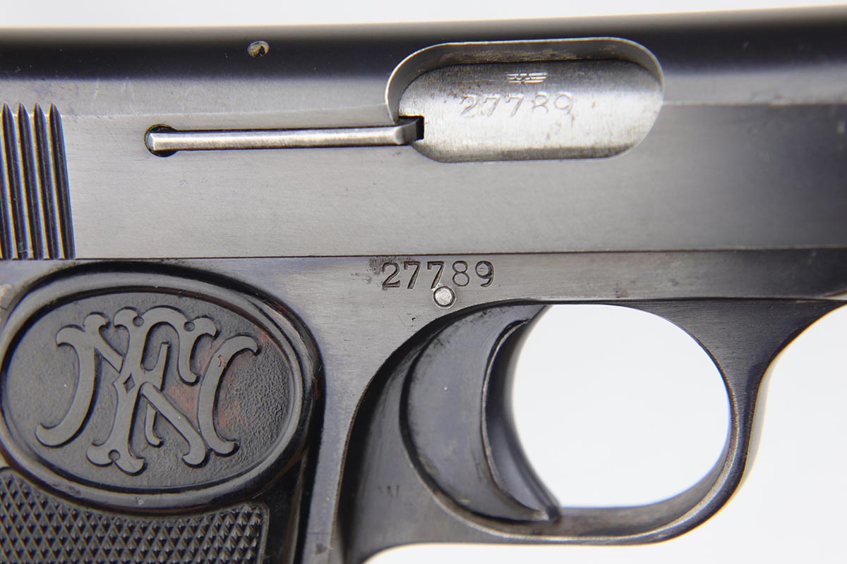 12/20/18 – This is a complete, “as issued” early FN 1922 rig that comes with two original magazines and a scarce Krieghoff marked and Luftwaffe Eagle/2 proofed holster. The gun is all original with no import markings. It retains around 95% of its original blue with majority of finish loss on either side of the muzzle, which is super common due to the holster shape for these pistols. Also has some light toning of the grip straps as per pictures. The bore and the grips are excellent as well. All numbers match. The holster is a rarely seen late war variation, made with pressed paper body and a leather flap. Great Krieghoff Anchor marking on the belt loop and a luftwaffe Eagle/2 on the flap. Sharp markings inside the flap as well. The gun has desirable early WaA103 waffenamts.