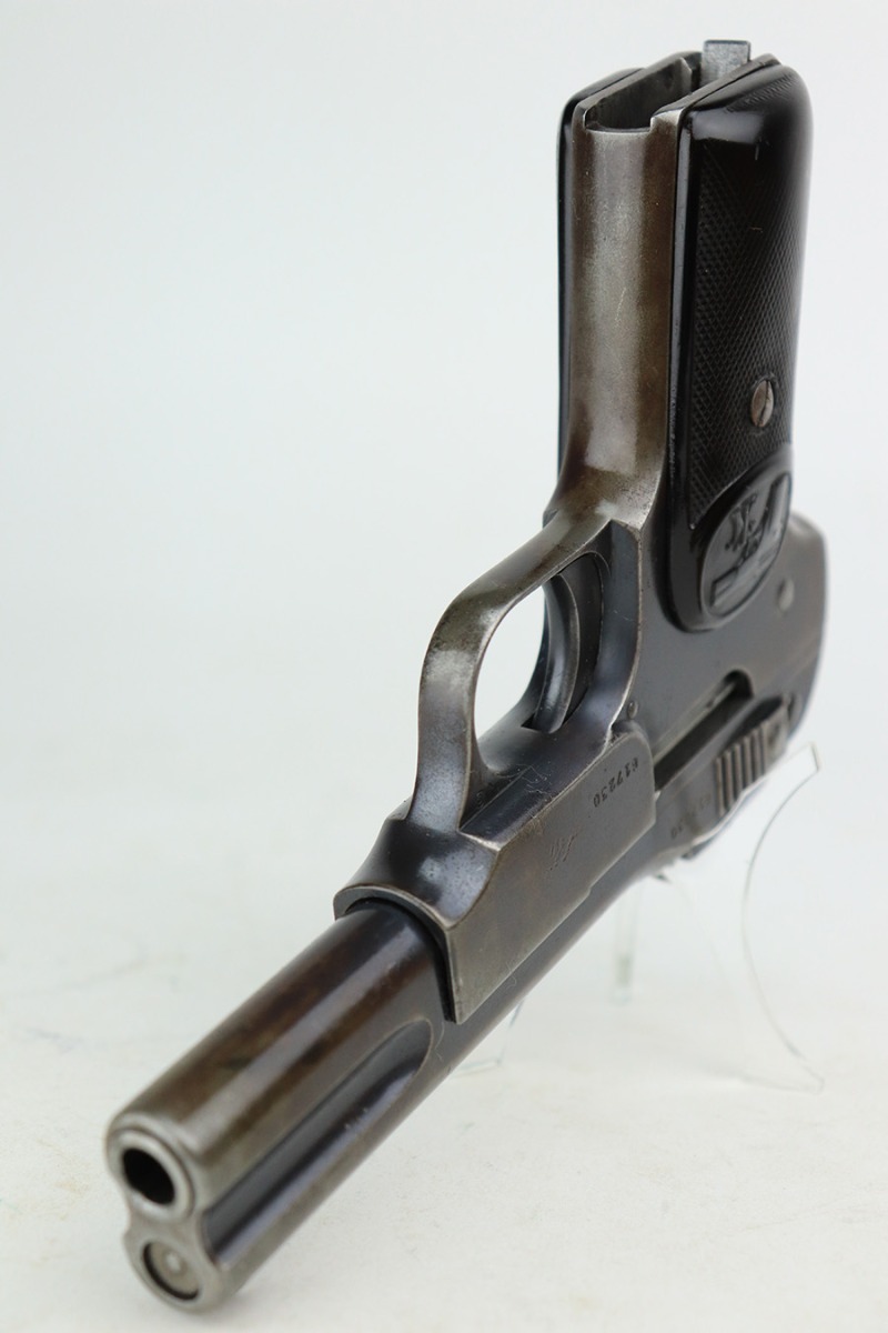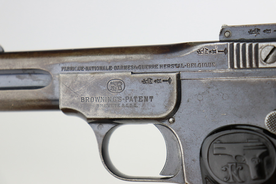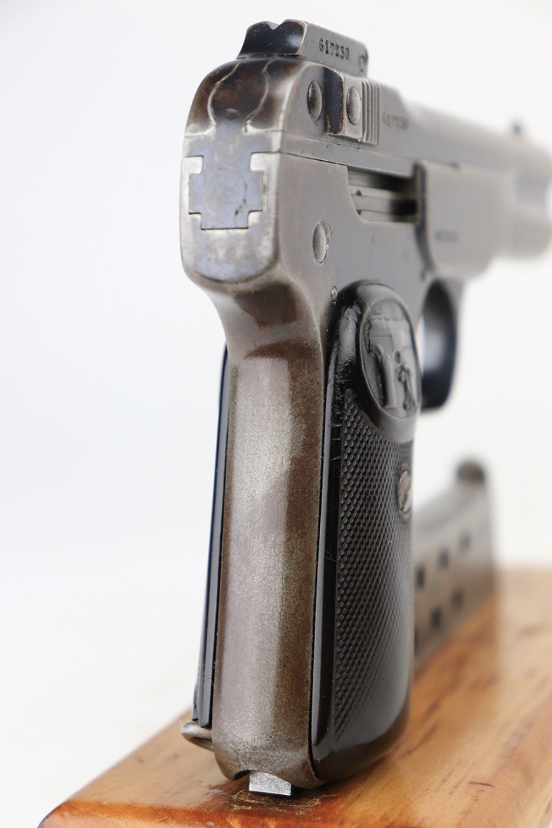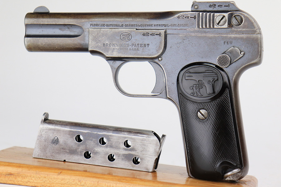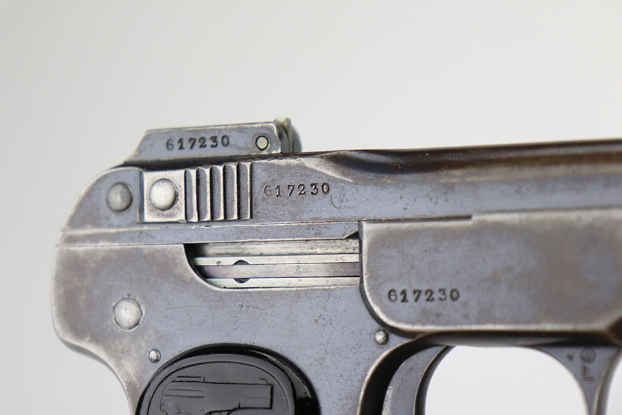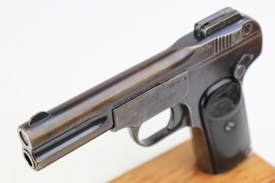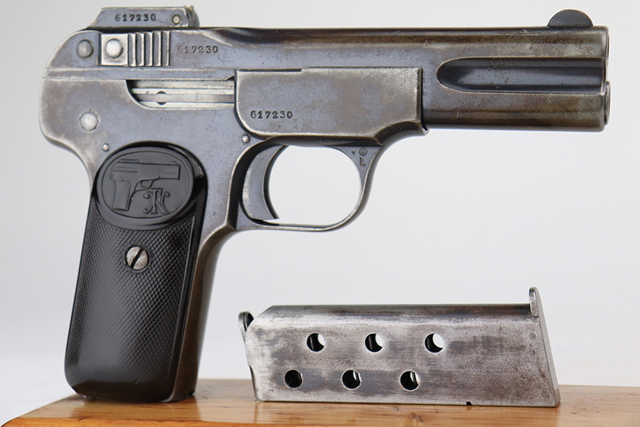 8/26/22 – This is a nice example of an FN Browning Model 1900 manufactured in the early 1900’s. The gun is all matching and has the proper Belgian proofs throughout. It has retained roughly 65% of its original finish. The majority of the finish loss is on both grip straps and on the front half of the slide. Spotty brown patina throughout, and some areas of minor pin-pricking here and there. Comes with fairly worn period-correct black bakelite grips and one proper magazine. The bore has good rifling with very minor pin-pricking throughout.