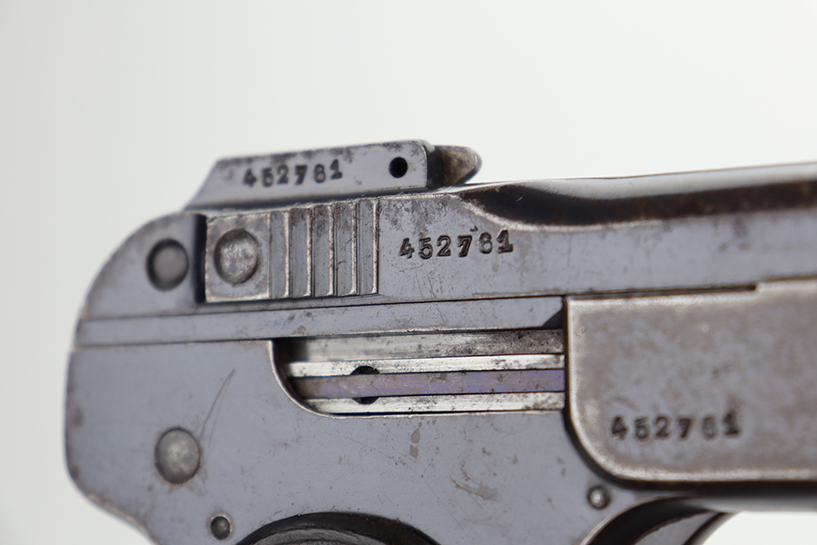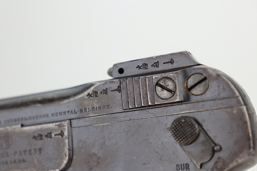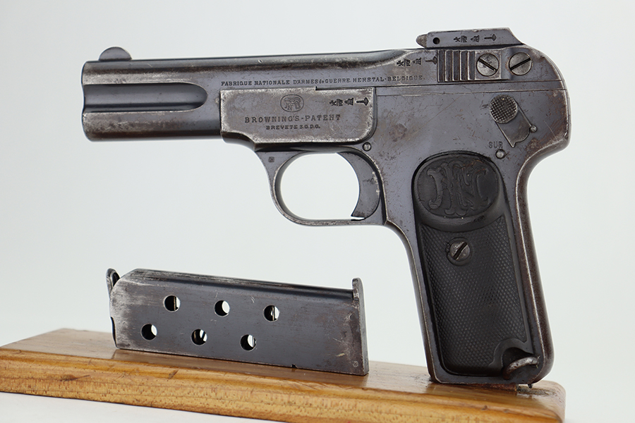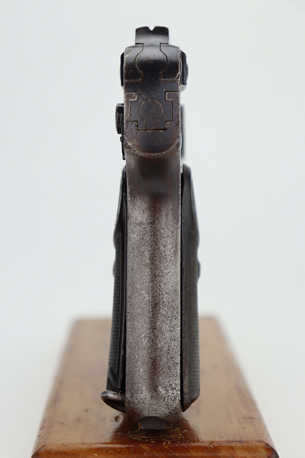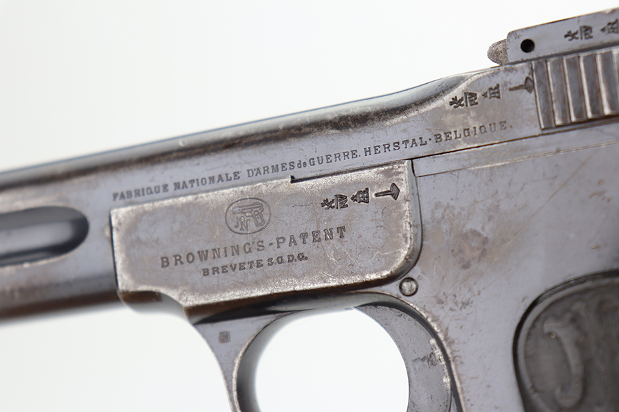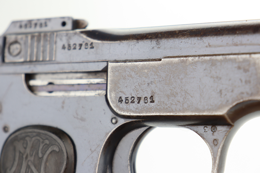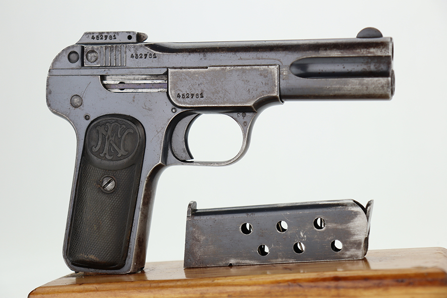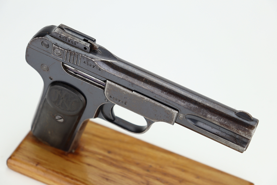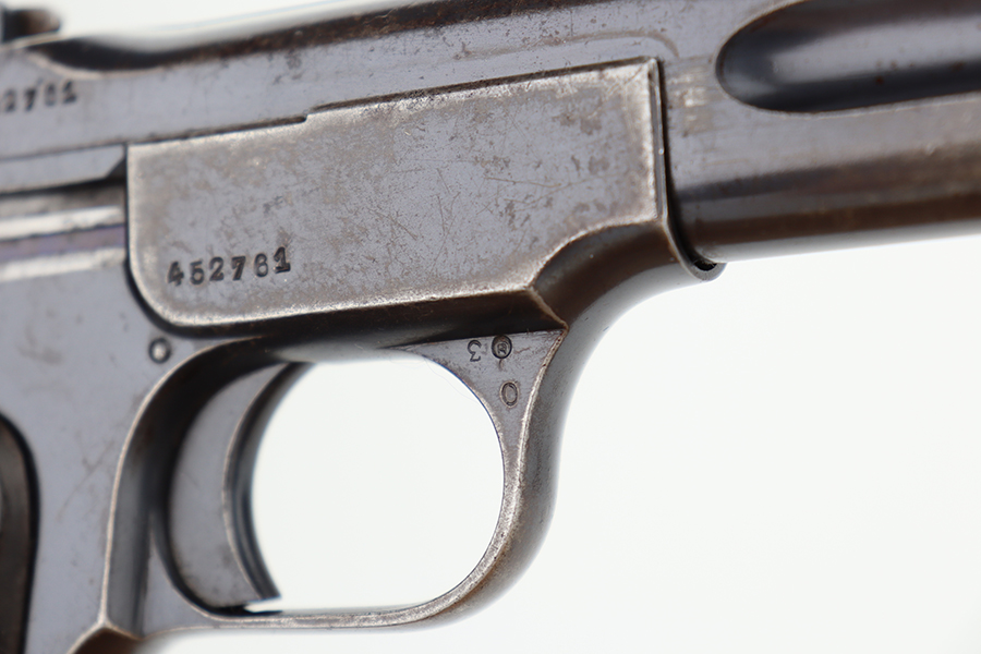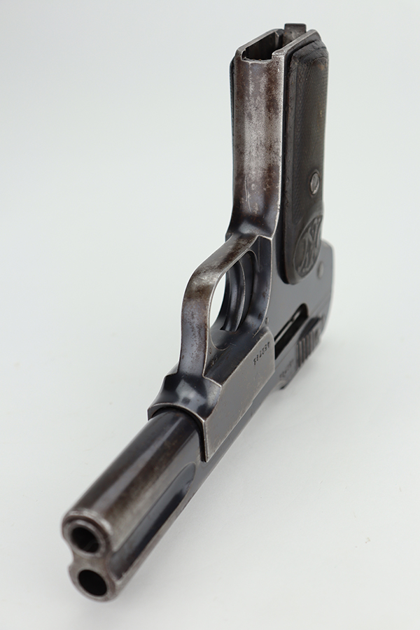 6/20/24 – This is a nice example of an FN Browning Model 1900 manufactured in the early 1900’s. It is all matching and has the proper Belgian proofs throughout. The gun’s original finish rates roughly 75-80%. The majority of the finish loss is on the grip straps, but there is obvious spotty wear and spotty patina throughout. Fitted with period-correct horn grips. The bore has good rifling, but there is light pin-pricking throughout.