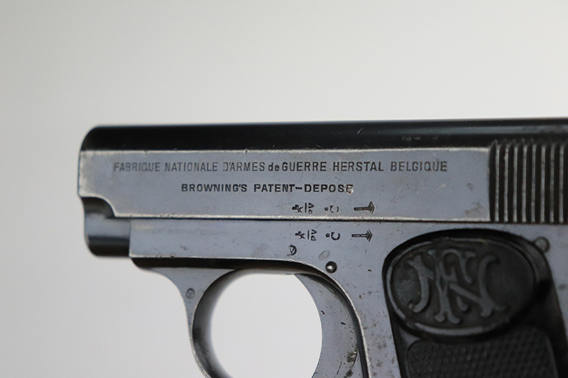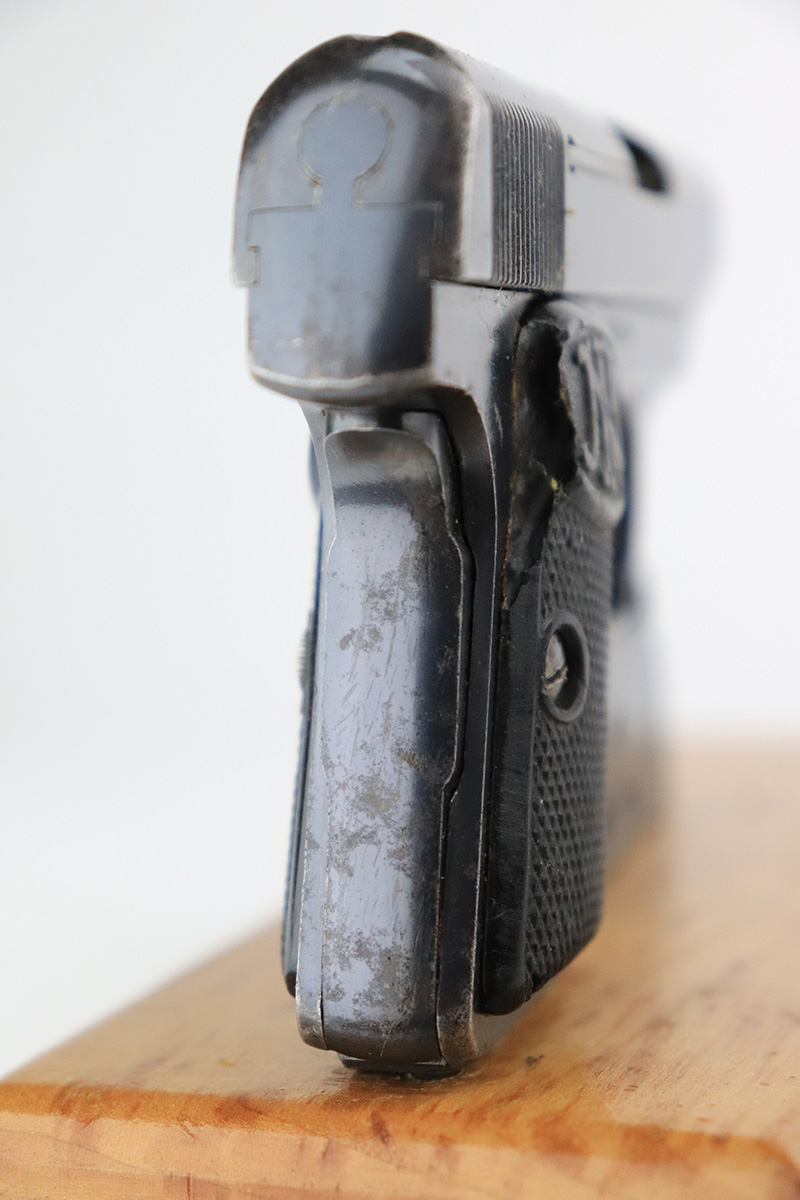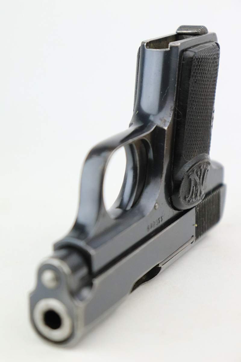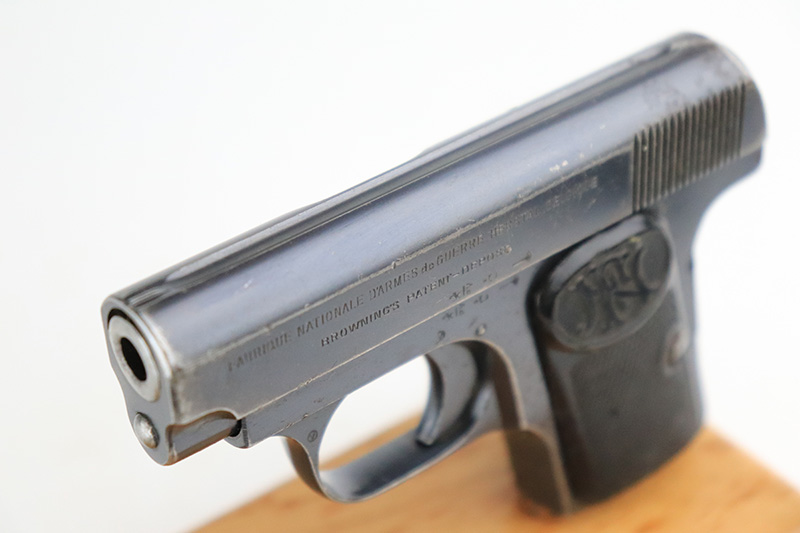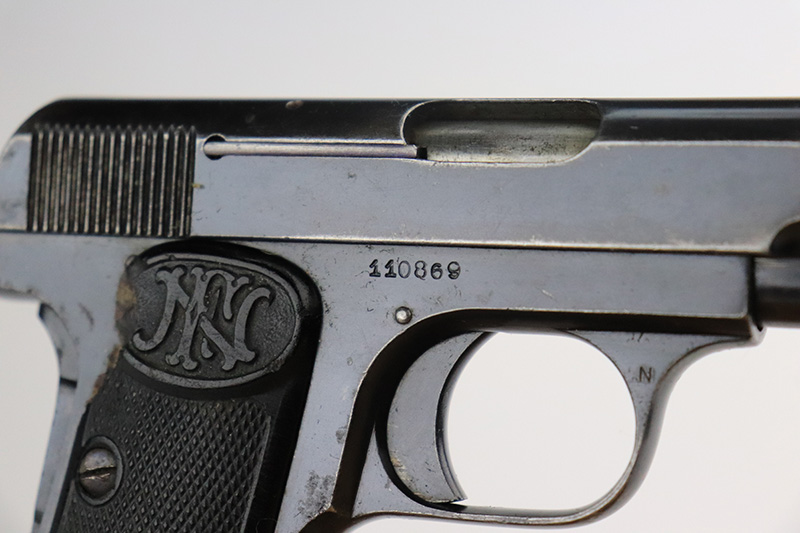 8/25/22 – This is a nice example of an FN Browning Model 1905 most likely manufactured in the 1930’s. The gun is all matching and has the proper Belgian proofs. It has retained about 90-92% of its original bluing. There is minor wear around the muzzle and along both sides of the slide, concentrated around the high edges. Some tiny scratches along both sides of the slide. Some spotty oxidation here and there on the frame, most noticeable on the rear grip strap. Comes with period-correct black bakelite grips – some tiny dings on the left side and a noticeable chip on the right side. Also comes with one proper magazine. The rifling in the bore is fairly worn with spotty oxidation throughout.