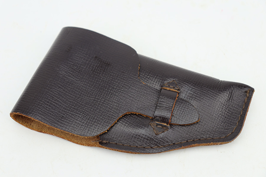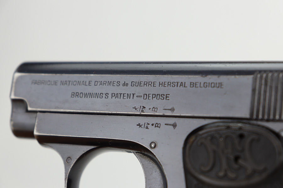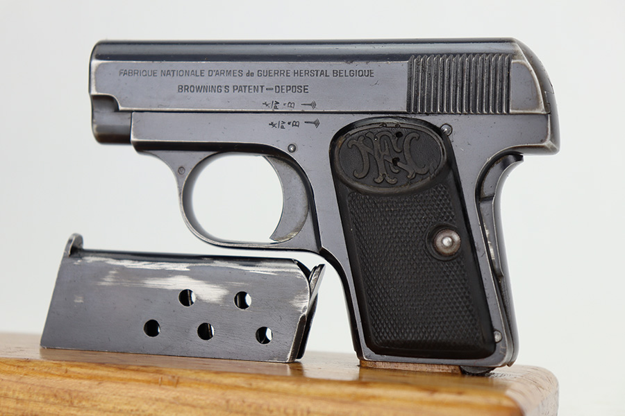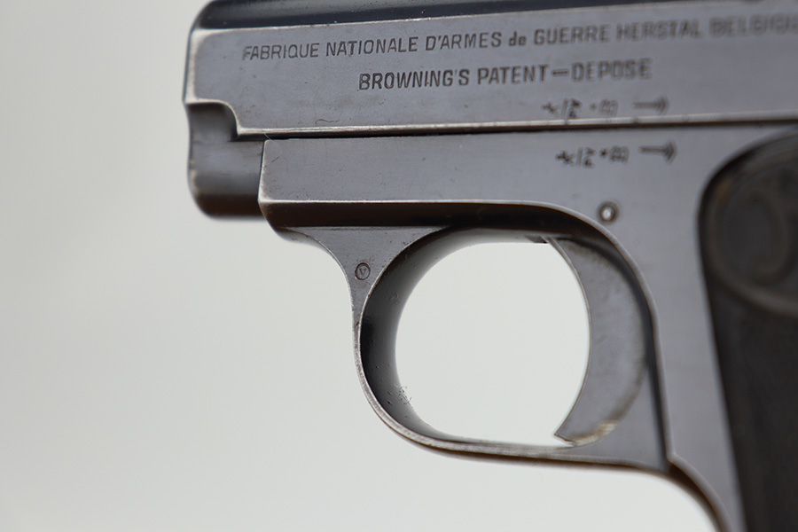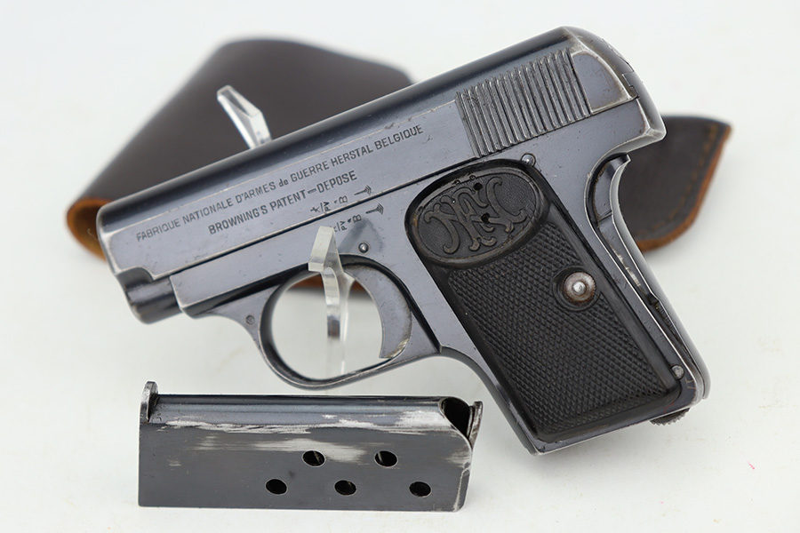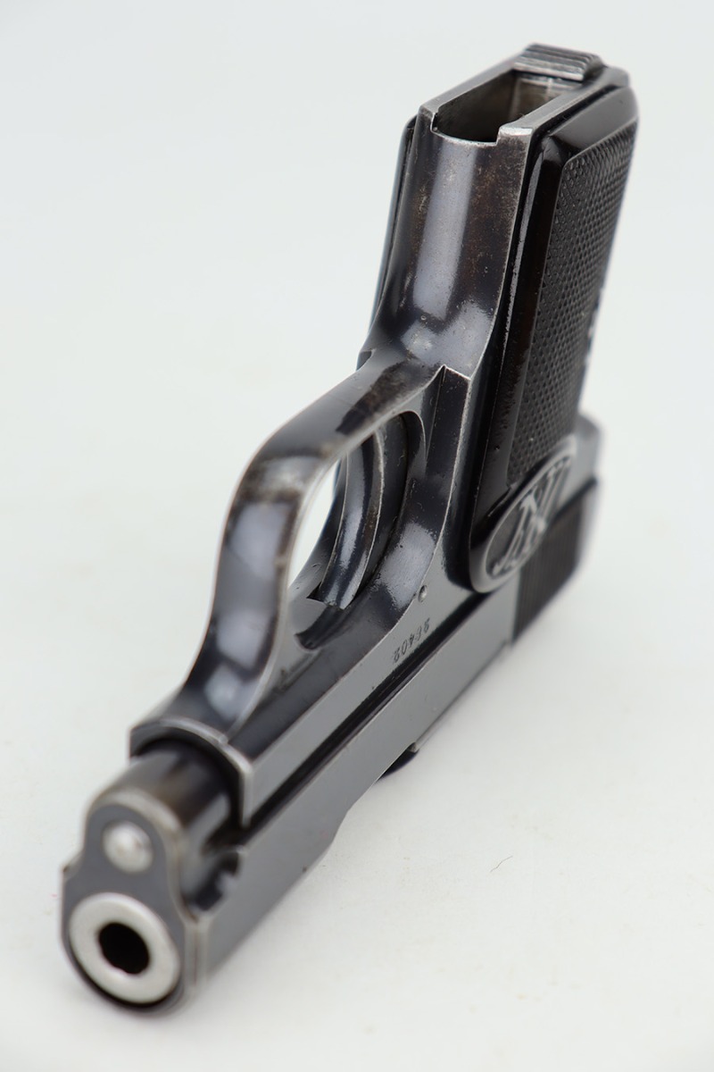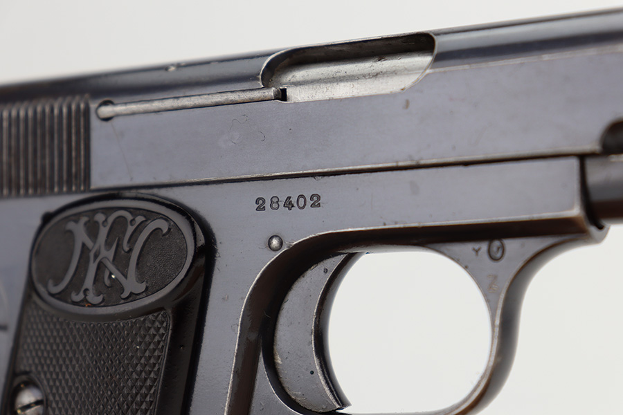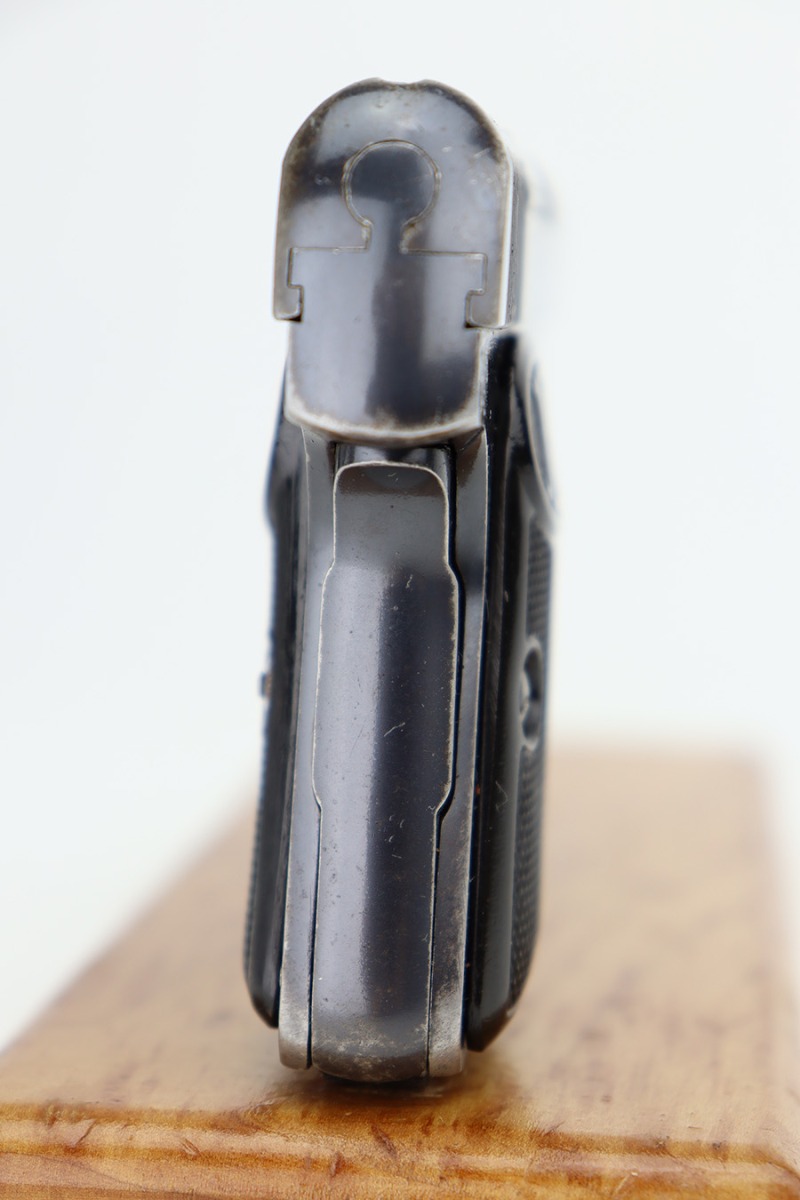 3/5/24 – This is a very nice example of an FN Browning Model 1905 most likely manufactured in the 1930’s. The gun is all matching and has the proper Belgian proofs. Comes as a rig with a nice leather holster and one magazine. The gun has retained about 93% of its original bluing with general high edge wear and some mild wear on the front strap. It has a horn grip (left side) and a black plastic grip (right side). The horn grip has a couple of small bore holes. Excellent bore with strong rifling.