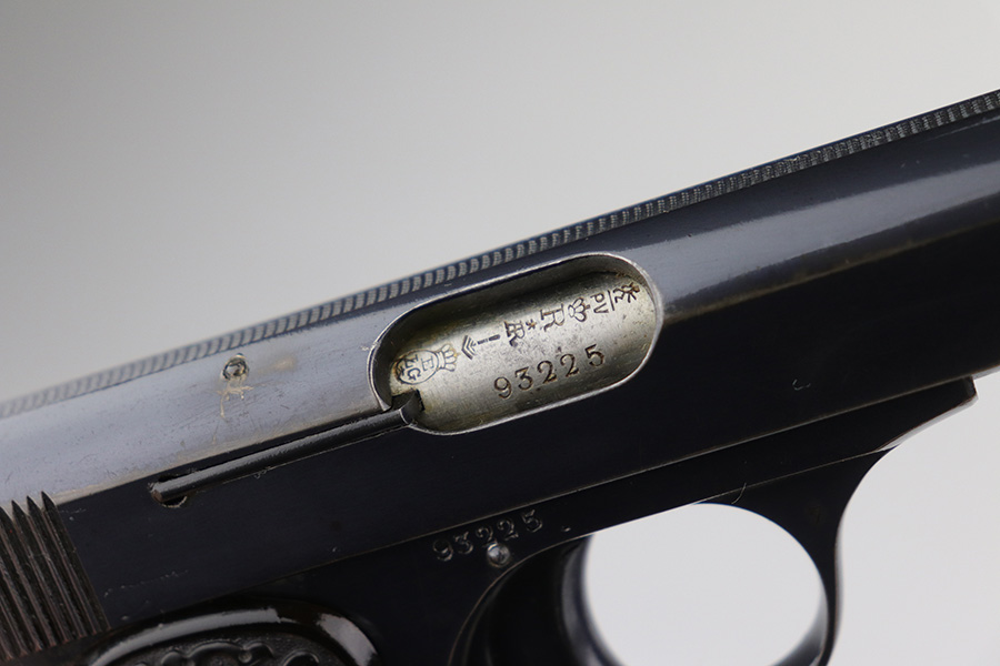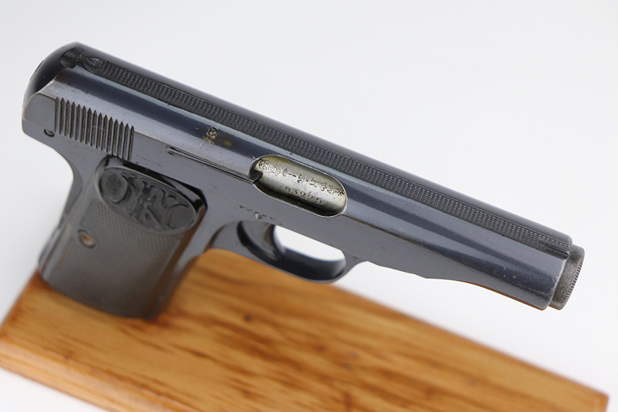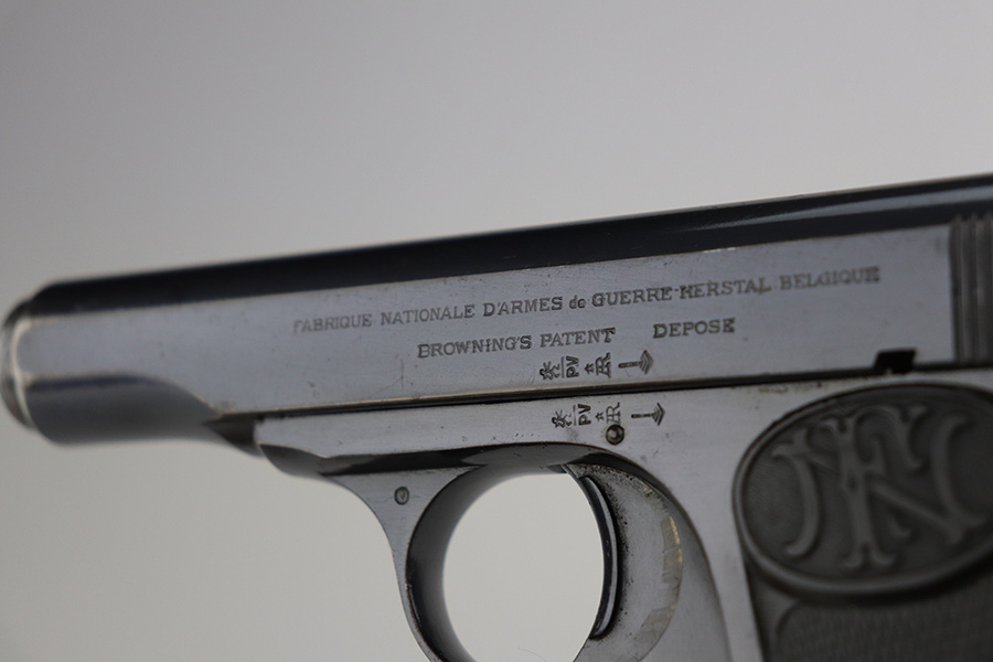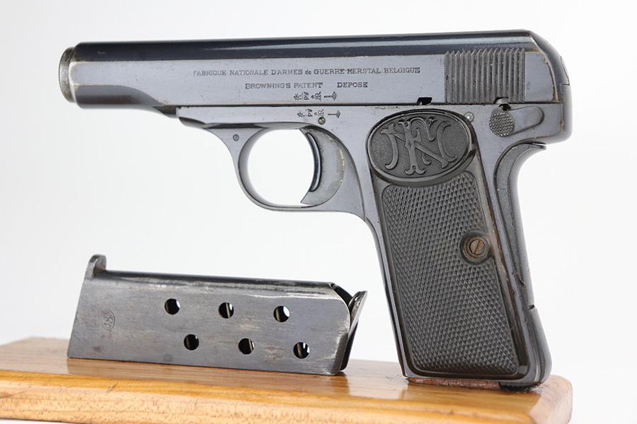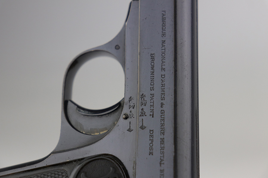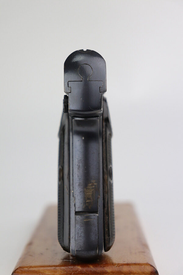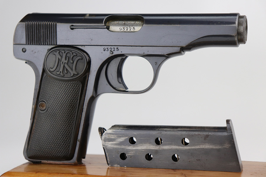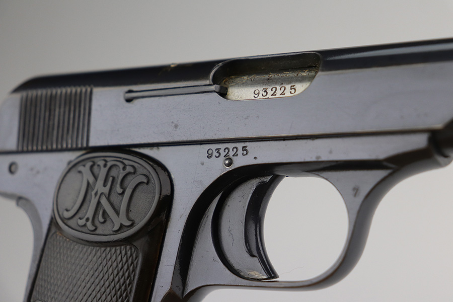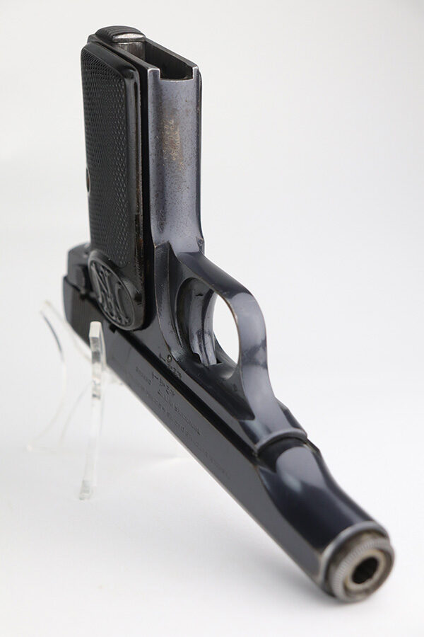 2/9/22 – This is a very example of an FN Browning Model 1910, chambered in 7.65mm. It is all matching and has proper Belgian proofs. It has retained about 93% of its original finish. There is very minor wear around the high edges of the slide and around the muzzle. There are areas of scratchy wear and handling marks on both straps. Spotty oxidation on both straps as well. The barrel spur on the interior of the barrel has been sheered off, but this does not cause any mechanical issues as far as we are aware. Comes with excellent black bakelite grips and a proper magazine. The bore is mint.