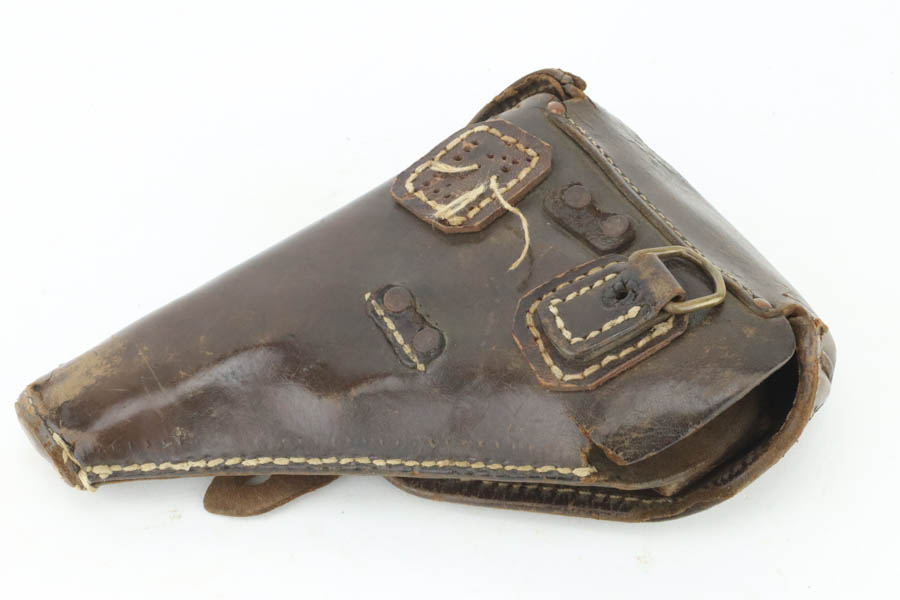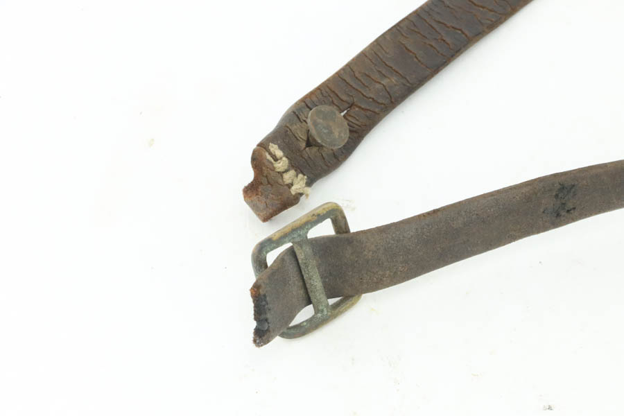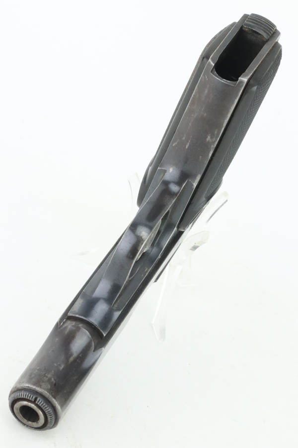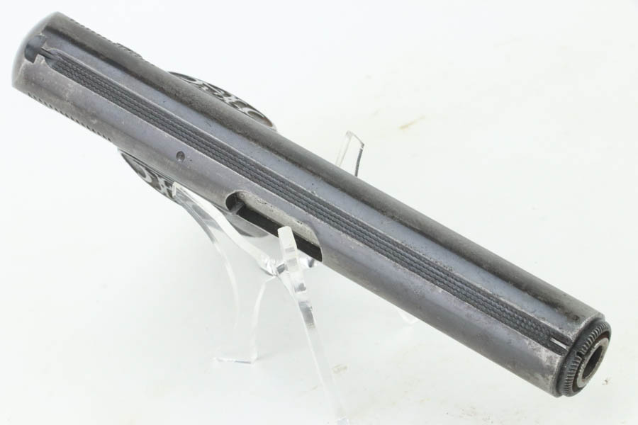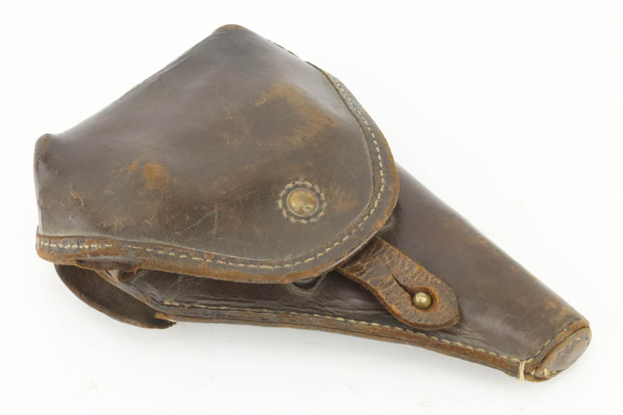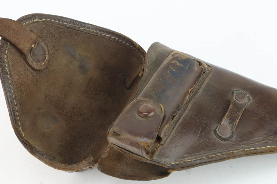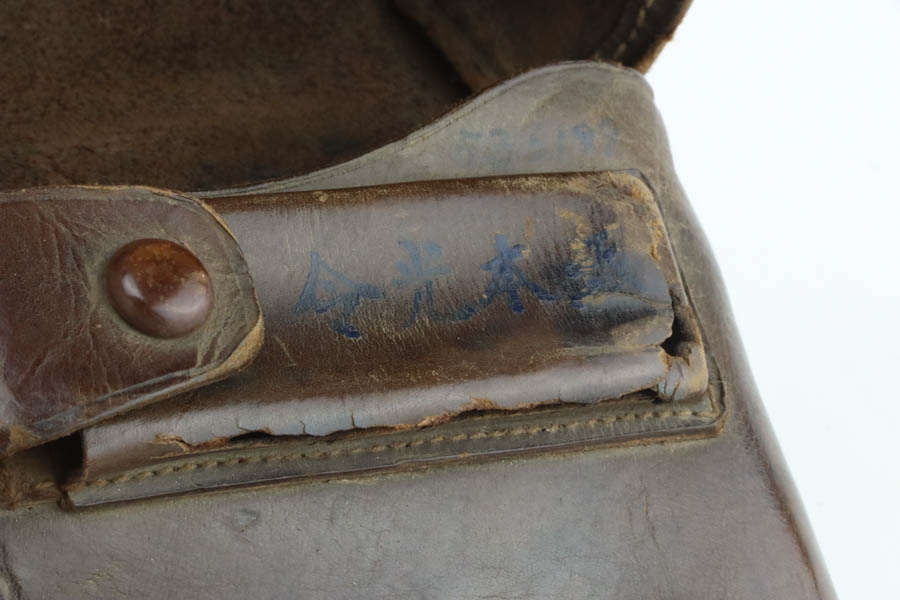 8/9/24 – This is a nice example of an FN Browning Model 1910 manufactured in the early 1900’s. It is all matching and has the proper Belgian proofs throughout. This one may have been shipped to Japan, because it is around the proper serial range of other known Japanese contract guns. This one has no kanji markings, so we cannot say for sure. It comes as a rig with a rare Japanese shoulder holster (kanji markings on the inside), leather shoulder strap, and two period-correct magazines. The magazine pouch of the holster has some holes in it, and one of the D loops on the back is missing. The leather of the shoulder strap is dry and cracked throughout. The gun itself has retained roughly 85% of its original finish. The majority of the wear is concentrated around the high edges of the slide. Some very light pin-pricking along the left side of the slide as well. Fitted with black bakelite grips. Very nice bore with good rifling.
