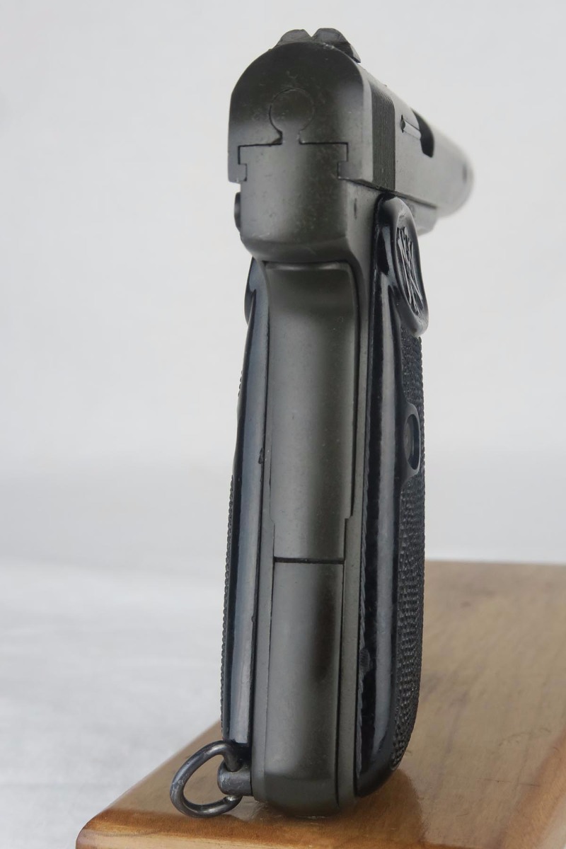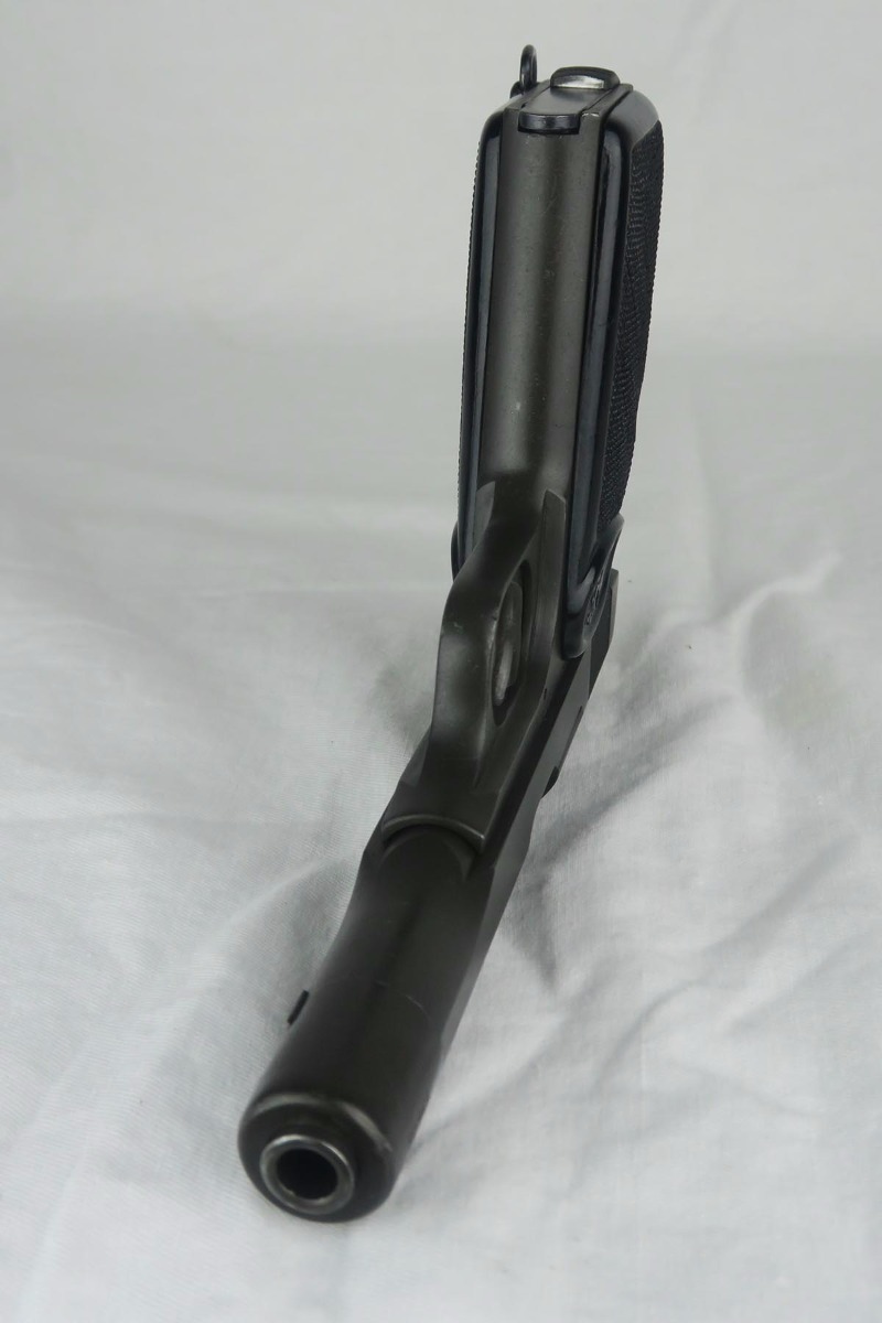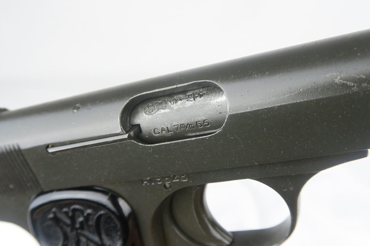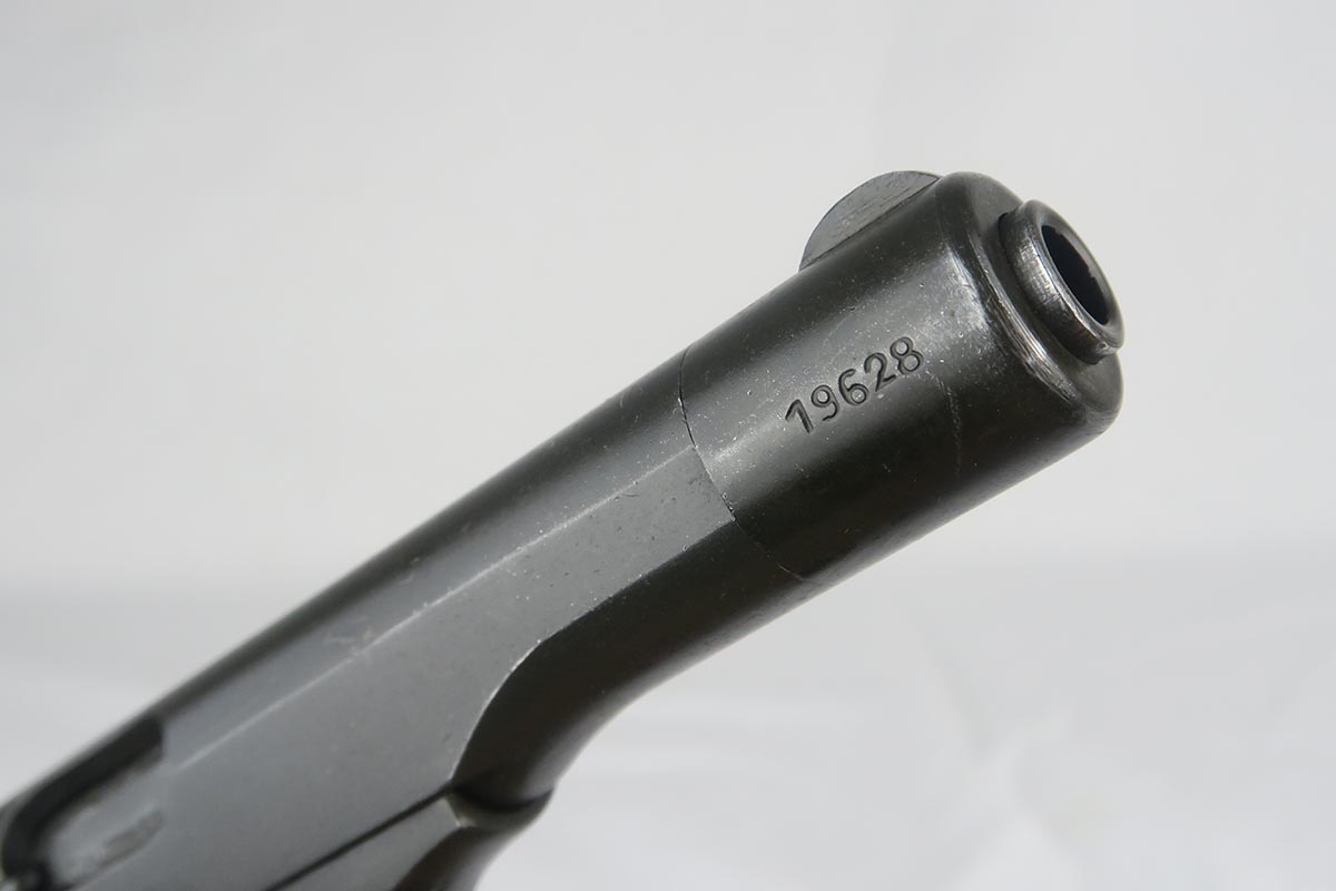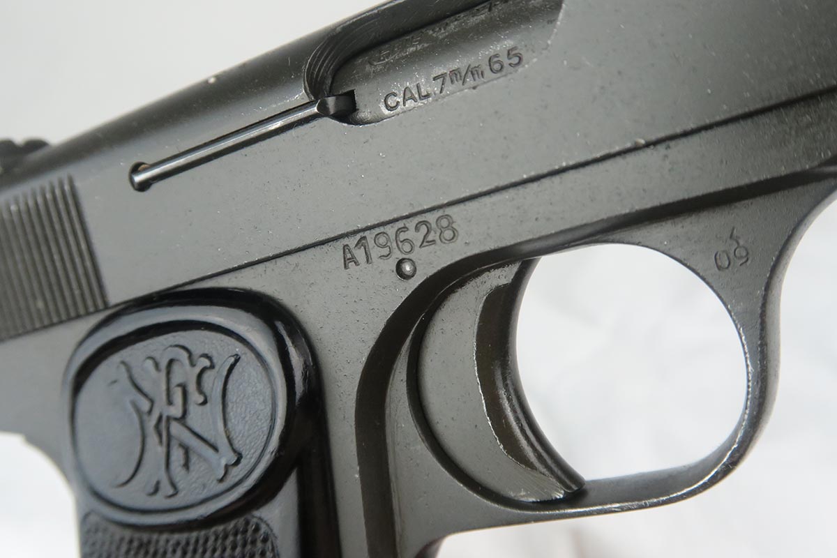 11/29/17 – This is an interesting FN Browning Model 1922, with the A-prefix S/N. This was assembled shortly after Belgium was liberated, using left-over parts. The frame, slide and barrel have Belgian proofs, and no German proofs are present. Note that the trigger is the older style, and the frame has a lanyard ring. My guess is that this was for a French contract. It has a rough parkerized finish similar to French Navy FN 1922’s which may be a clue… or maybe not.   Overall condition is at least 98% (or better), with a couple of small scratches on the nose cap, some very light edge-wear at the muzzle and rear of slide. The bore is excellent and shiny. The internals, including barrel exterior, show very little wear; the slide rails and contacts are almost pristine. The magazine is blued and in very nice condition as well, and marked “-FN- 7.65mm” on the side.   The grips are black plastic and in excellent condition. Note that the screw inserts appear to be parkerized, and the grip screw also looks parkerized.