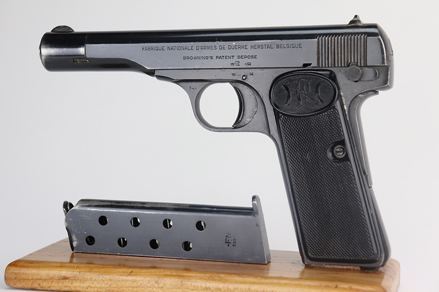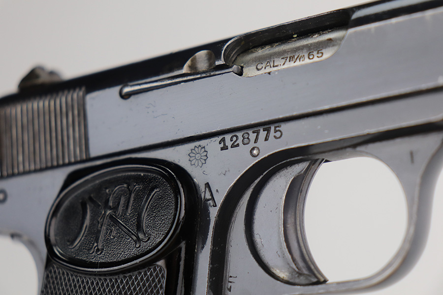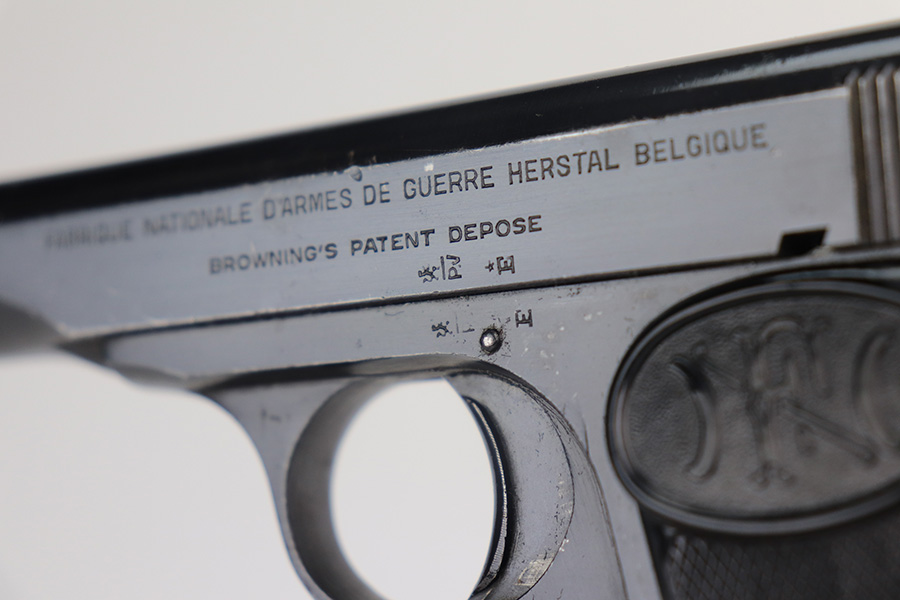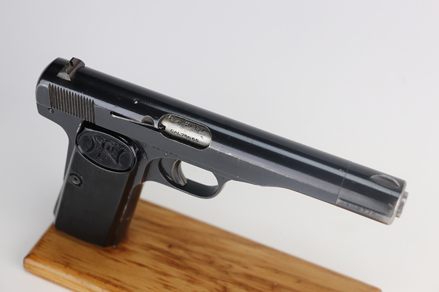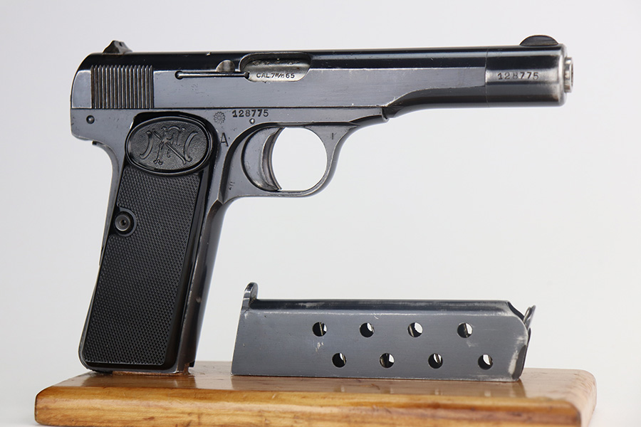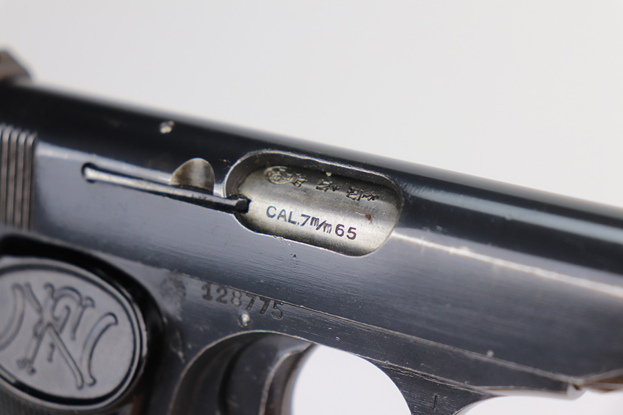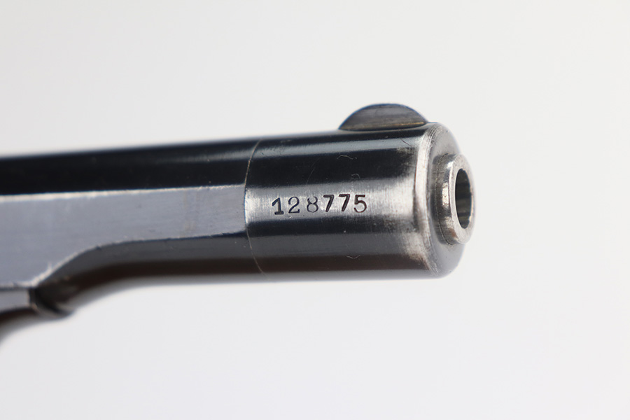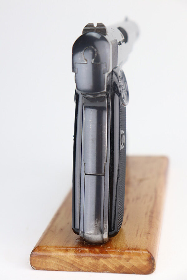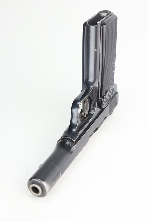 5/25/21 – This is a very nice FN Browning Model 1922 that was issued to the Berlin police force immediately after WW2. The gun is all matching and has the proper “A” and “Berlin mum” proofs. It has retained about 94% of its original bluing. There is minor wear around the muzzle and high edges of the slide. A few small spots of wear on the straps. Comes with excellent grips and a correct magazine. Excellent bore – shiny with strong rifling.