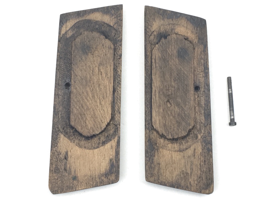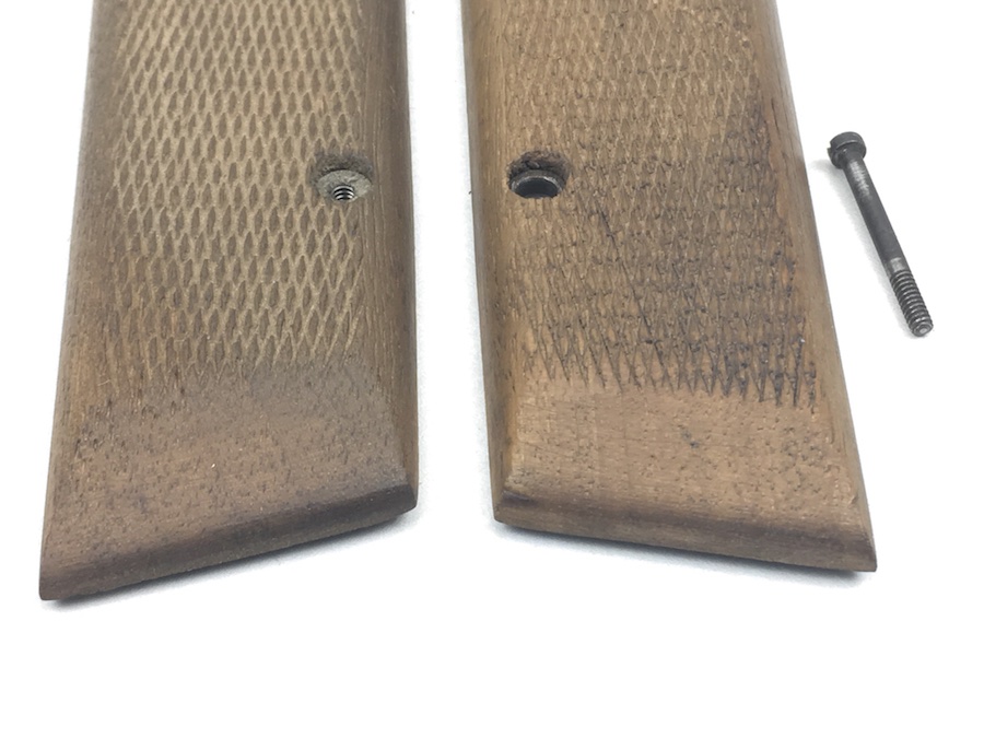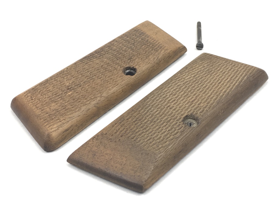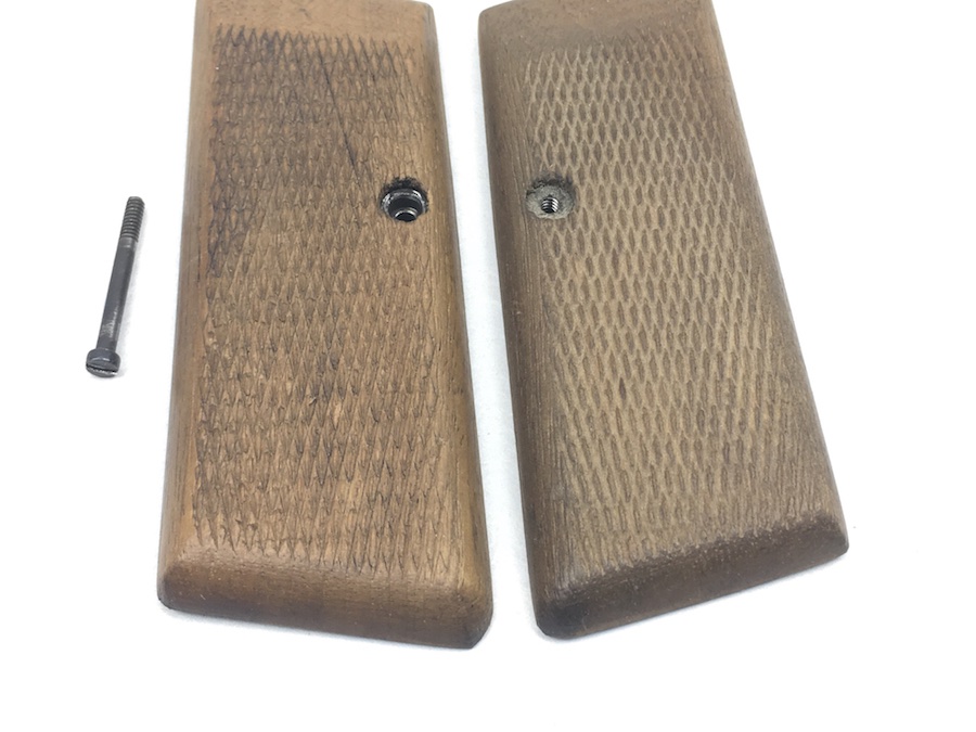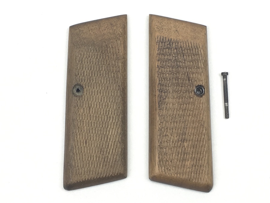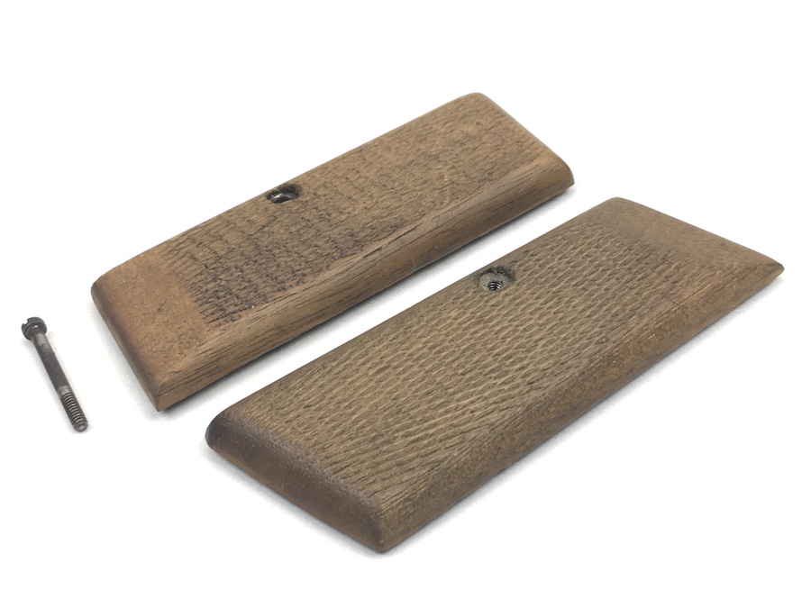 7/11/19 – This is an original pair of wooden FN Browning model 1922 grips & screw. They are completely original from the WW2 era and in excellent condition. There are no cracks or chips in the wood, and the exterior diamond pattern is excellent.