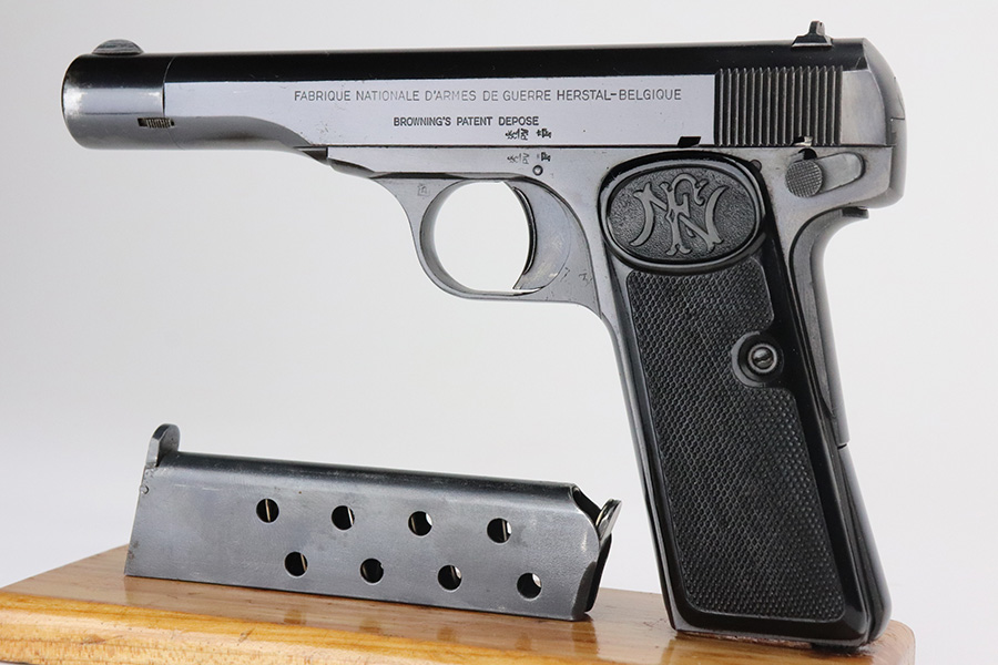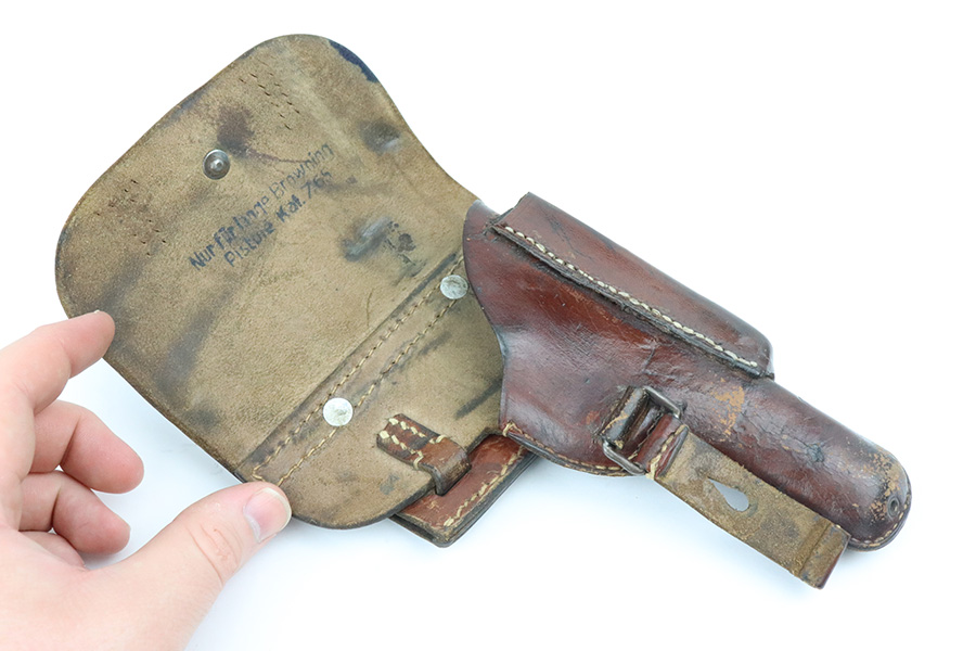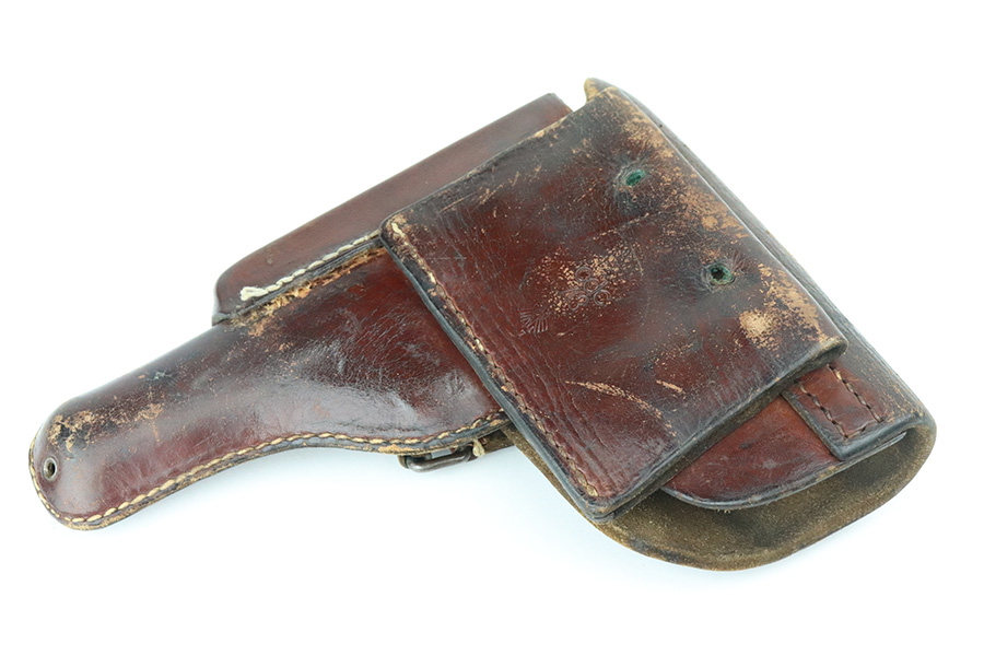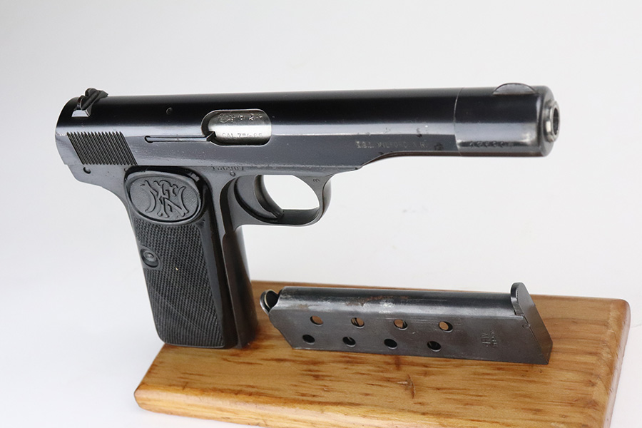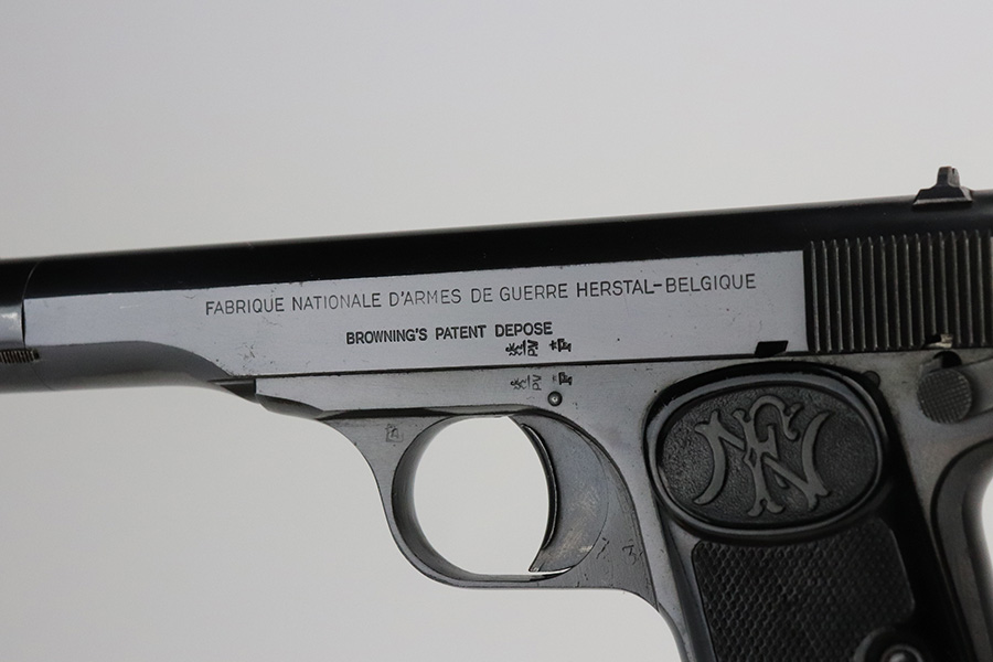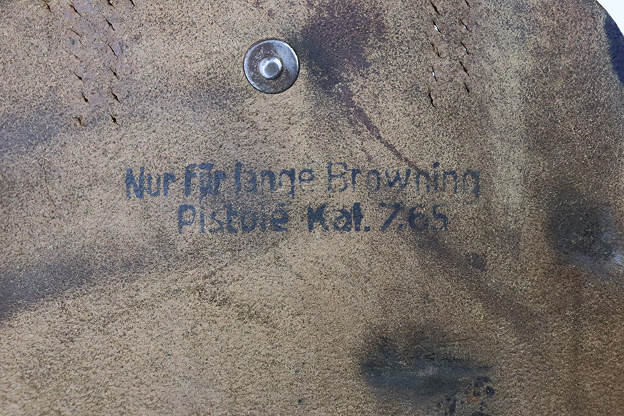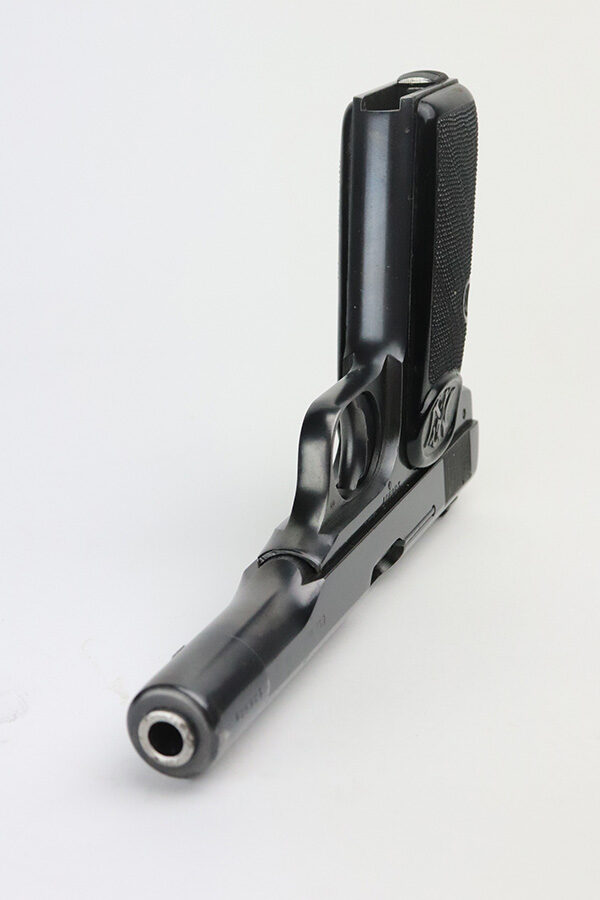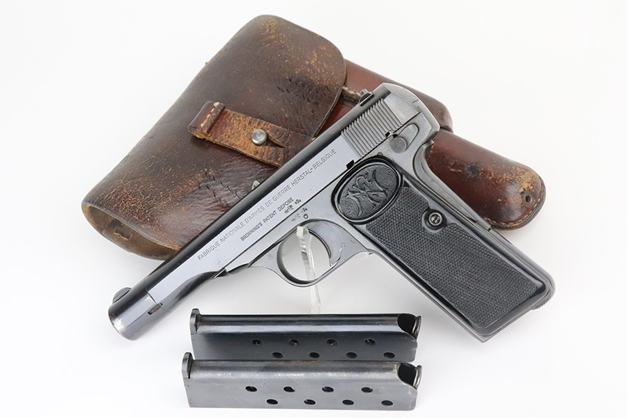 7/30/21 – This is a minty example of a Belgian FN Browning Model 1922 rig, manufactured after WW2. It is all matching, has the proper Belgian proofs, and has an import mark on the right side of the slide. It comes with a 1943-dated waffen-proofed dropping-style holster. The gun has retained about 97-98% of its original finish. There are just hints of wear on the high edges of the slide and around the muzzle. Some very tiny handling marks on the straps. Comes with excellent black bakelite grips and two proper magazines. Mint bore.