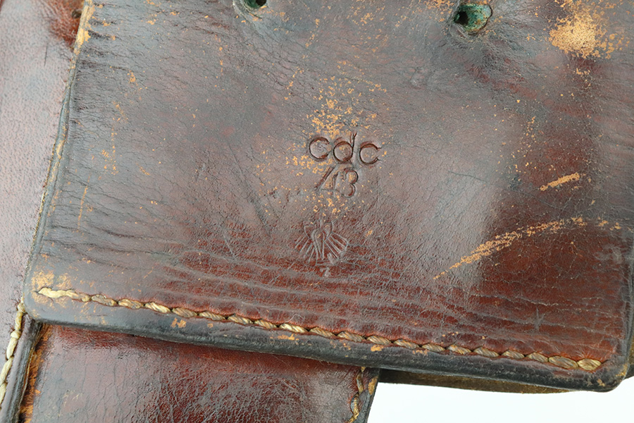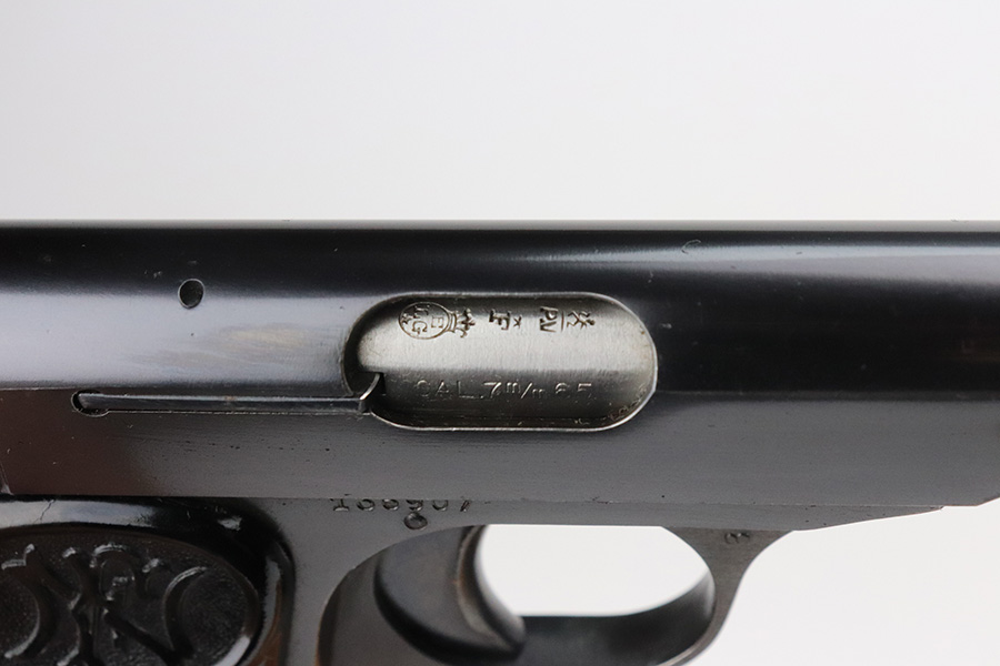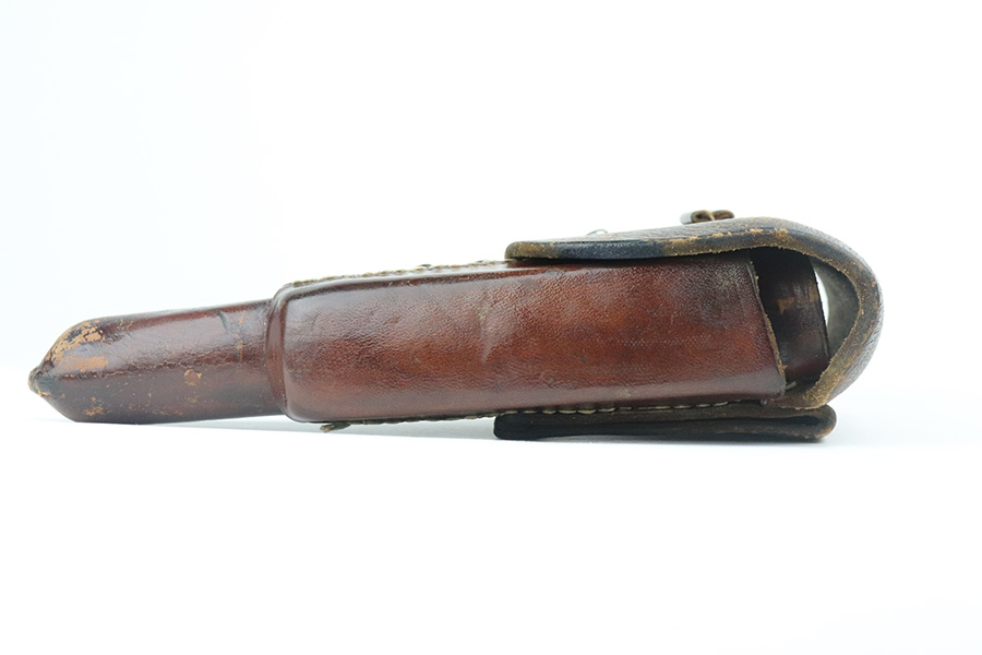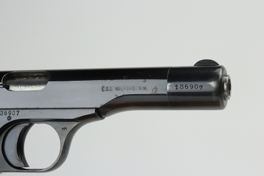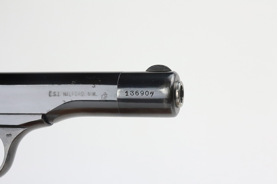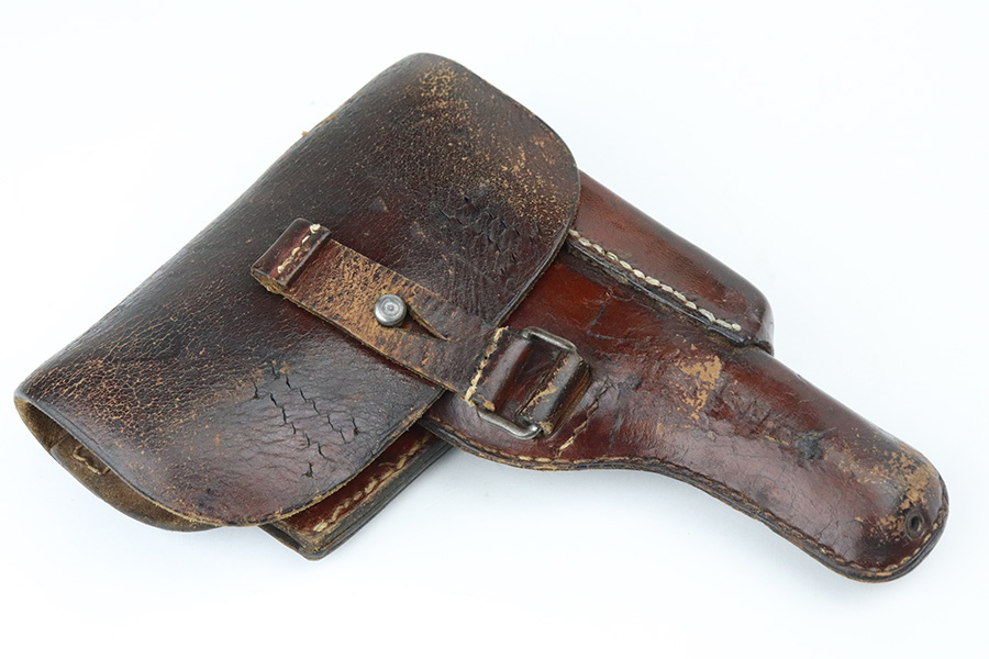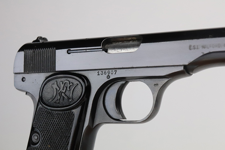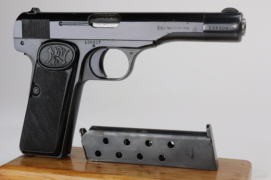 7/30/21 – This is a minty example of a Belgian FN Browning Model 1922 rig, manufactured after WW2. It is all matching, has the proper Belgian proofs, and has an import mark on the right side of the slide. It comes with a 1943-dated waffen-proofed dropping-style holster. The gun has retained about 97-98% of its original finish. There are just hints of wear on the high edges of the slide and around the muzzle. Some very tiny handling marks on the straps. Comes with excellent black bakelite grips and two proper magazines. Mint bore.