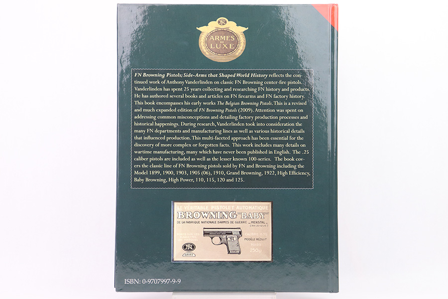 9/8/22 – This is an example of Anthony Vanderlinden’s “FN Browning PIstols: Side-Arms that Shaped World History Expanded Second Edition”. The book is in great condition with well kept pages. All pages are clean. This edition is currently out of print and is a great resource for collectors when it comes to FN Browning pistols. 368 pages in total. Hard Cover Book.