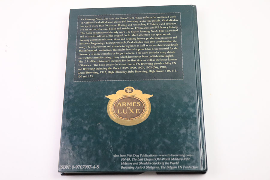 10/11/22 – This is an excellent, lightly used, copy of Anthony Vanderlinden’s “FN Browning Pistols: Side-Arms that Shaped World History”. The pages are well kept and the binding is in excellent shape. The hard cover is in great condition with only minimal signs of wear or use at the corners. Some mild discoloration on the cover as well. 334 total pages in length. This edition is currently out of print and is a great resource for collecting FN Browning pistols.