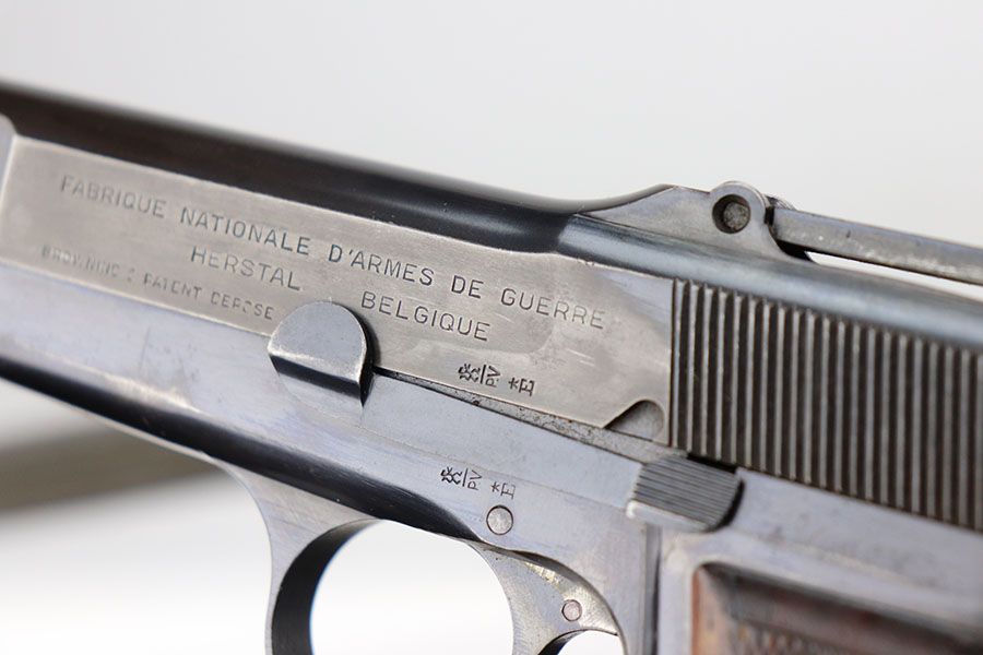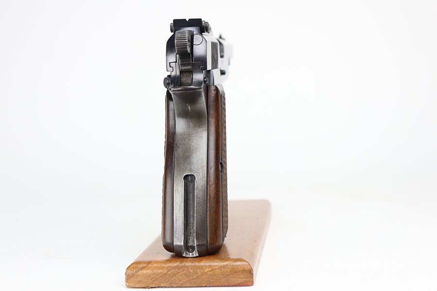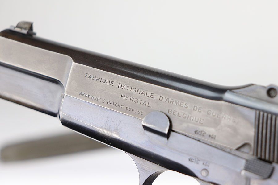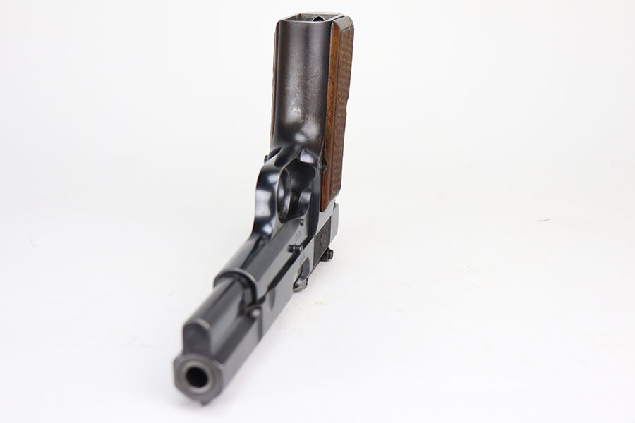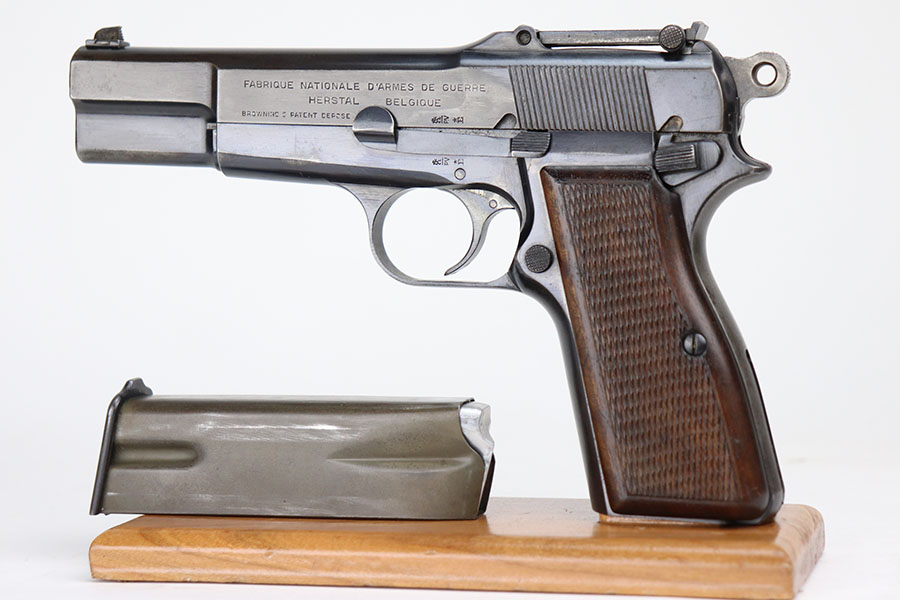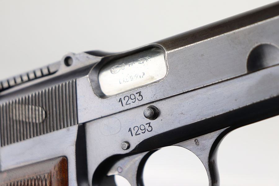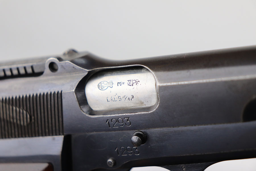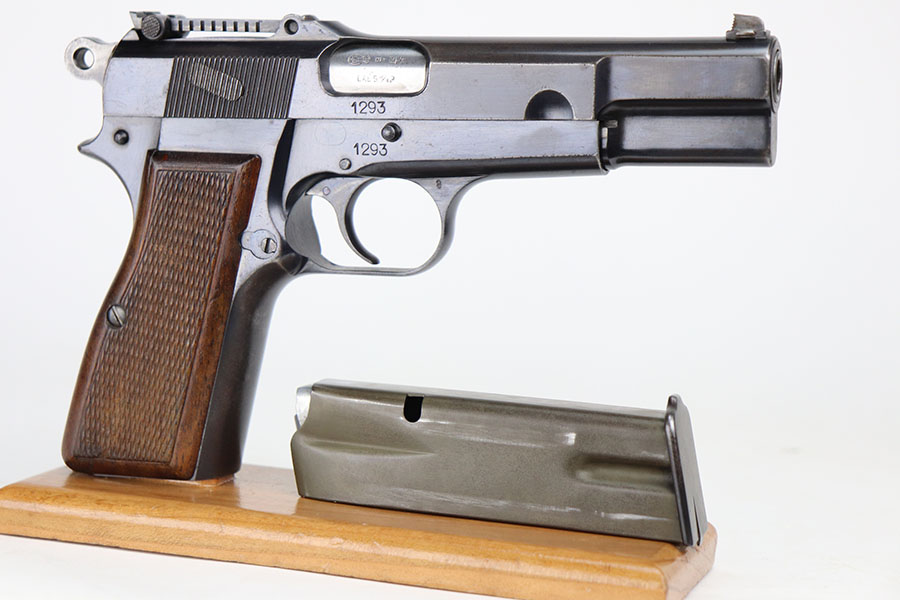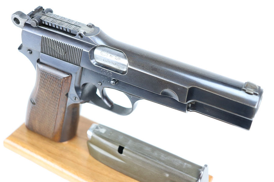 4/21/21 – This is an ultra rare FN High Power that was one of only 100 produced and sent to the Estonian border patrol. These are recognized by serial number and the font of that serial number, and only the border patrol examples were unmarked. The pistol is matching and original with most of the finish loss on the left side of the slide and on the back strap. Slotted frame with tangent rear sight. Terrific bore. Early grips with the red interior.
