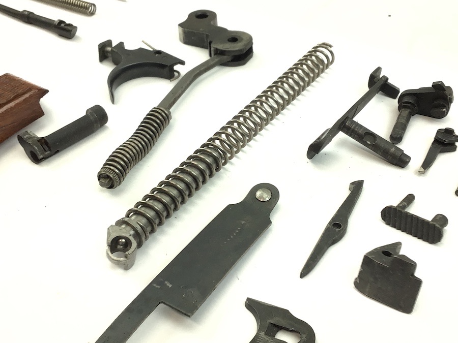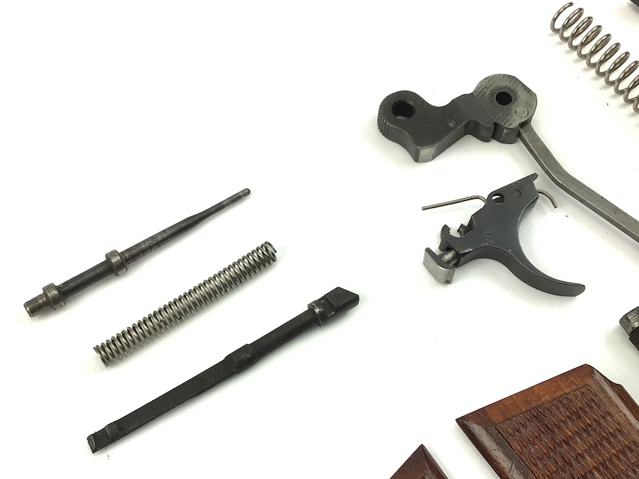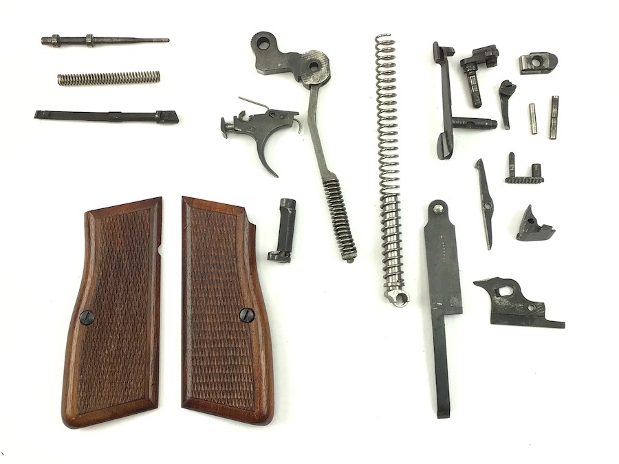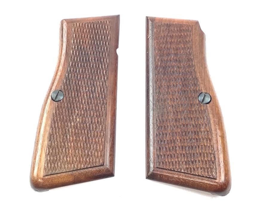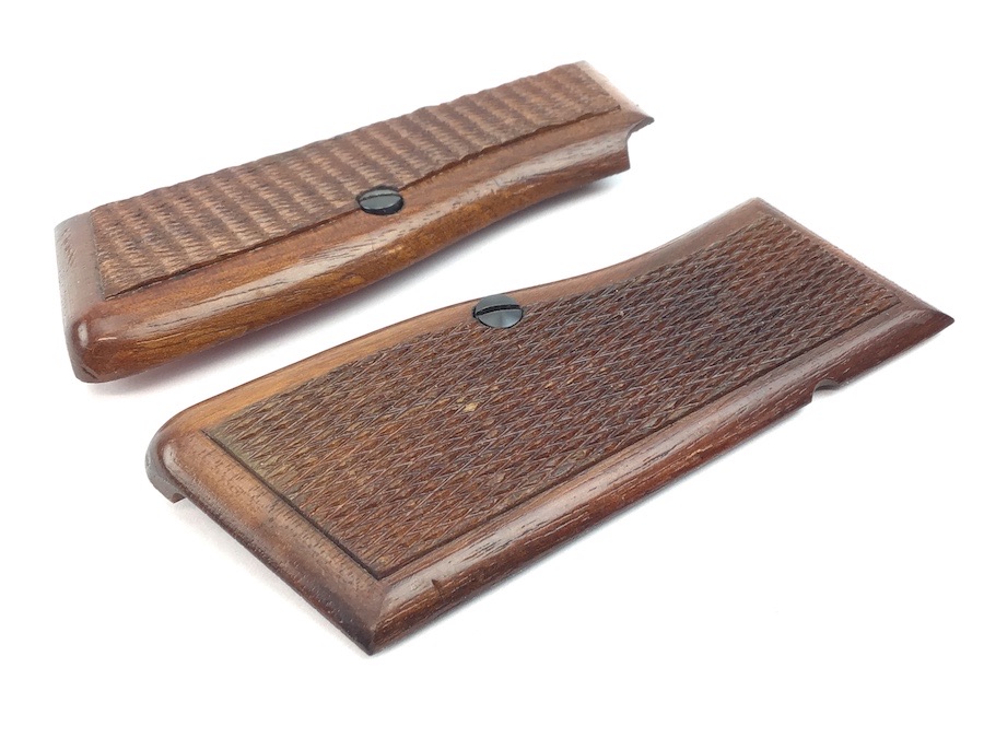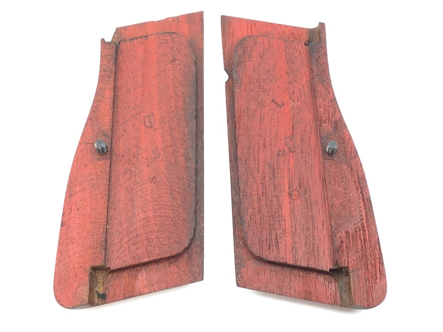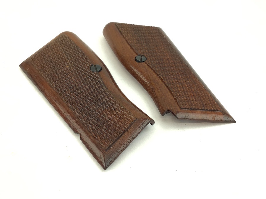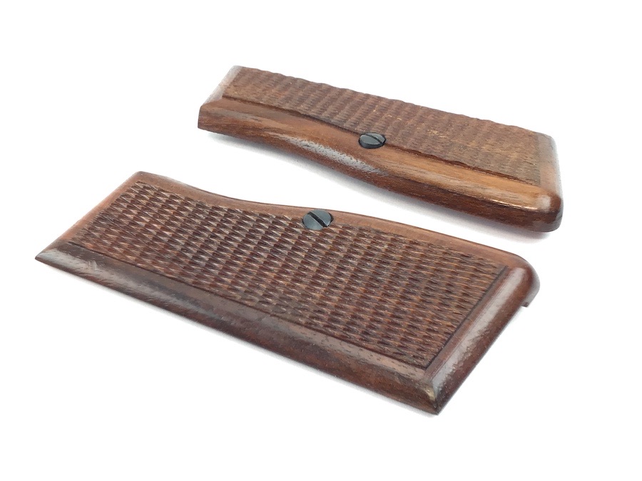 5/27/22 – Original and excellent condition. FN Browning 9mm High power wood grips, grip screws and parts kit. The grips are in excellent condition with no cracks or chips. Distinct checkering with nice color. Early grips with red interior. All parts are useable.
