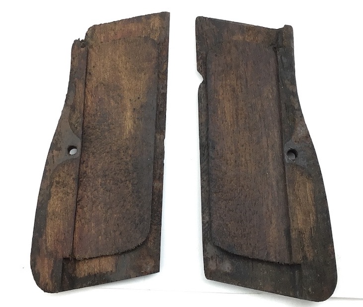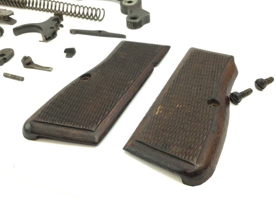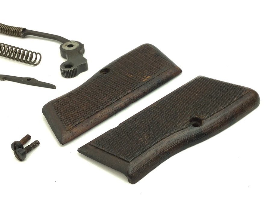 7/25/22 – Original and excellent condition. FN Browning 9mm High power parts kit including the tangent site. The grips are in great condition with no cracks or chips. Distinct checkering with nice color. WW2 production.