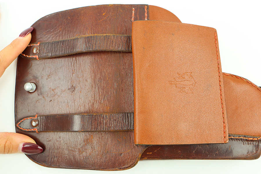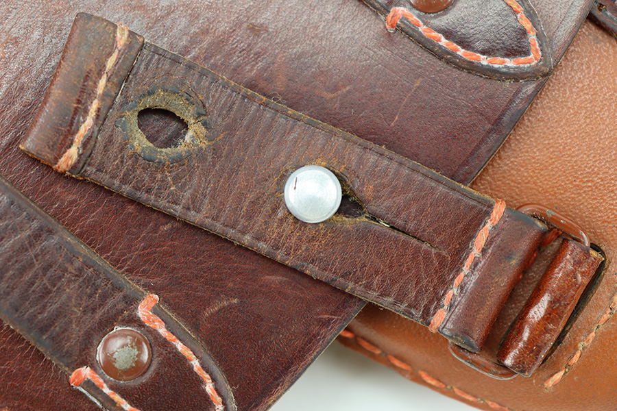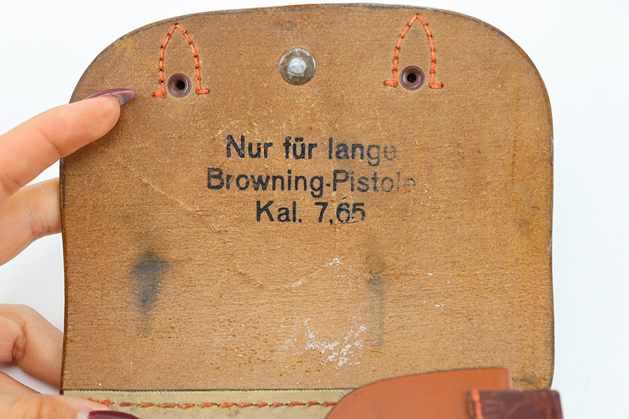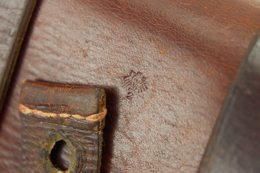 12/6/23 – This is an original WW2 production FN M1922 holster. The holster has an ersatz style body with leather top lid, closer strap, and magazine pouch. The front of the holster is stamped with a Krieghoff / Luftwaffe eagle proof stamp. The interior leather is model designation stamped in ink. The leather and stitching are all original and in great condition throughout this example, with a few missing stitches on the magazine pouch, but this doesn’t affect functionality.