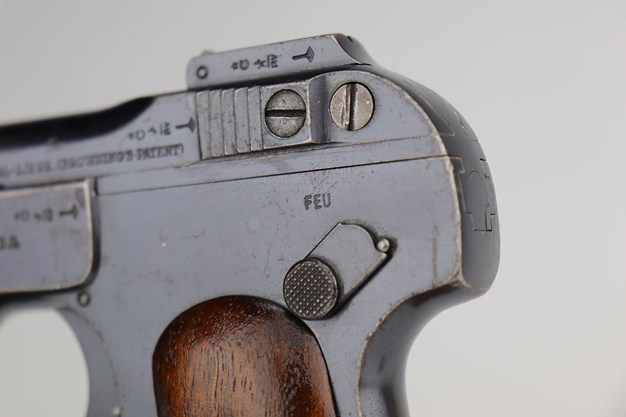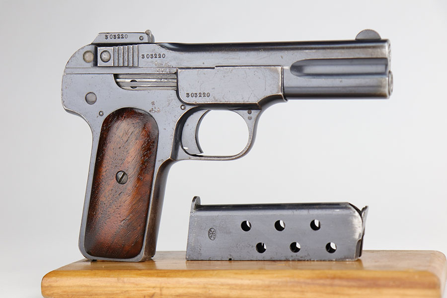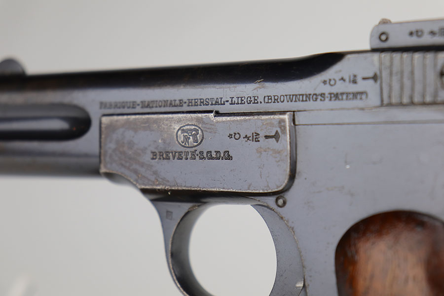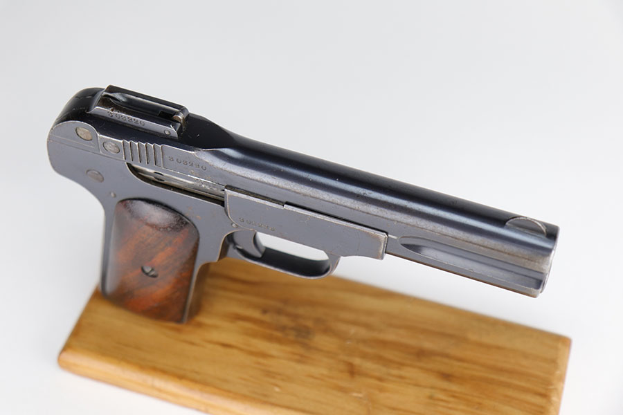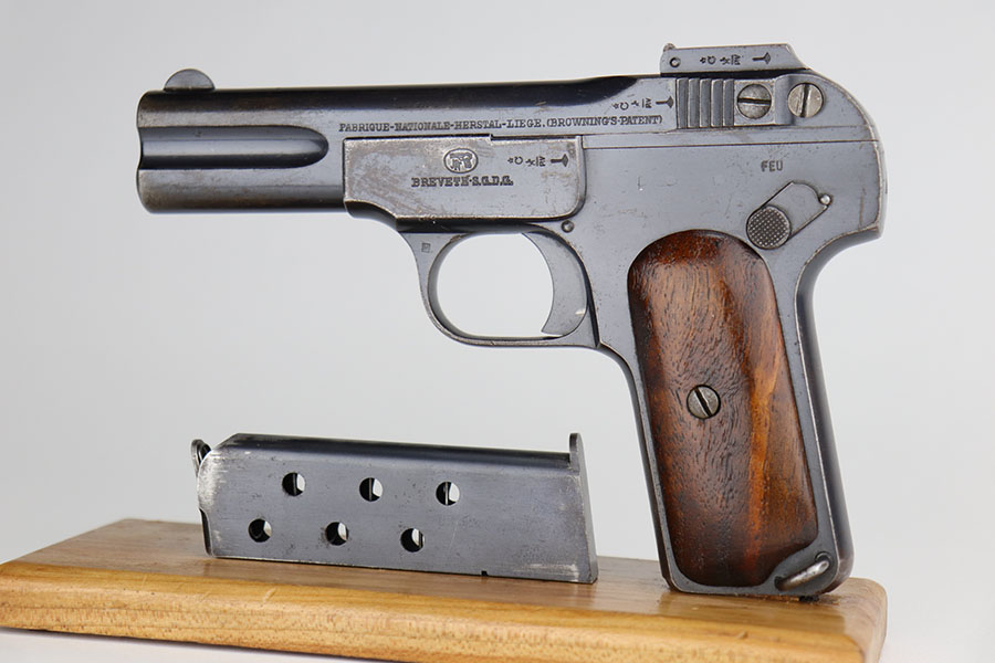 The design was presented to arms manufacturer FN Herstal in 1898, with production commencing the following year (then under the designation Modele 1899). In 1900, an improved design featuring primarily a shorter barrel and wider grips was introduced as the M1900. These designations were applied retroactively after FN began manufacture of other Browning pistol designs; initially the M1900 was marketed as simply the “Pistolet Browning” (Browning Pistol). Production ceased only 11 years later, with a total of about 700,000+ units having been produced. United States President Theodore Roosevelt owned a mother of pearl-gripped M1900, which he regularly kept on his person and in his bedside drawer.