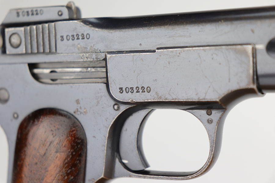 12/1/20 – This is a nice example of an FN Browning Model 1900, made in the early 1900’s. This one is all matching and has retained about 80% of its bluing. There is spotty wear and patina throughout. It comes with excellent wood grips and a period-correct magazine. The bore is excellent – shiny with strong rifling.