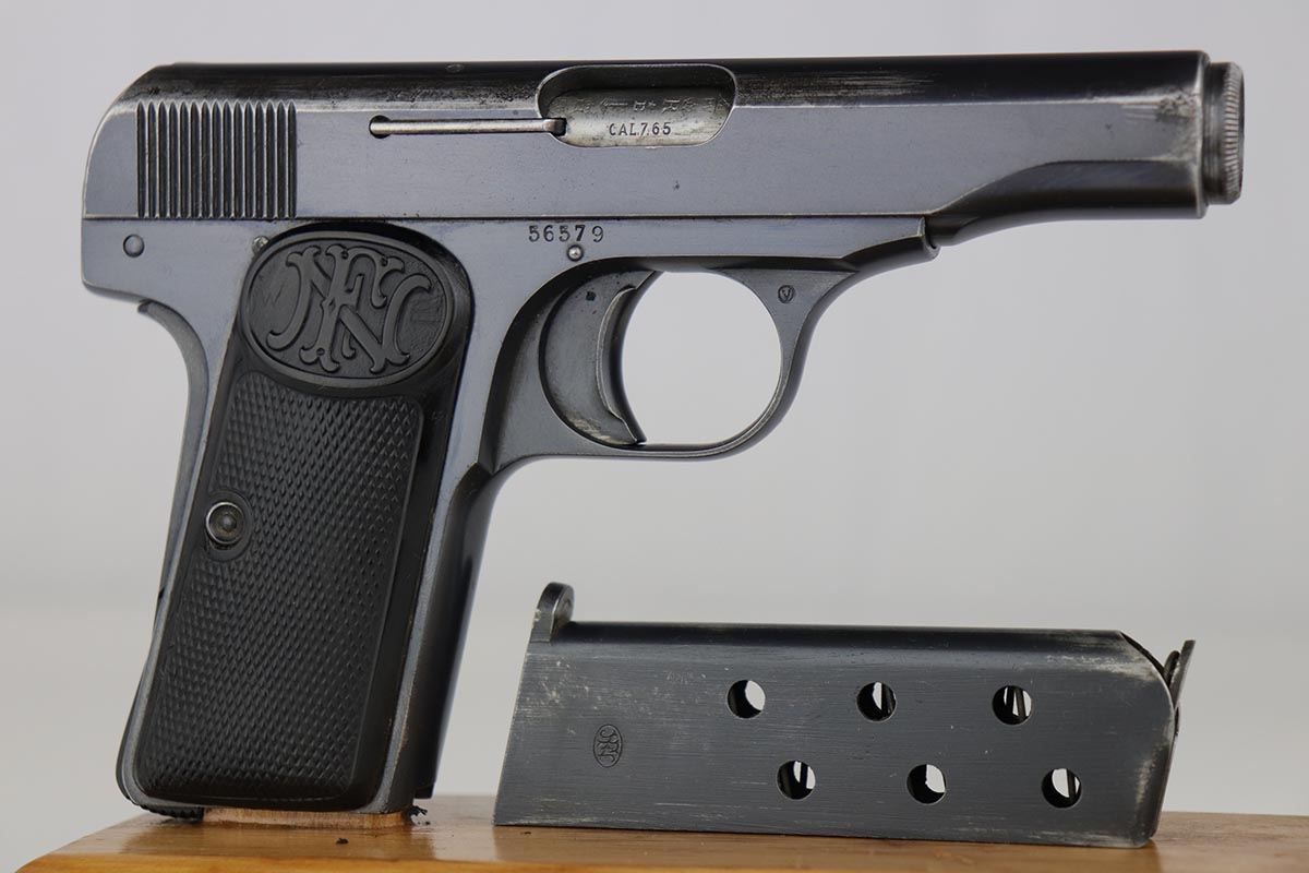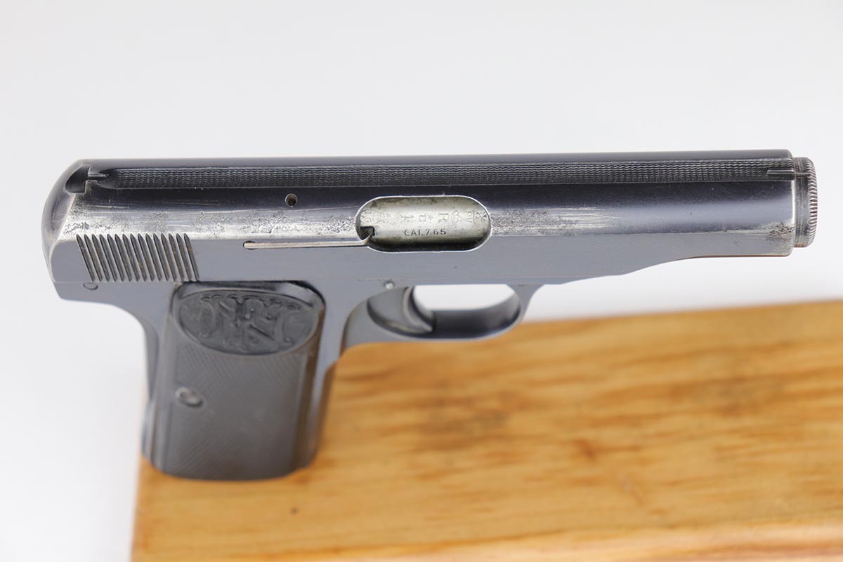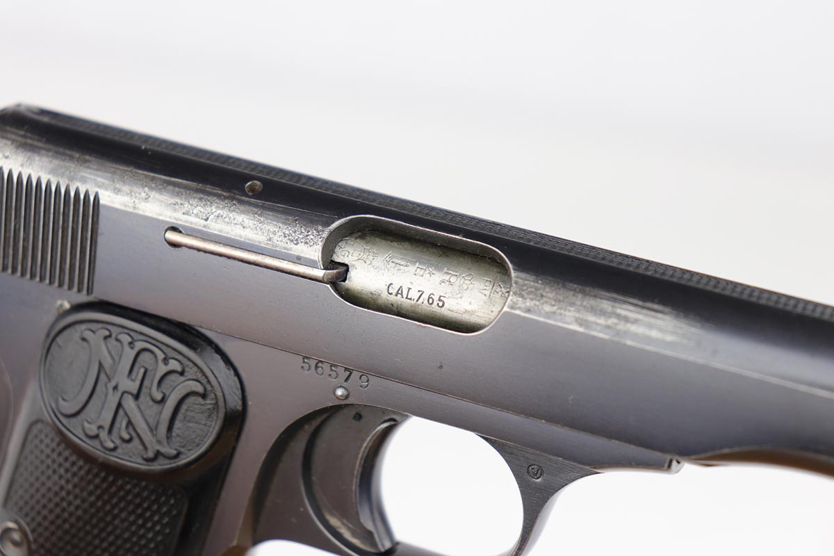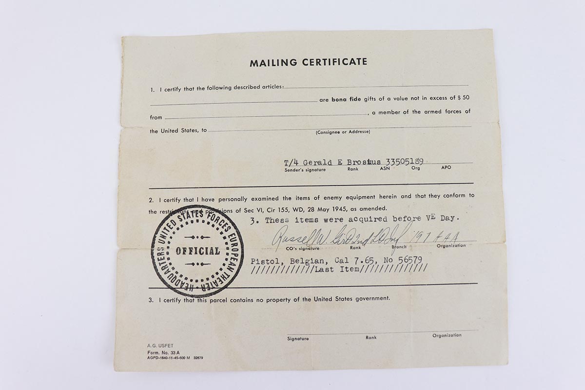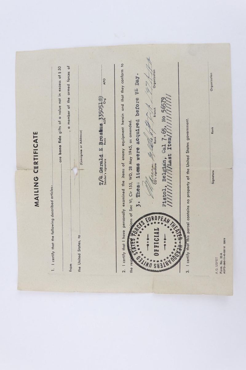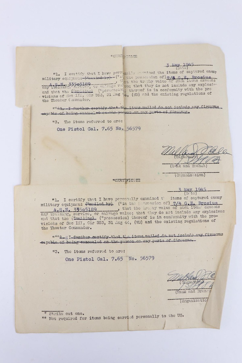 6/14/19 – This is a nice example of an original FN Browning Model 1910 pistol with the World War II era capture documentation. The documents state that the pistol was brought back by G.E. Brosius, a Technician Fourth Grade, in May of 1945. The pistol is mentioned by serial on capture document and mailing certificate. Quite interestingly, the mailing certificates specifically mention that the pistol was captured before VE Day. Our best guess is that this was done specifically to denote that it was captured from battle, perhaps at the request of T/4 Brosius, as opposed to the many war trophies captured after the surrender. It is all original and retains about 90% blue, with some finish loss on multiple areas of the slide and the back strap. There is also some pitting on the grip safety, left side frame and a couple areas of the slide. Nice, original grips with no major flaws. Bore is shiny with strong rifling.