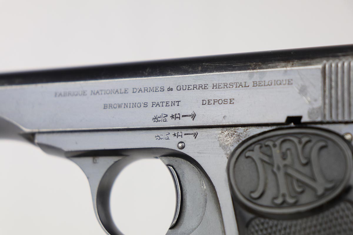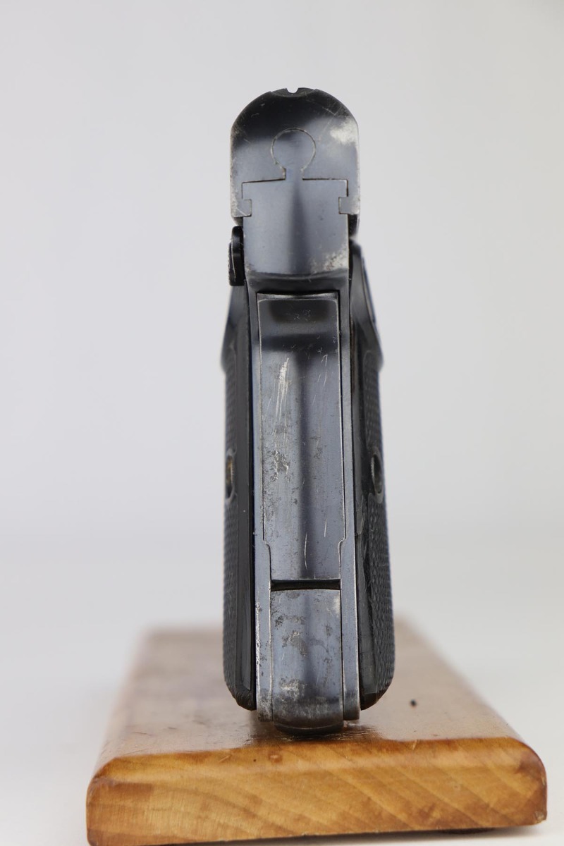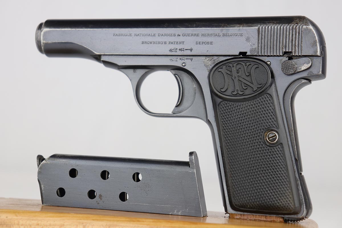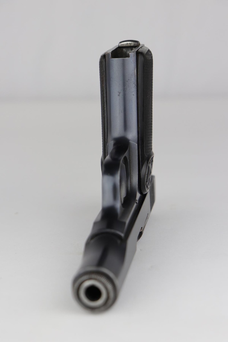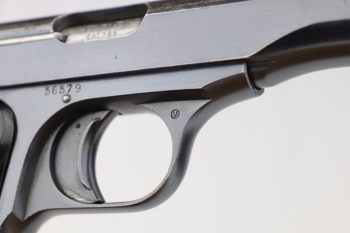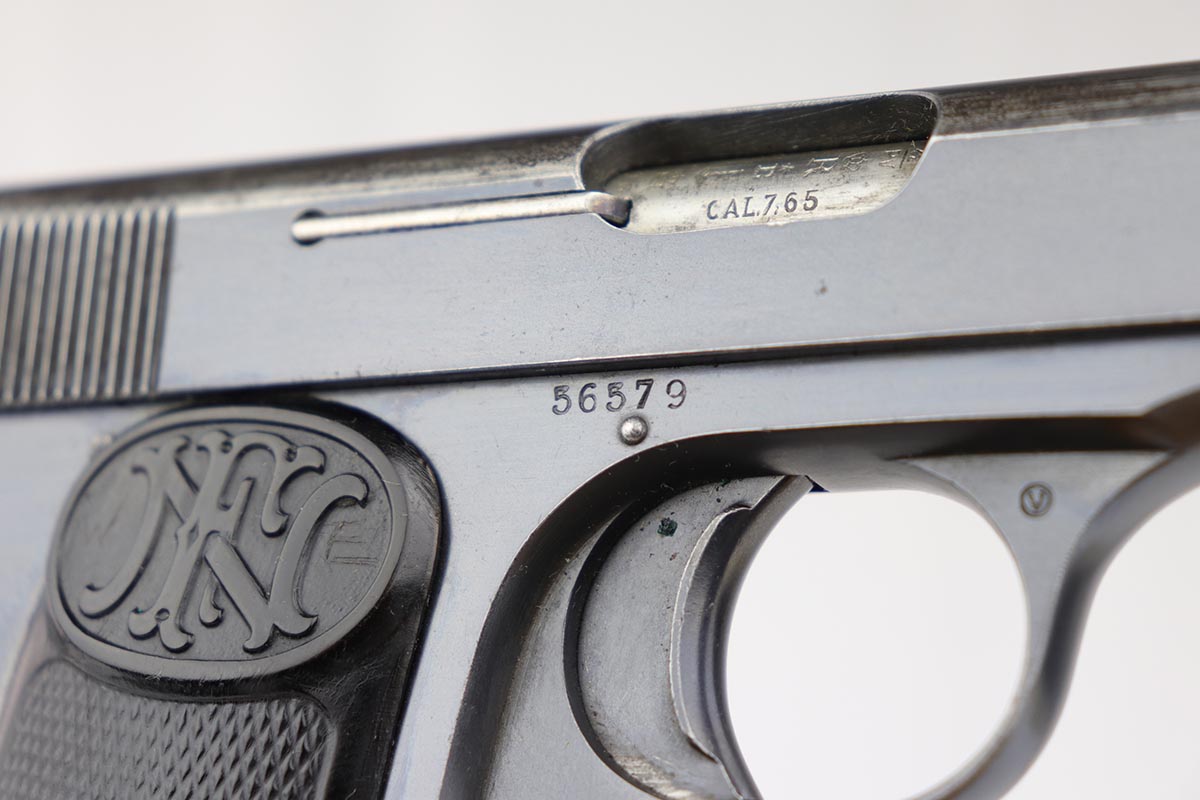 6/14/19 – This is a nice example of an original FN Browning Model 1910 pistol with the World War II era capture documentation. The documents state that the pistol was brought back by G.E. Brosius, a Technician Fourth Grade, in May of 1945. The pistol is mentioned by serial on capture document and mailing certificate. Quite interestingly, the mailing certificates specifically mention that the pistol was captured before VE Day. Our best guess is that this was done specifically to denote that it was captured from battle, perhaps at the request of T/4 Brosius, as opposed to the many war trophies captured after the surrender. It is all original and retains about 90% blue, with some finish loss on multiple areas of the slide and the back strap. There is also some pitting on the grip safety, left side frame and a couple areas of the slide. Nice, original grips with no major flaws. Bore is shiny with strong rifling.