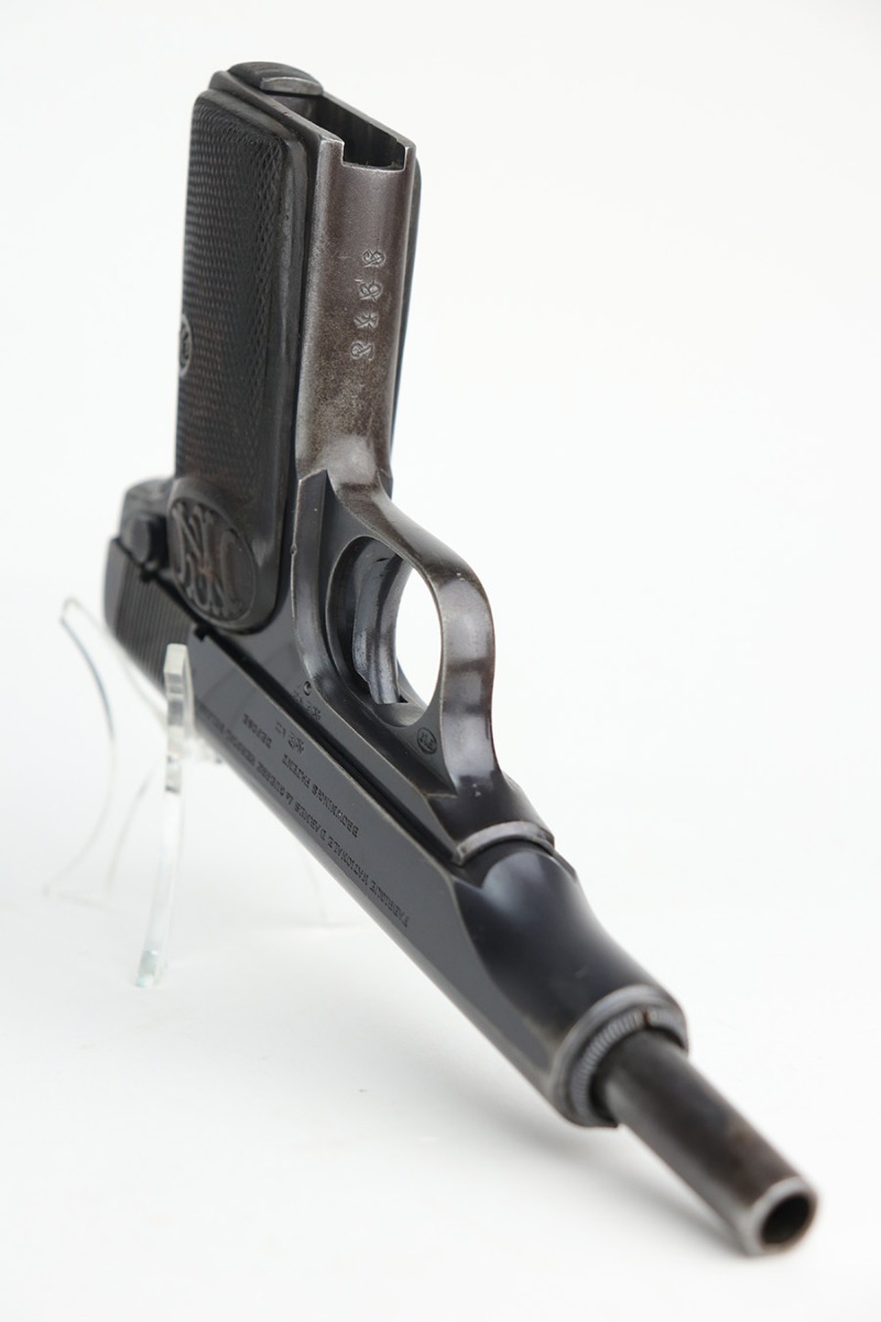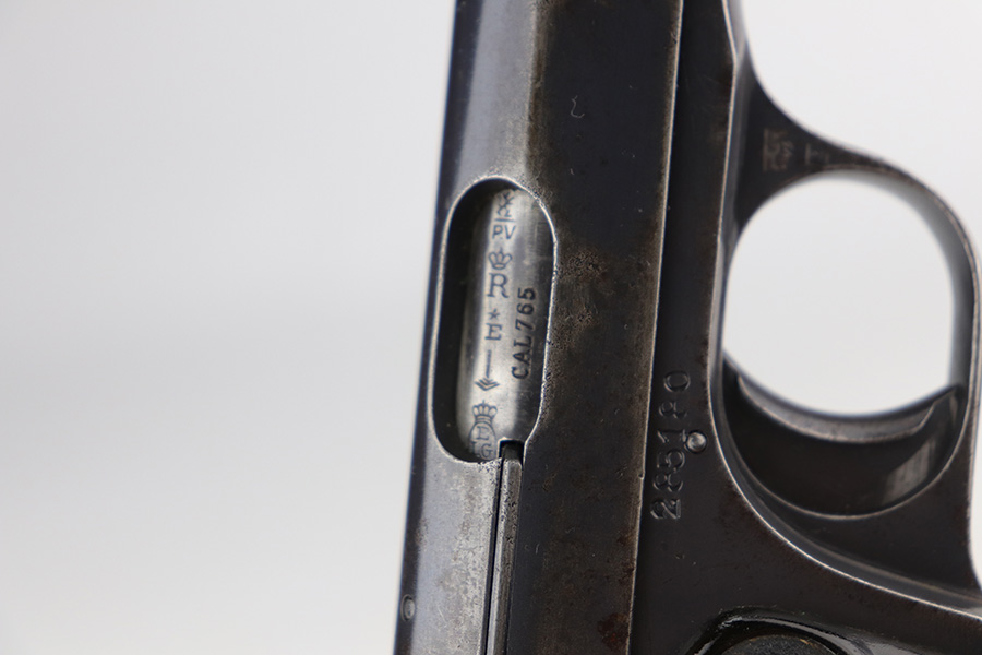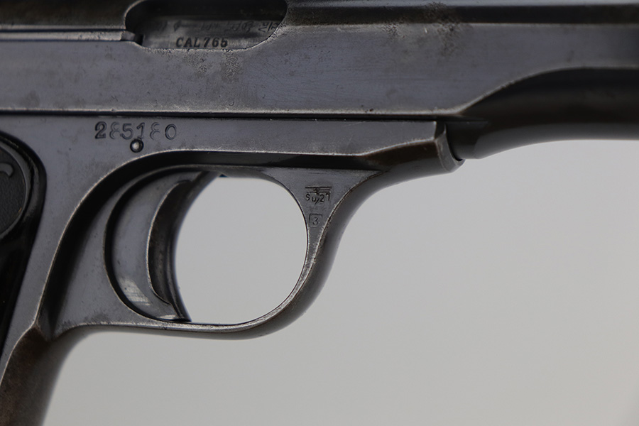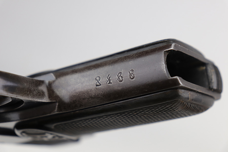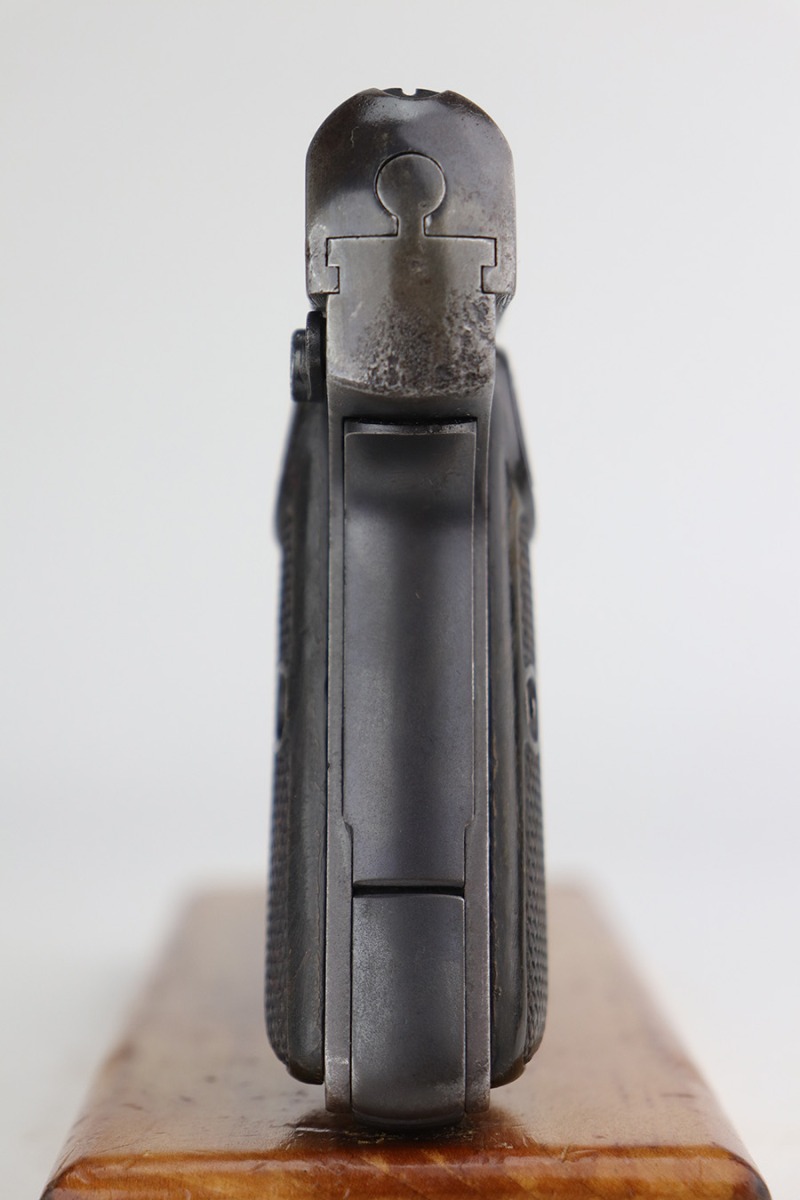 10/5/21 – This is a scarce and interesting FN Model 1910 that likely has quite the story to tell. The slide features a bow and arrow proof over the number ’31’, and the front grip strap has a crossed out arsenal number. The right side of the trigger guard is Eagle/Su21 marked, and the barrel is obviously extended as compared to standard production. The order of operations here may be tough to verify, but it appears it was imported to Prague in 1931, and perhaps the number on grip frame is from the Czech police. The waffenamt on right side is a Simson proof, and it seems possible that Simson was responsible for the 1.25in longer barrel variation. Having started out as a commercial pistol in Belgium, it would appear this one has been all over Europe and served various roles. The finish is original but thin in several areas, and shows patches of pitting on the rear left side of frame and slide, back of frame and right side of slide on the rounded portion. Grips show age and some smoothing but no major defects. Excellent bore.