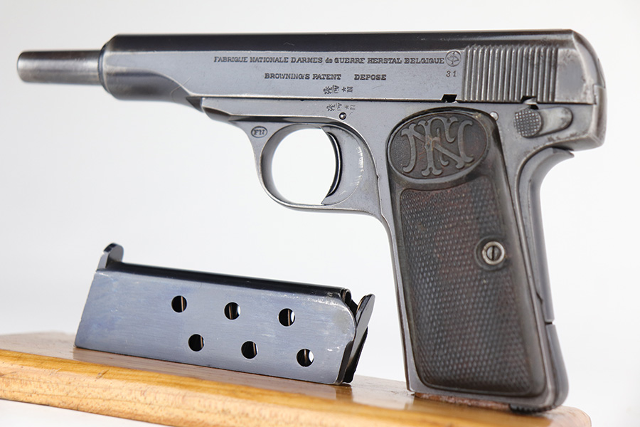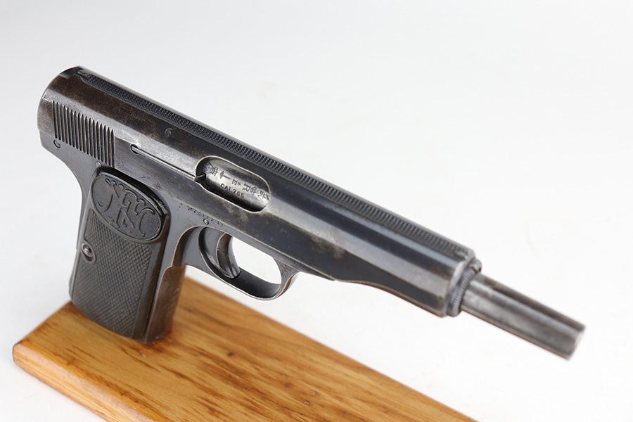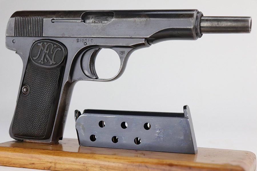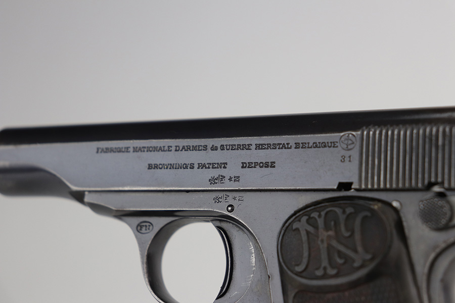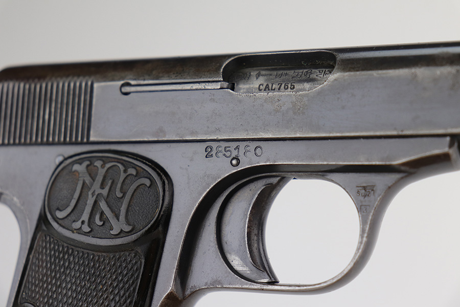 10/5/21 – This is a scarce and interesting FN Model 1910 that likely has quite the story to tell. The slide features a bow and arrow proof over the number ’31’, and the front grip strap has a crossed out arsenal number. The right side of the trigger guard is Eagle/Su21 marked, and the barrel is obviously extended as compared to standard production. The order of operations here may be tough to verify, but it appears it was imported to Prague in 1931, and perhaps the number on grip frame is from the Czech police. The waffenamt on right side is a Simson proof, and it seems possible that Simson was responsible for the 1.25in longer barrel variation. Having started out as a commercial pistol in Belgium, it would appear this one has been all over Europe and served various roles. The finish is original but thin in several areas, and shows patches of pitting on the rear left side of frame and slide, back of frame and right side of slide on the rounded portion. Grips show age and some smoothing but no major defects. Excellent bore.