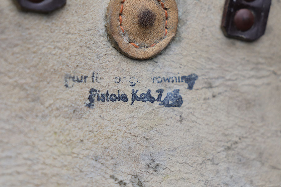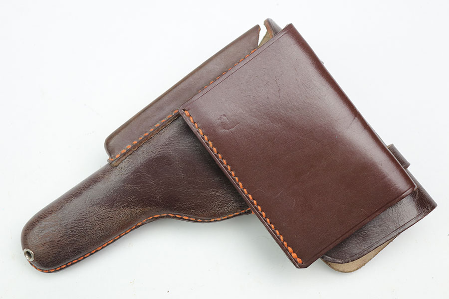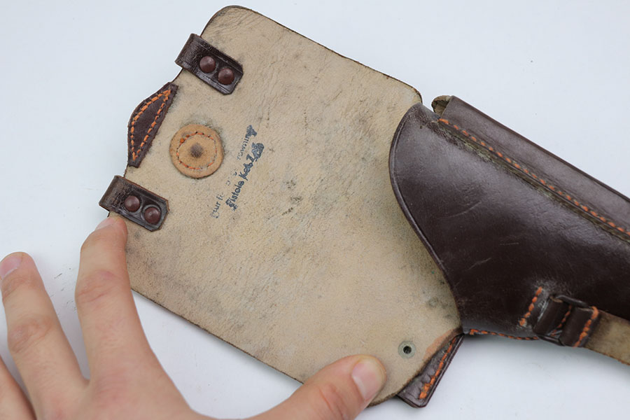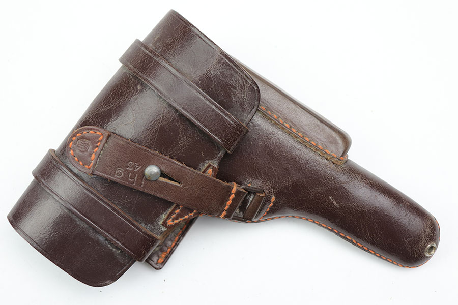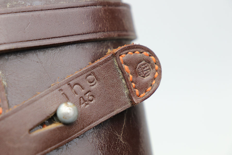 1/15/21 – This is an excellent condition holster for a 1922 FN Browning pistol made during WW2. The closure strap is “jhg” maker stamped and “43” dated. The interior leather has a nice original factory ink stamp. The leather is clean and strong with minimal wear. All original stitching is in tact.