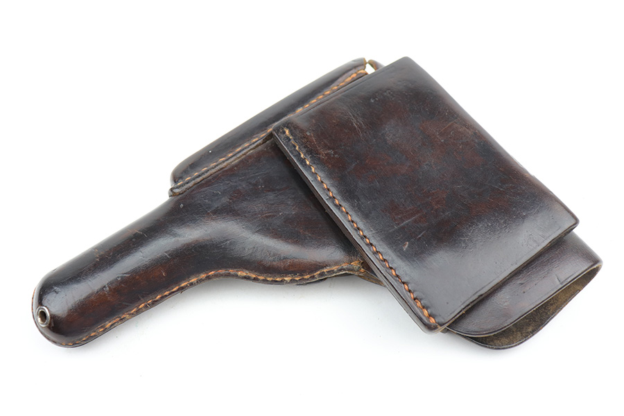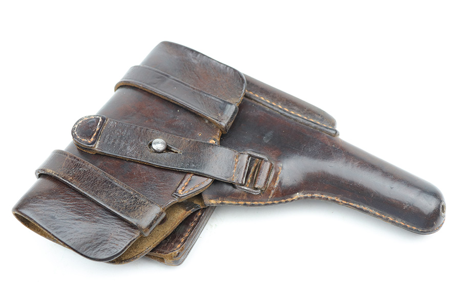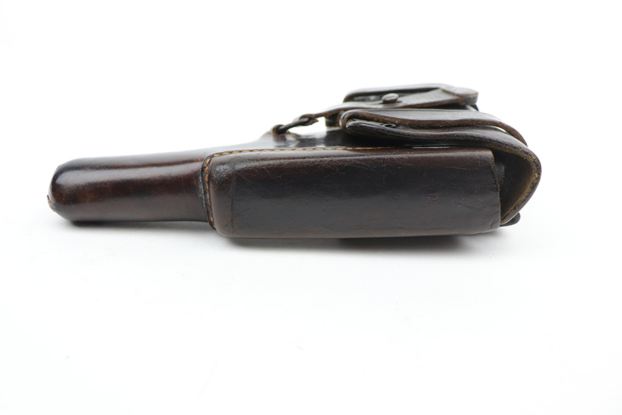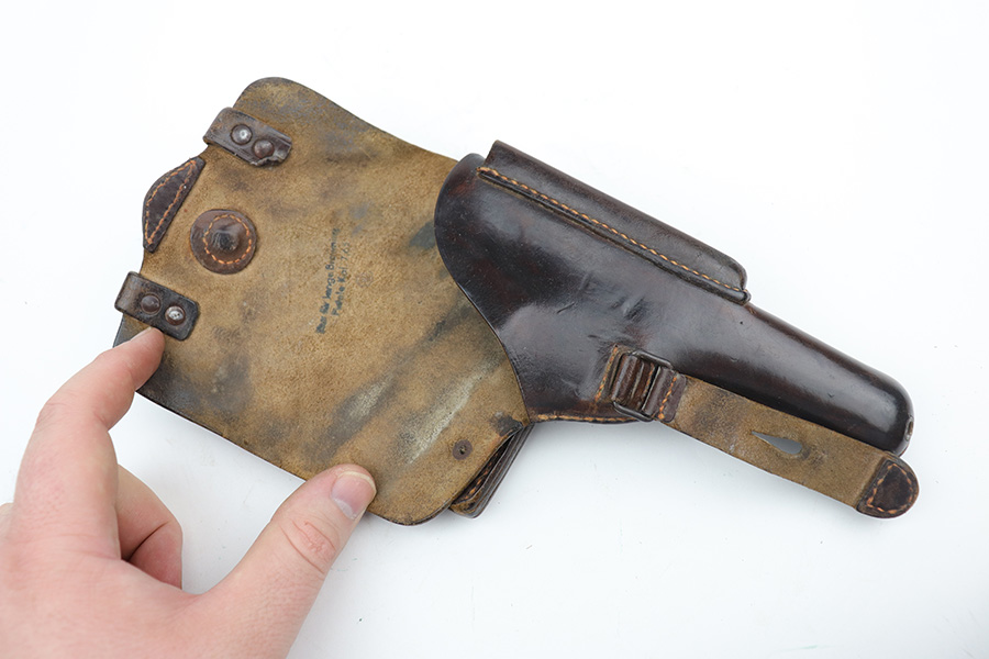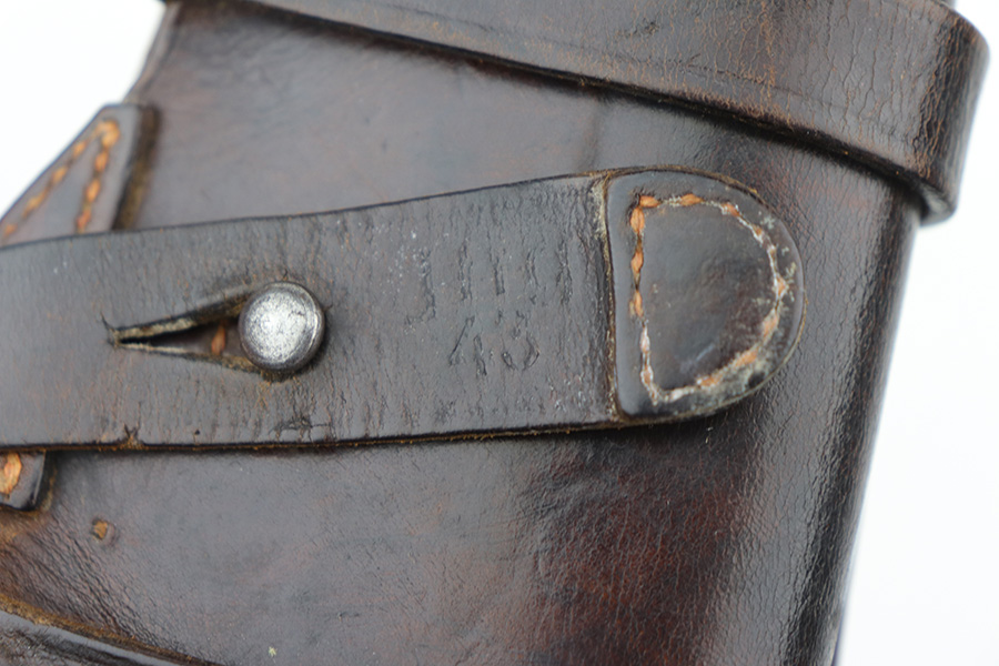 10/18/21 – This is an original WW2 production FN model 1922 holster. The holster is maker stamped “jhg 43” on the closure strap. The interior leather has an ink stamp and a faint Luftwaffe proof stamp in ink. Very nice, clean leather and all original stitching in tact.
