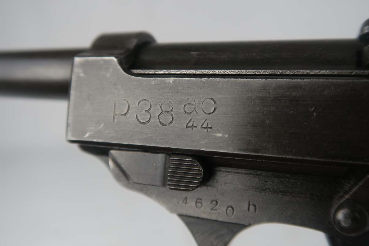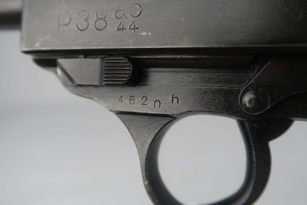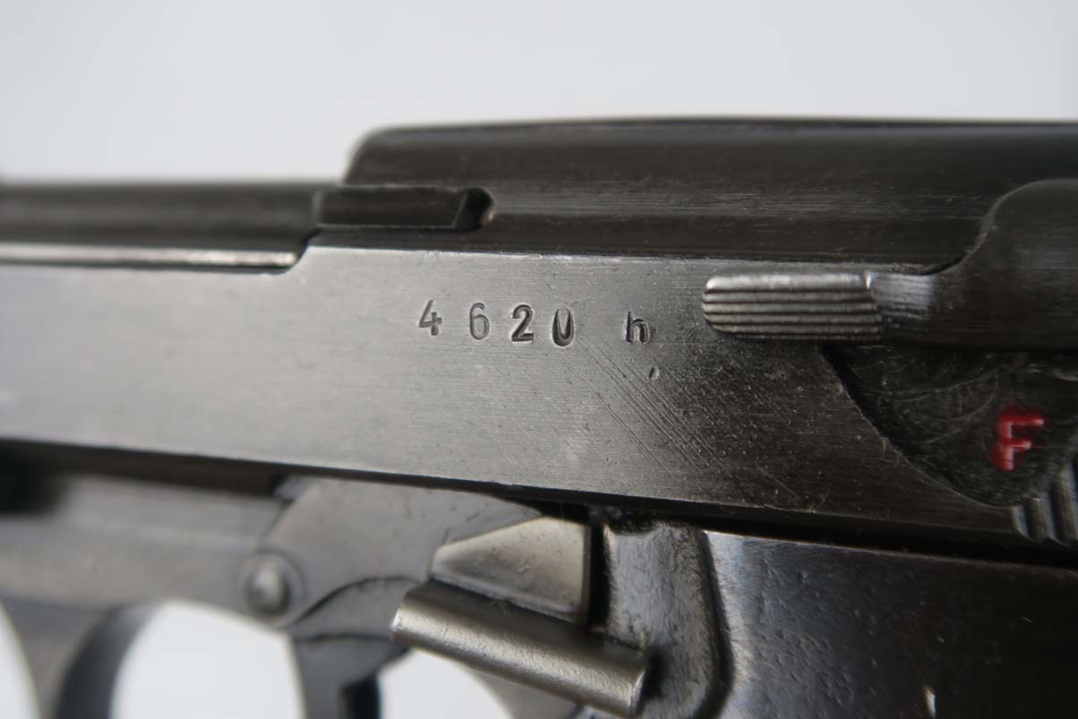 4/26/17 Can you believe all of these ODD BALL P.38’s we have gotten lately! This one is an SVW 45 (Mauser 1945) P38 – waffen proofed on the slide WaA135 and the barrel. However, they used an FN Belgian slide marked Large AC 44. It was in the Mauser factory when the French took over so it also has the French Star proof on the slide. It is in the H block and all matching numbers. It has the typical French “gray ghost” metal grips. The bore is shiny with strong rifling. Probably a 9 out of 10. Original finish and no import marks.