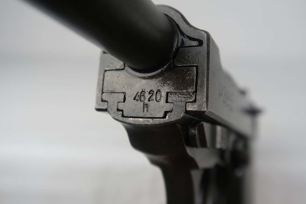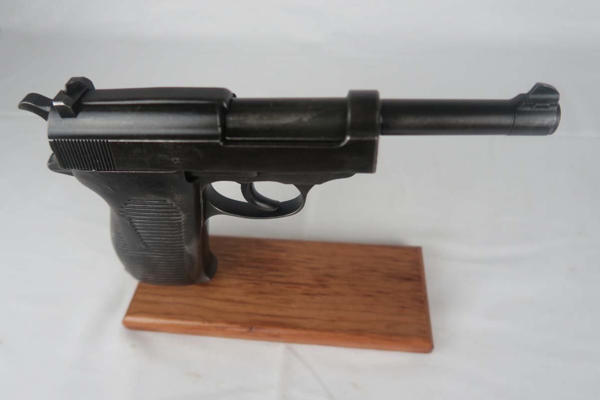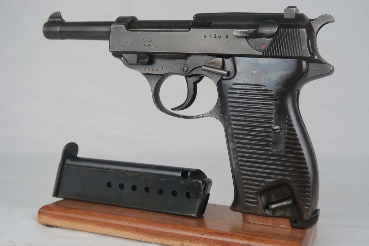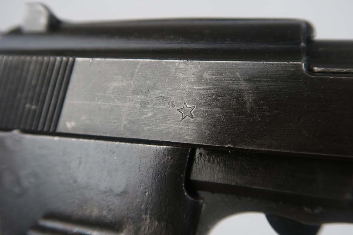 4/26/17 Can you believe all of these ODD BALL P.38’s we have gotten lately! This one is an SVW 45 (Mauser 1945) P38 – waffen proofed on the slide WaA135 and the barrel. However, they used an FN Belgian slide marked Large AC 44. It was in the Mauser factory when the French took over so it also has the French Star proof on the slide. It is in the H block and all matching numbers. It has the typical French “gray ghost” metal grips. The bore is shiny with strong rifling. Probably a 9 out of 10. Original finish and no import marks.