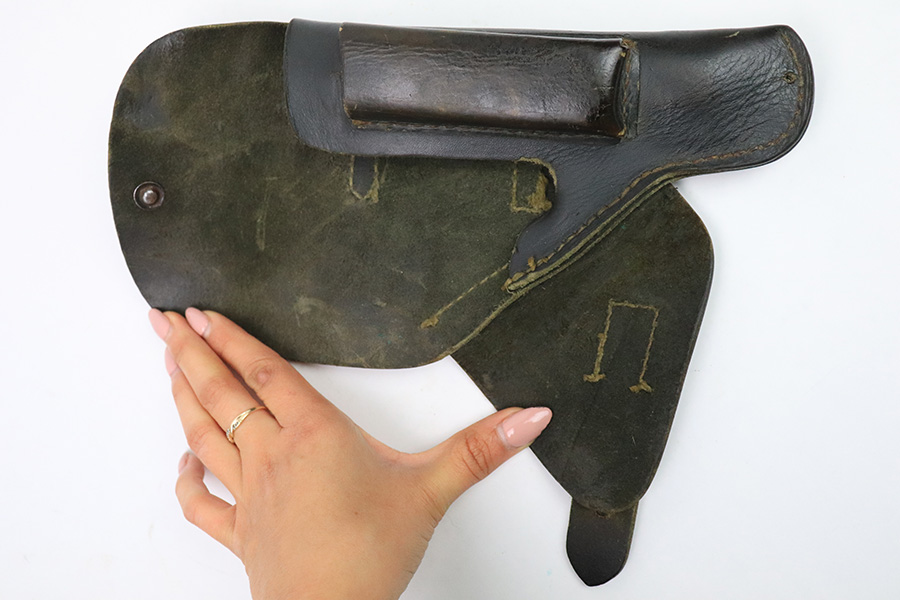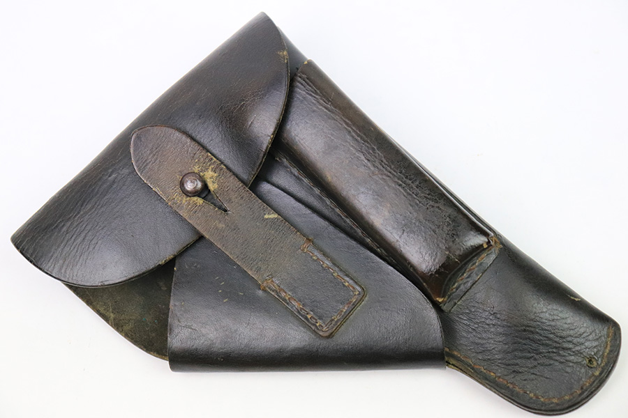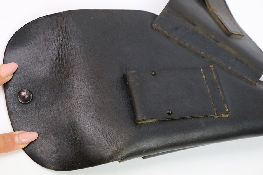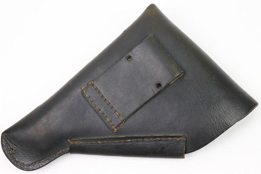 12/13/22 – This is an unmarked 7.65mm holster for a Walther PP or similar sized 7.65mm pistol. The holster features slightly green colored leather, which is often paired with / attributed to the German Forestry Police. The holster has aged leather with surface wrinkling and signs of previous use but no excessive wear. No markings or stamps. Excellent original stitching throughout.