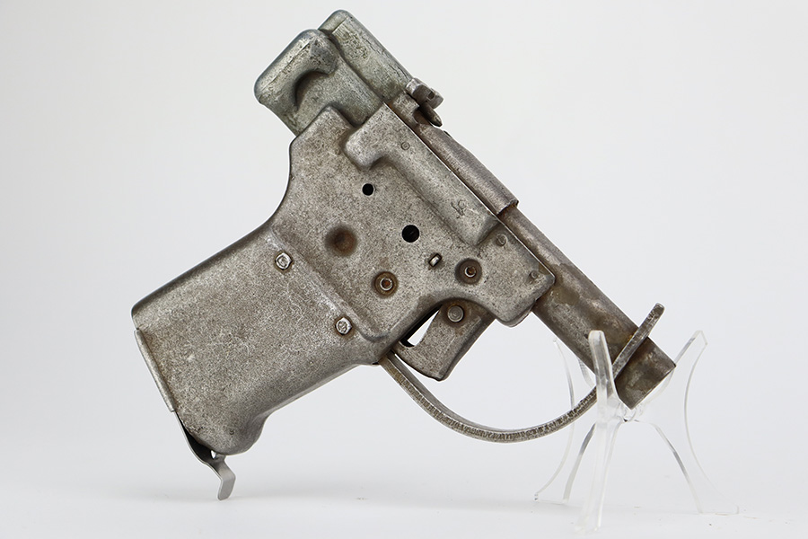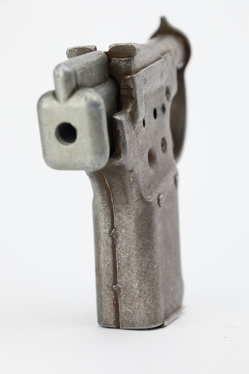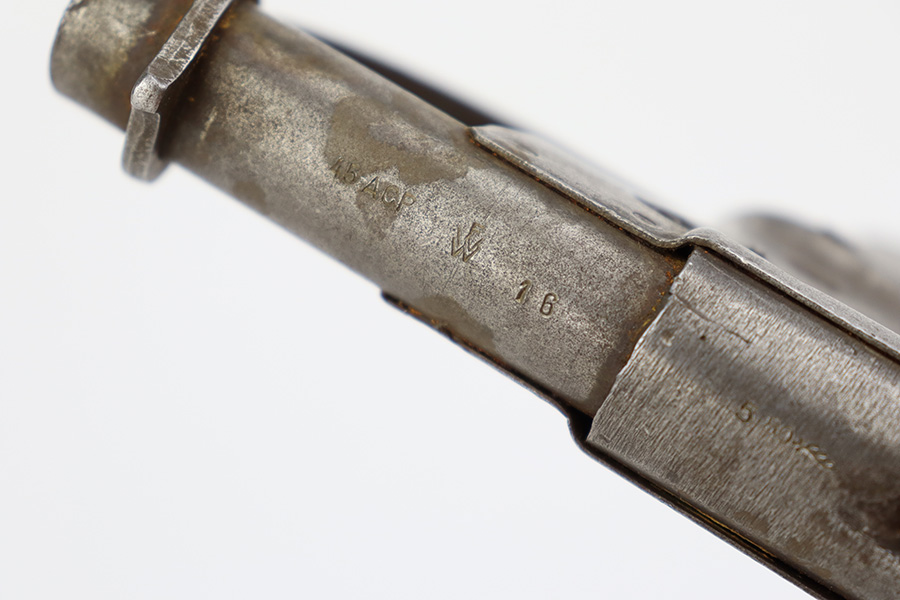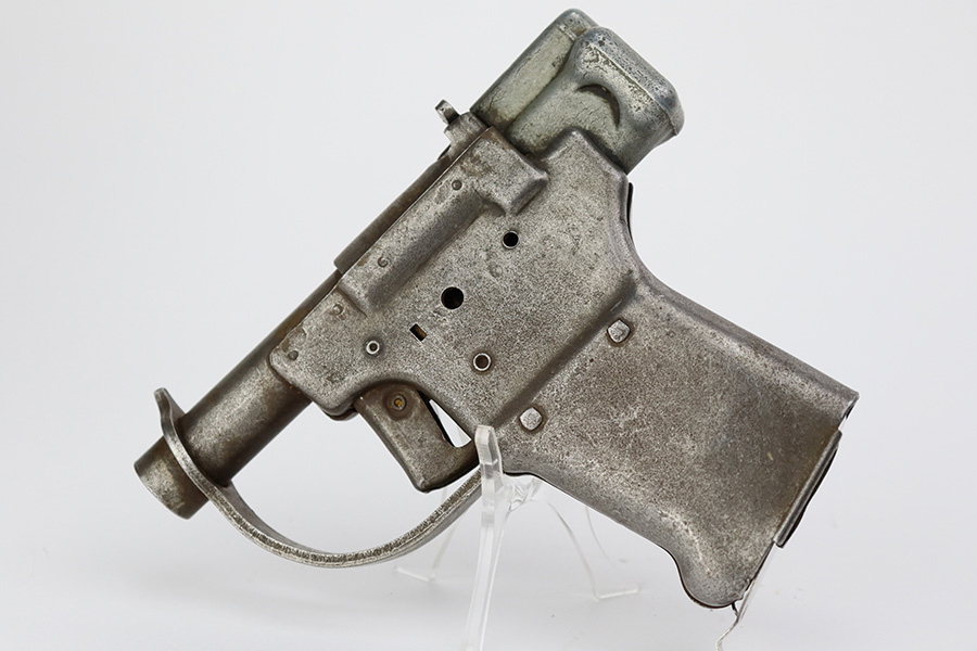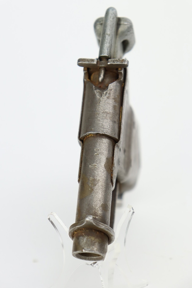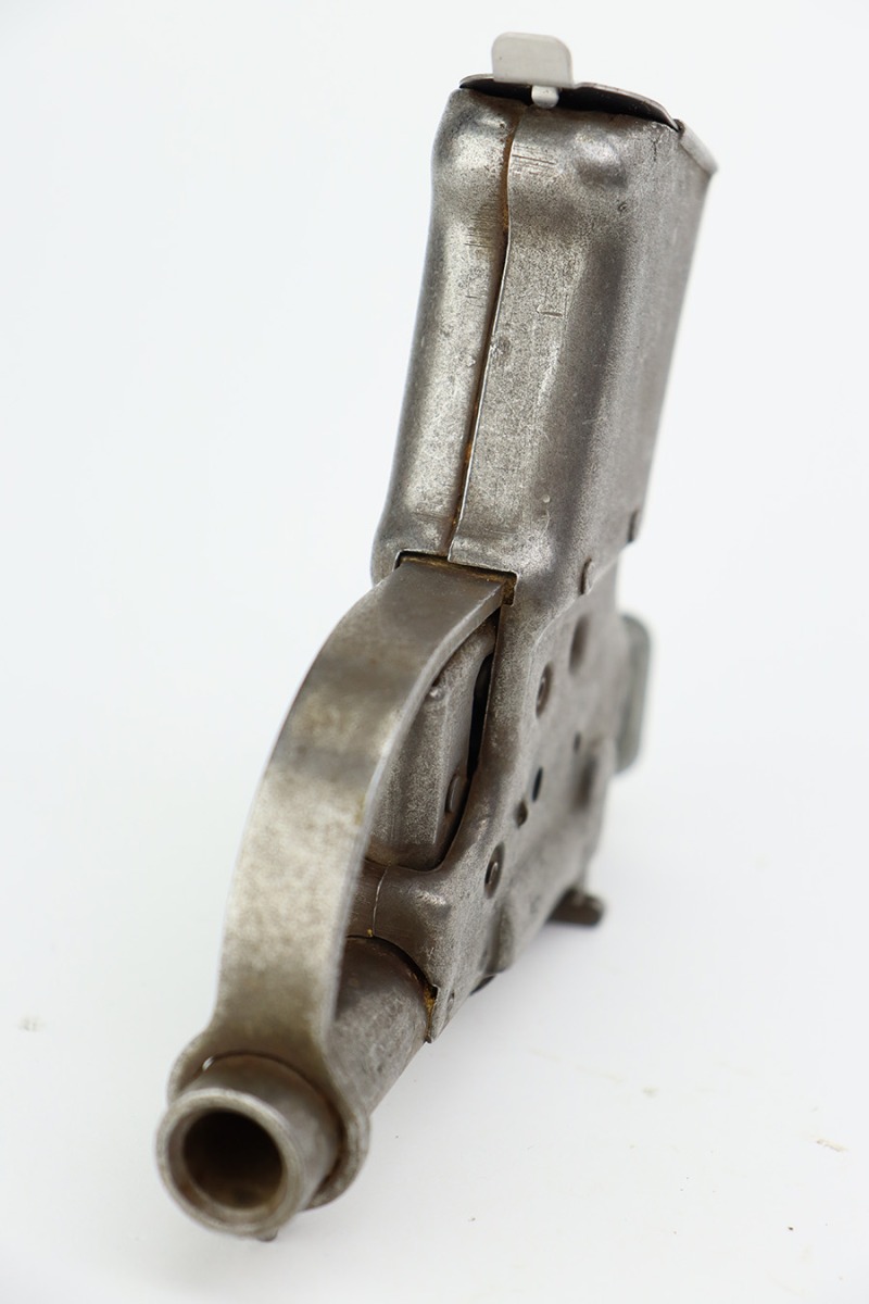 10/26/23 – The FP-45 Liberator was a pistol manufactured by the United States military during World War II for use by resistance forces in occupied territories. It was originally intended as an insurgency weapon to be mass dropped behind enemy lines to resistance fighters in occupied territory. A resistance fighter was to recover the weapon, sneak up on an Axis occupier, kill or incapacitate him, and retrieve his weapons. The pistol had its origins in the US Army Joint Psychological Committee and was designed for the United States Army in 1942 by the Inland Guide Lamp Manufacturing Division of the General Motors Corporation in Dayton, Ohio. The army designated the weapon the Flare Projector Caliber .45 hence the designation FP-45. This was done to disguise the fact that a pistol was being mass produced. This particular example is in good condition with mild patina and surface corrosion. On top it is marked 16 and 45 ACP. There is also a German “antler” proof and date “80”, which was most likely done to bring it back into the US after the war. Possibly was captured by the Germans during WW2, and exported back to the US postwar. Originally it would have had no markings. Mechanically correct. Comes with a smooth bore, with some mild patina inside but great overall condition. All correct with the exception of the bottom plate which is a replacement and more shiny then the rest of the gun. This example DOES require an FFL or C&R.