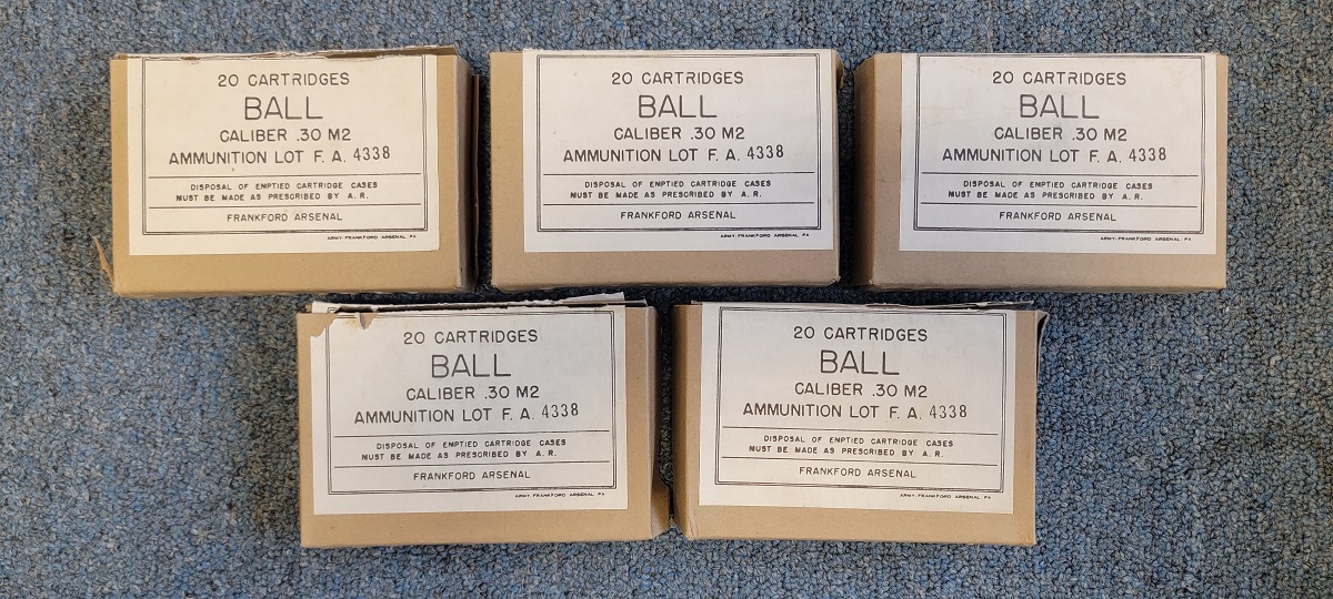 5/8/23 – These are 100 total rounds of Frankford Arsenal .30 M2 rifle ammunition. All rounds are 1950’s original and come in the original boxes as shown. Some of the boxes have torn edges and can come apart slightly, but the labels are in excellent condition as shown. All rounds are excellent as well, although some show some minor aging.
