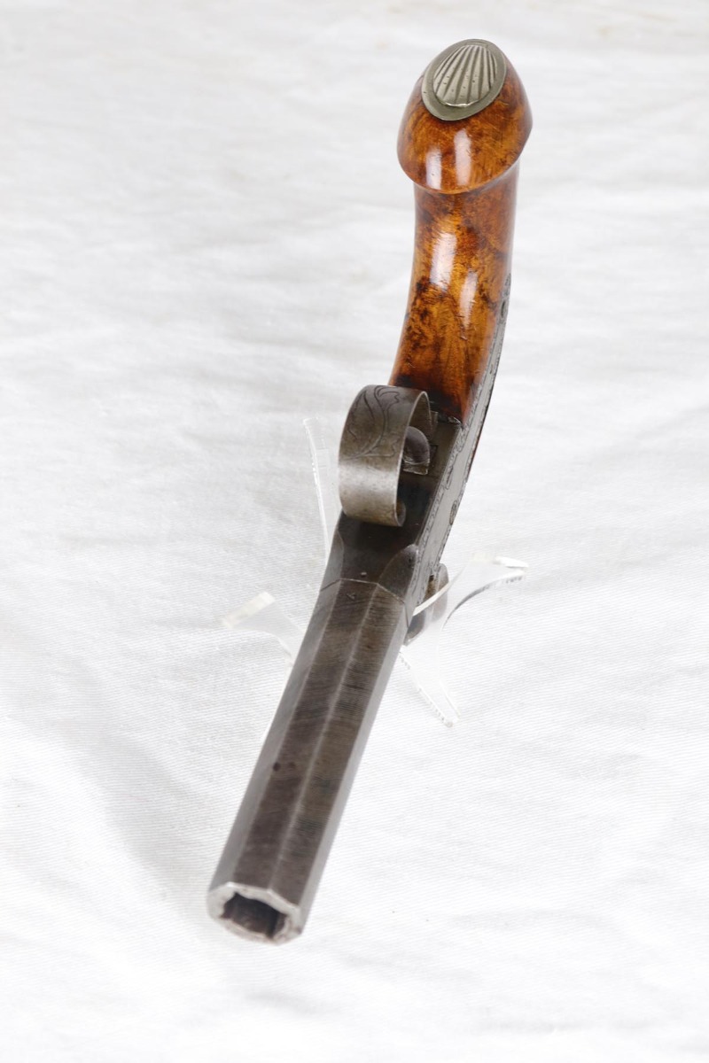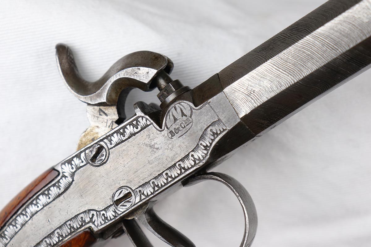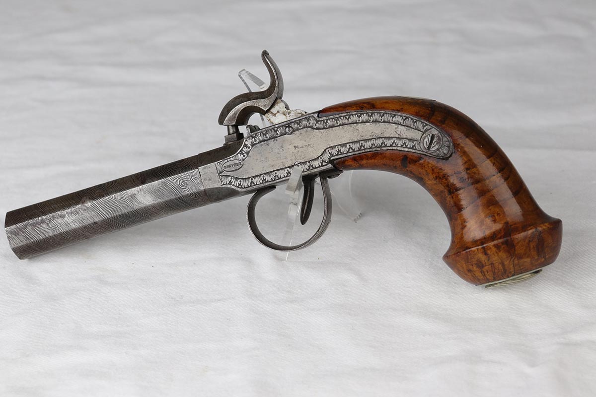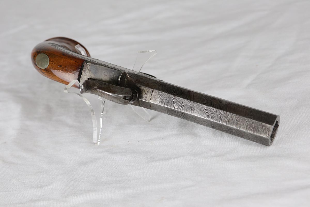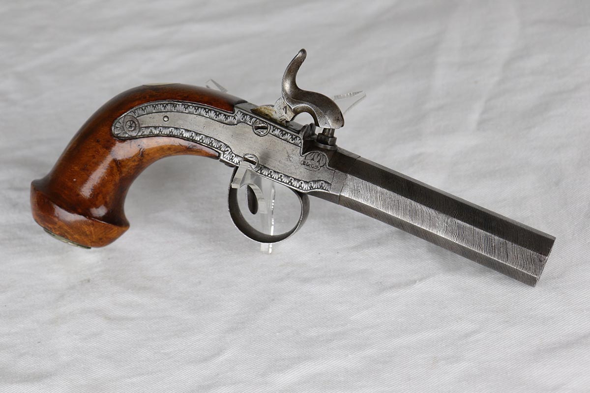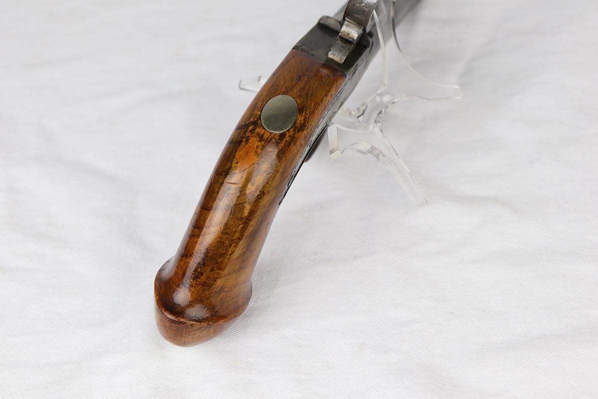 3/27/18 – This is a French caplock screw barrel muff pistol, manufactured B&Cie. Chambered in .45 caliber, it is a smoothbore 1840’s hideout gun. It has some engraving and a nice twist pattern on the barrel with excellent wood grip. There’s a scalloped cap trap in the butt. The bore shows use and age but no major corrosion. It’s a smoothbore gun so there is no rifling to go bad.