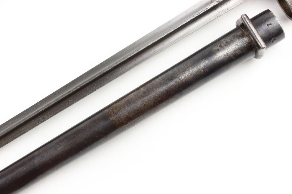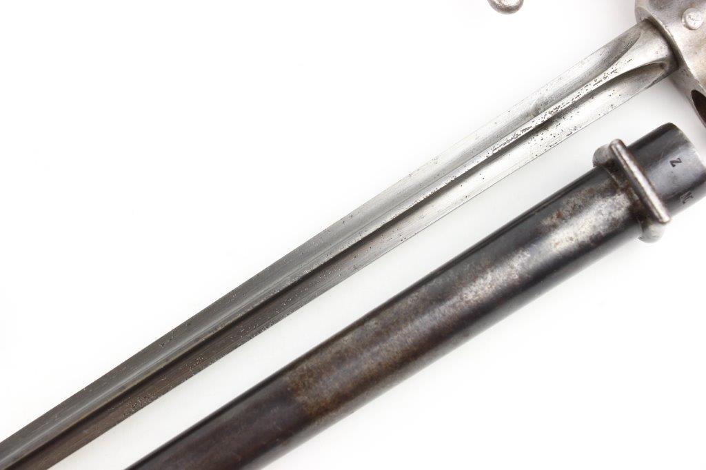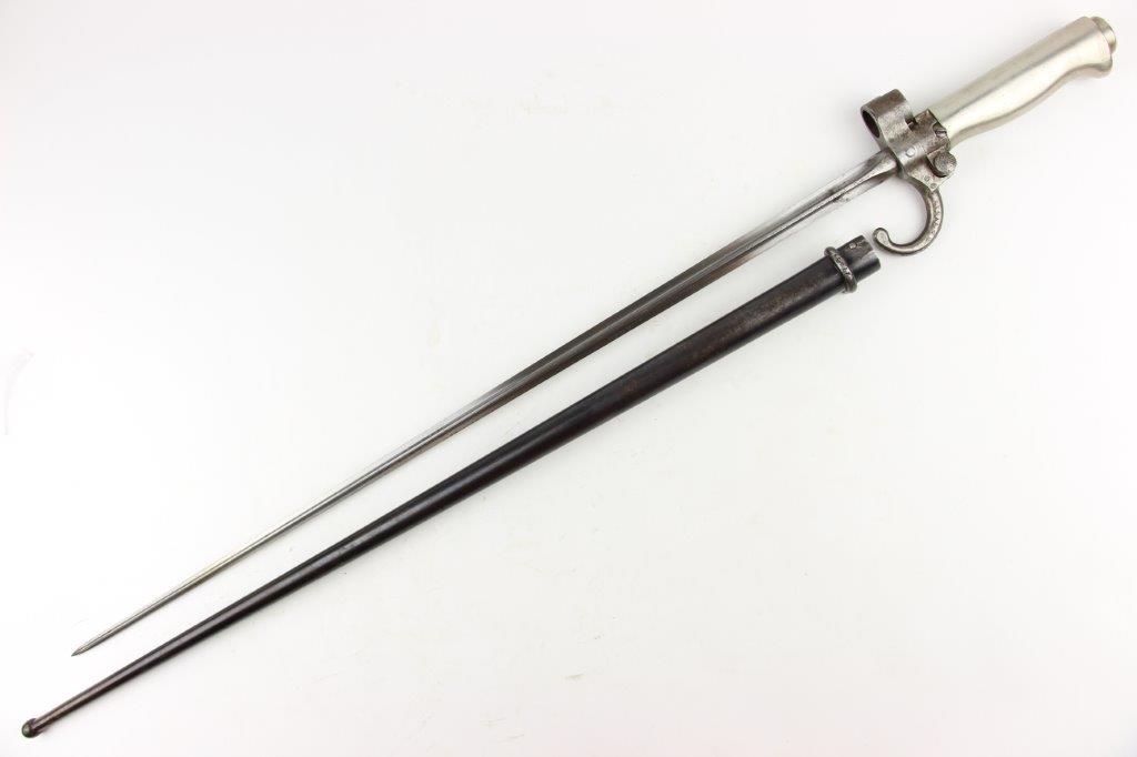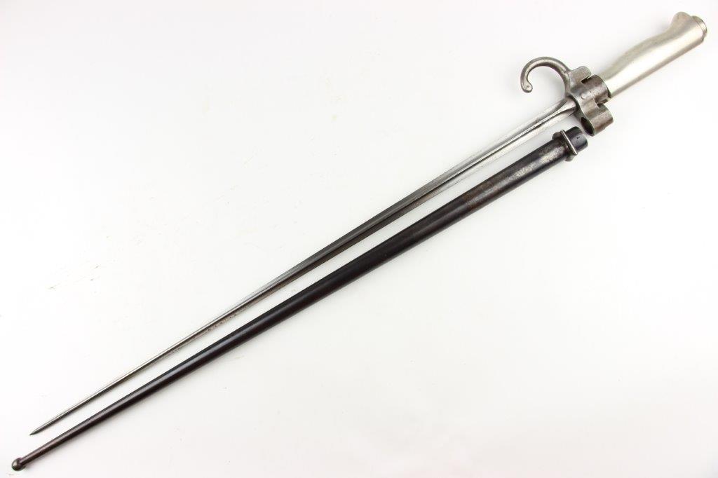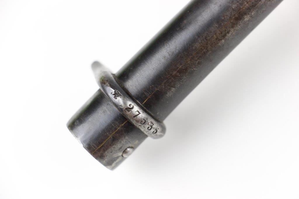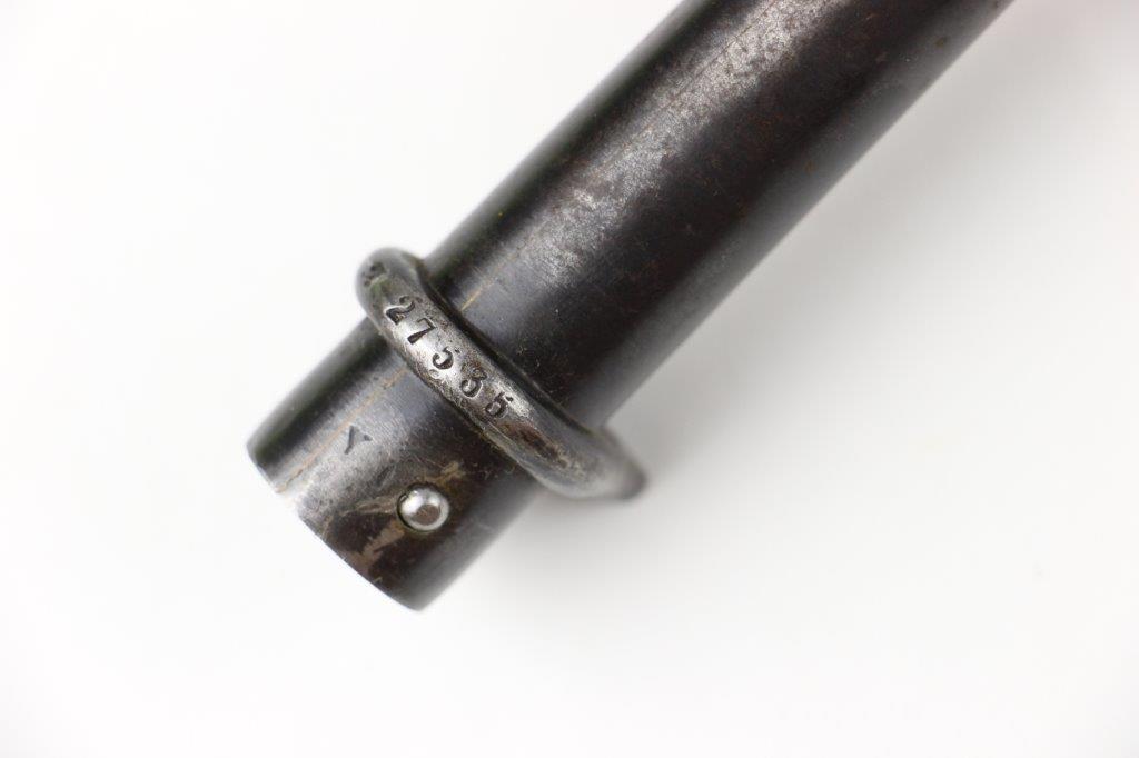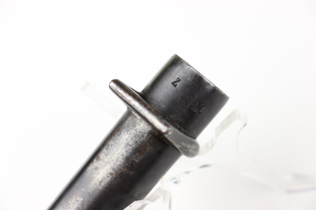 6/5/24 – This is an original WW1 era French Lebel M1886 Spike bayonet. The bayonet comes with an original metal ball-tipped scabbard. The bayonet blade measures 20.5 inches, and overall length is 25.25 inches. The blade has spotty surface oxidation throughout but no rust or major issues. The hooked quillion is serial numbered and proof stamped. Functional push-button release and excellent aluminum alloy handle. The scabbard has original blued finish with light finish loss, thinning, and mild patina throughout. Serial numbered on the top band near the mouth, but the numbers do not match. Great overall condition with no notable issues.