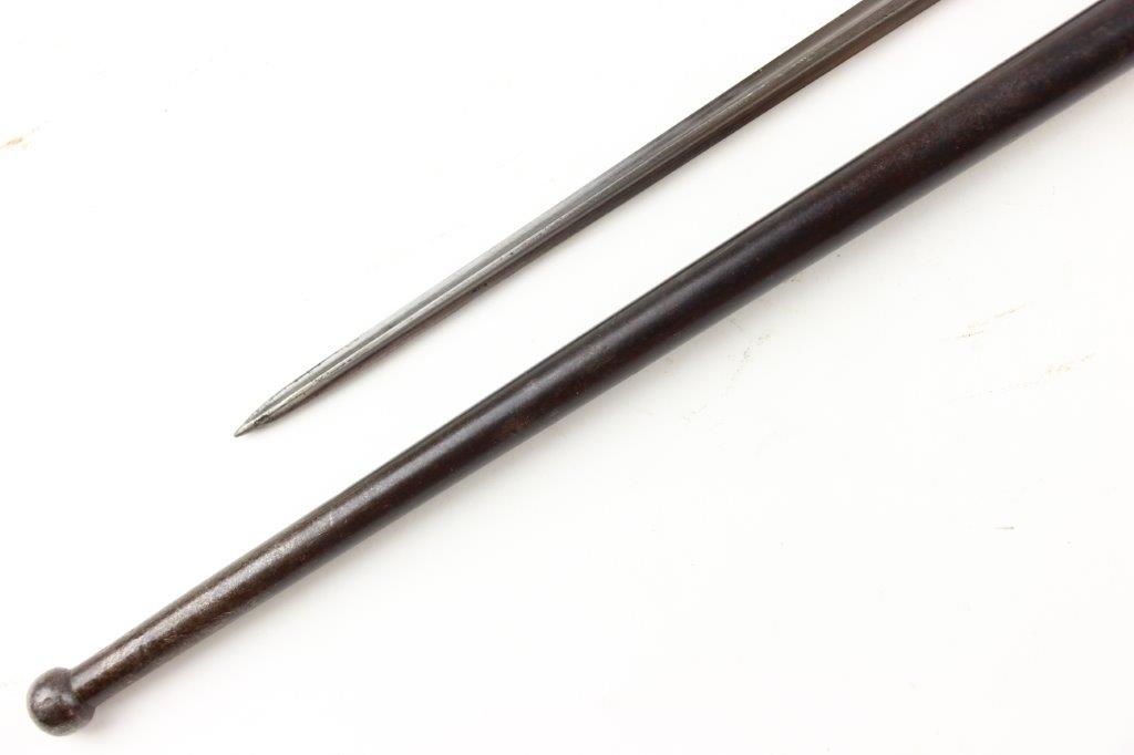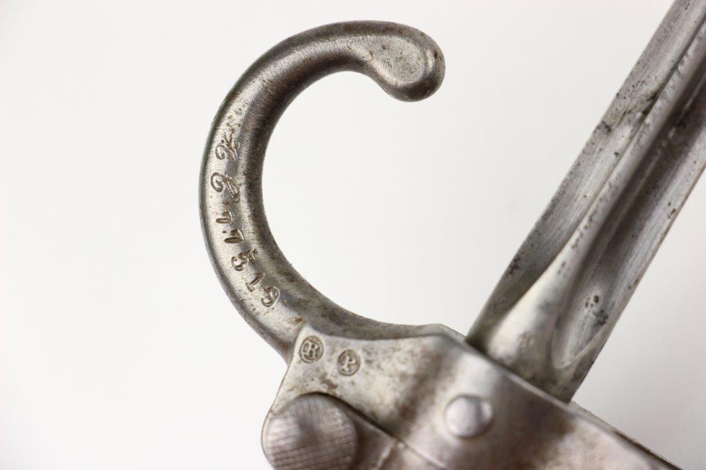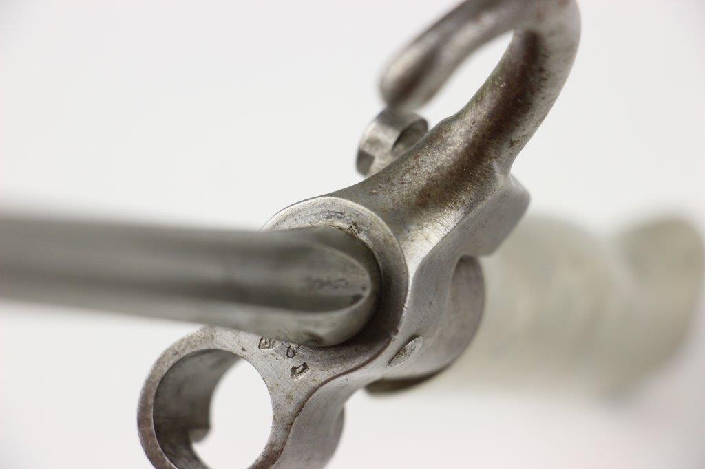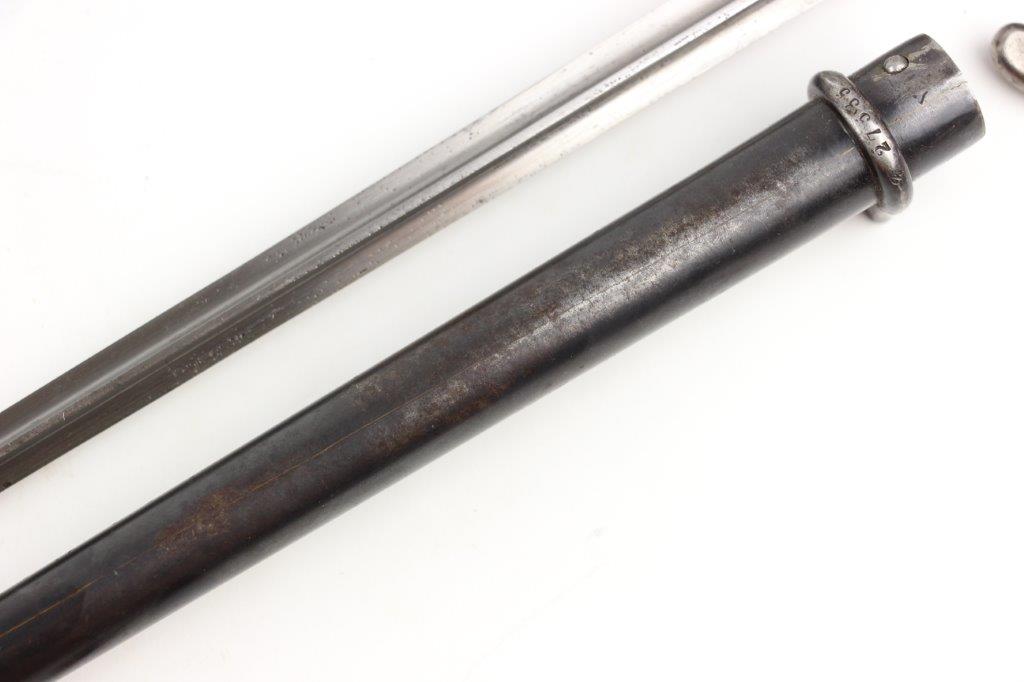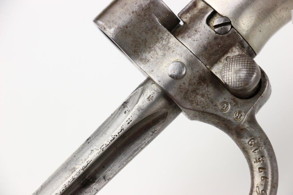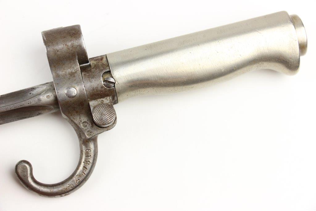 6/5/24 – This is an original WW1 era French Lebel M1886 Spike bayonet. The bayonet comes with an original metal ball-tipped scabbard. The bayonet blade measures 20.5 inches, and overall length is 25.25 inches. The blade has spotty surface oxidation throughout but no rust or major issues. The hooked quillion is serial numbered and proof stamped. Functional push-button release and excellent aluminum alloy handle. The scabbard has original blued finish with light finish loss, thinning, and mild patina throughout. Serial numbered on the top band near the mouth, but the numbers do not match. Great overall condition with no notable issues.