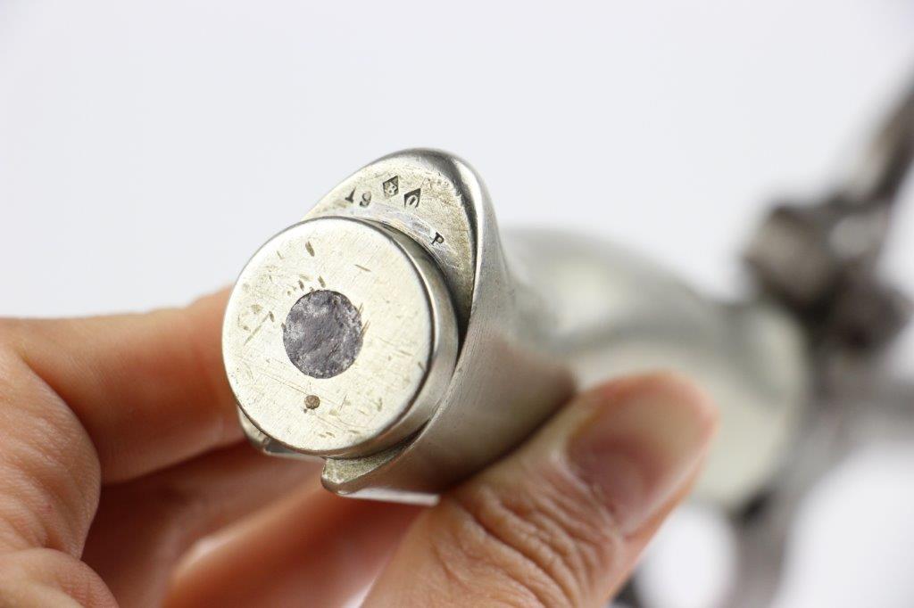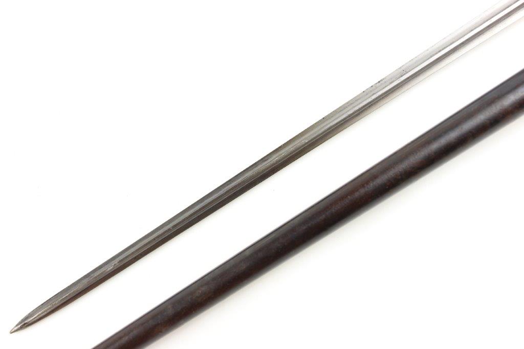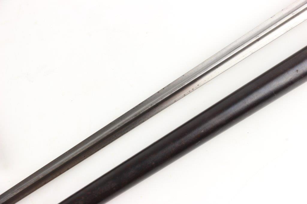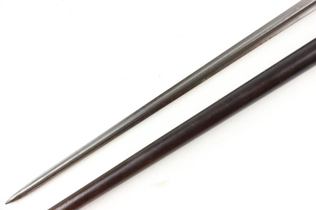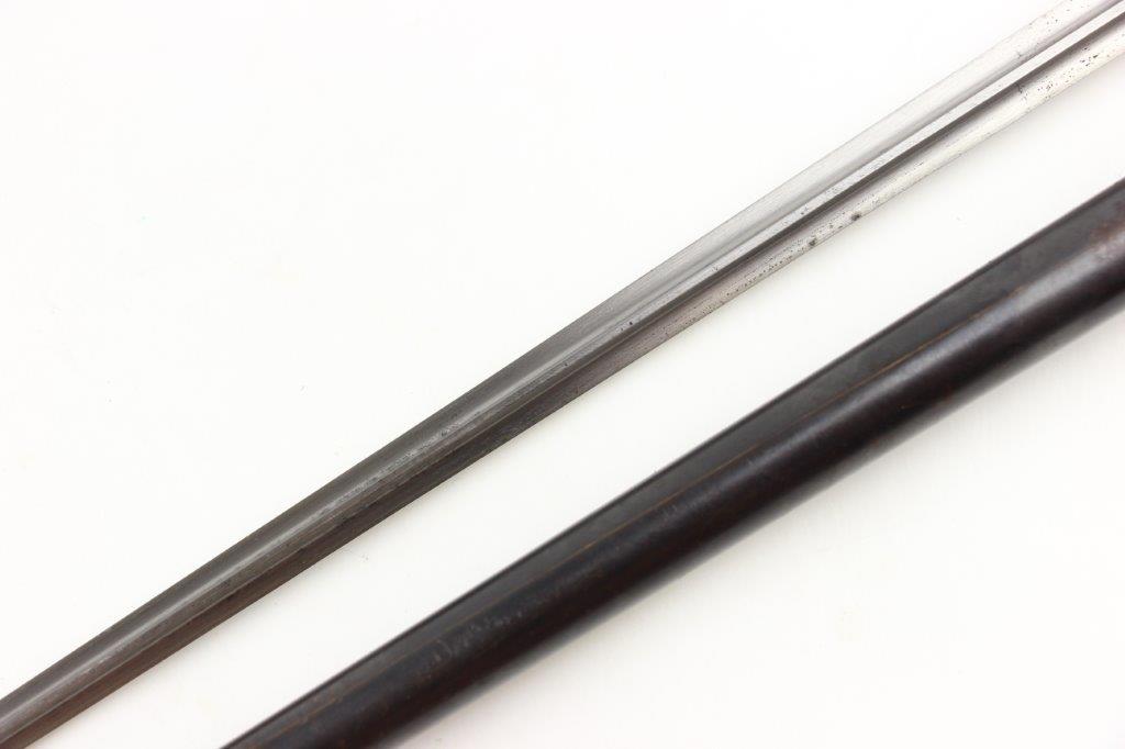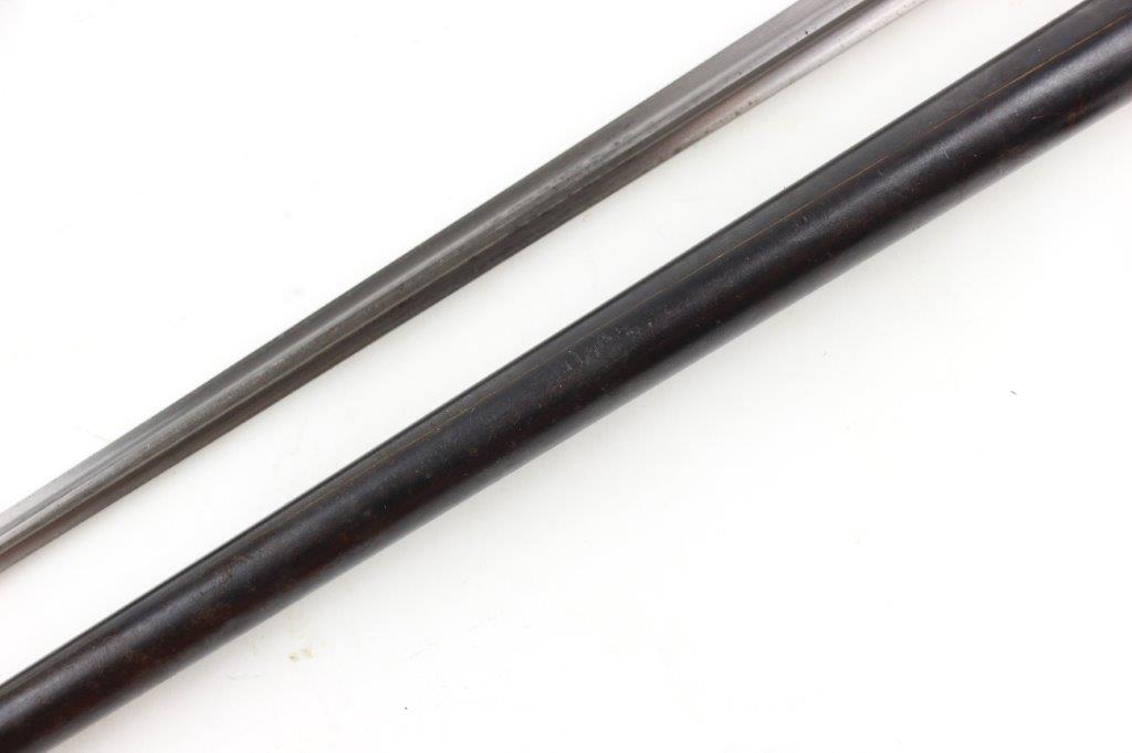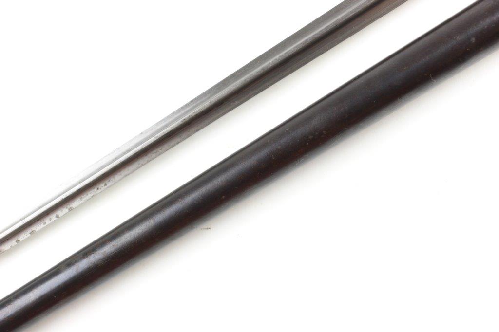 6/5/24 – This is an original WW1 era French Lebel M1886 Spike bayonet. The bayonet comes with an original metal ball-tipped scabbard. The bayonet blade measures 20.5 inches, and overall length is 25.25 inches. The blade has spotty surface oxidation throughout but no rust or major issues. The hooked quillion is serial numbered and proof stamped. Functional push-button release and excellent aluminum alloy handle. The scabbard has original blued finish with light finish loss, thinning, and mild patina throughout. Serial numbered on the top band near the mouth, but the numbers do not match. Great overall condition with no notable issues.