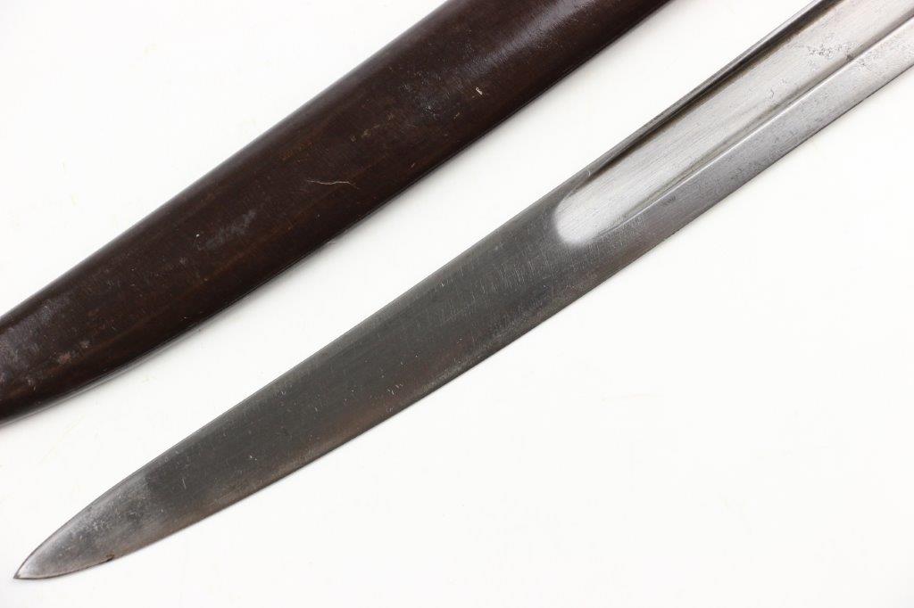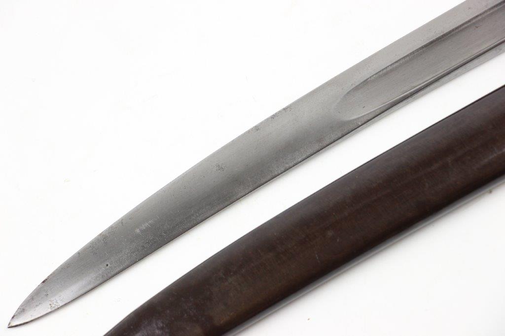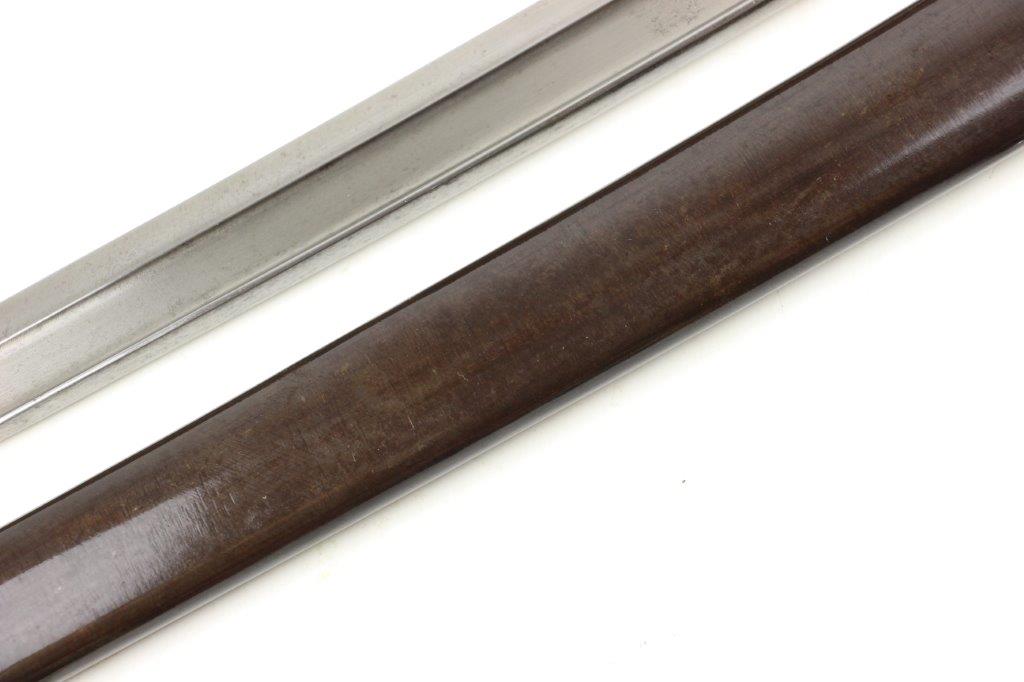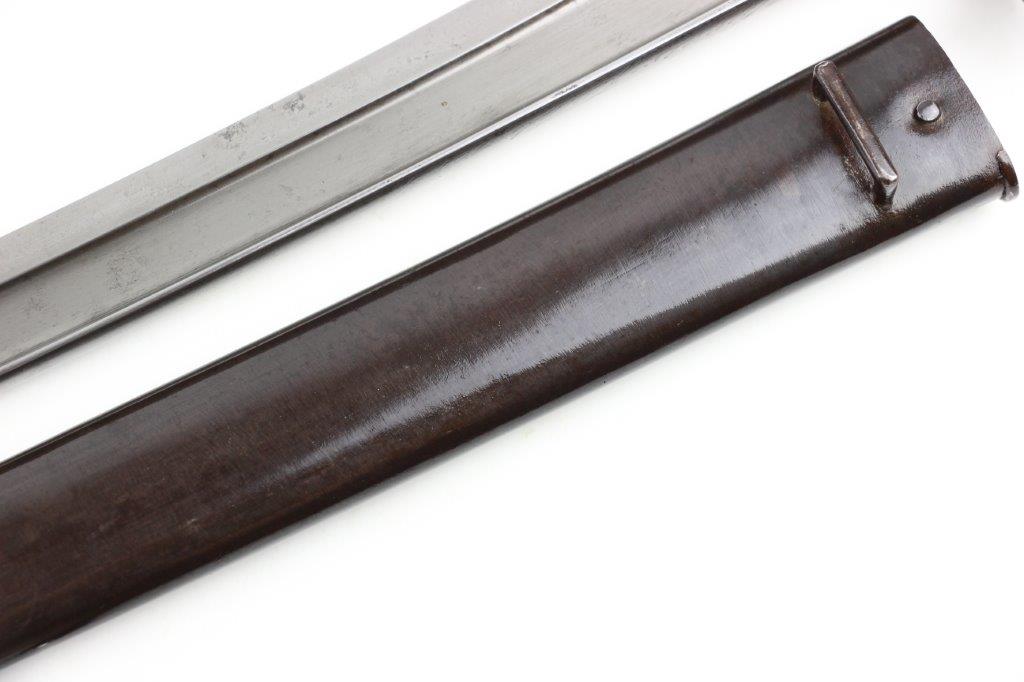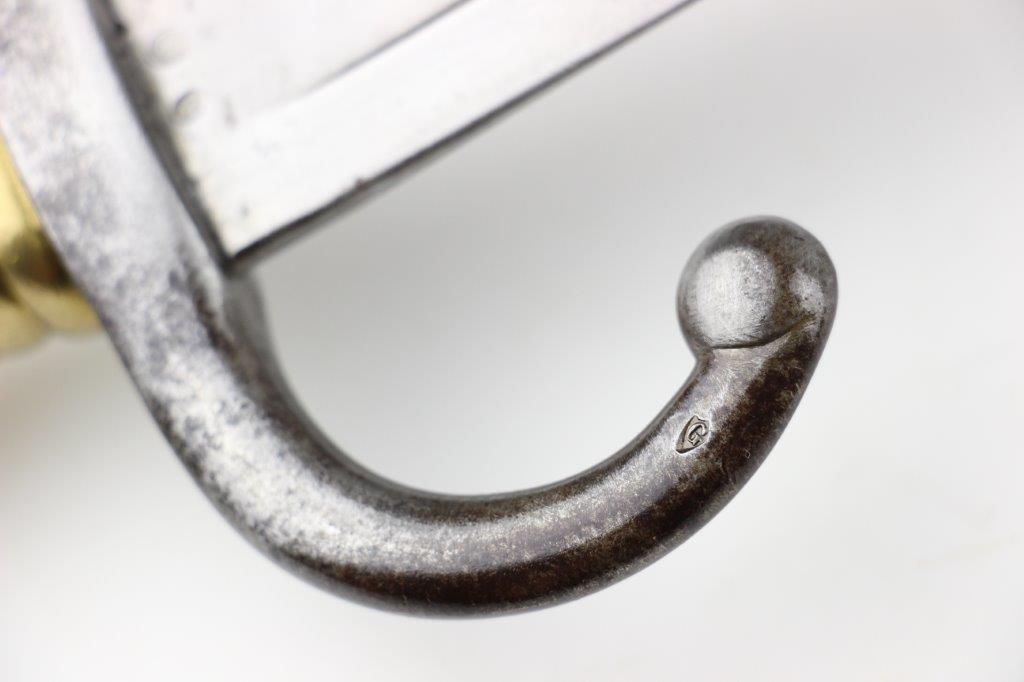 6/19/24 – This is an original French M1866 Chassepot Sword Bayonet. The bayonet blade is maker marked on the spine by St. Etienne and 1872 dated. The curved blade measures about 575mm long, and the overall length is about 698mm. There’s some light surface patina and oxidation on the blade, but overall this example is in great shape with a clean edge. Properly proofed at the base of the blade and on the hooked quillion. The brass handle is in great shape. Comes with an original scabbard that fits nicely and has dark patina throughout. No dents or major issues.