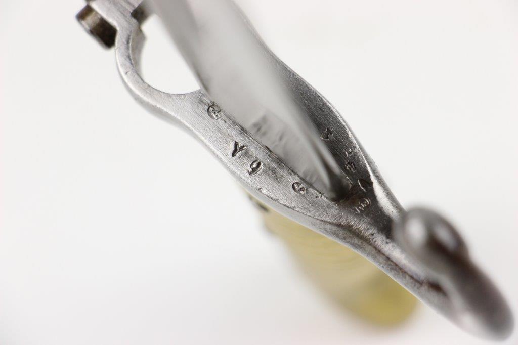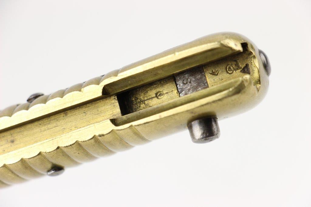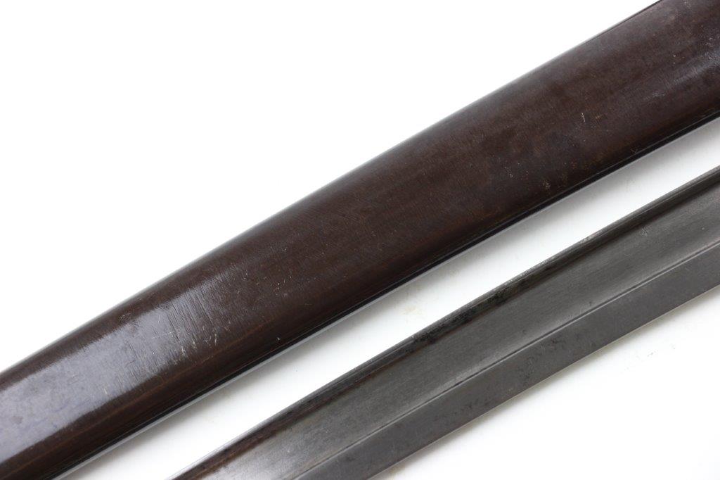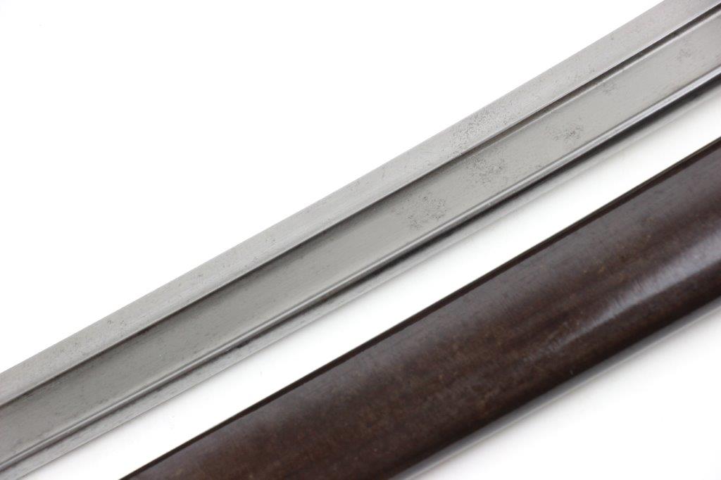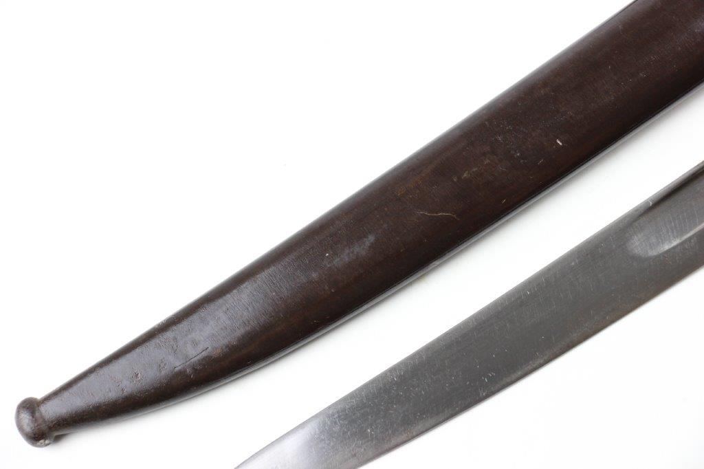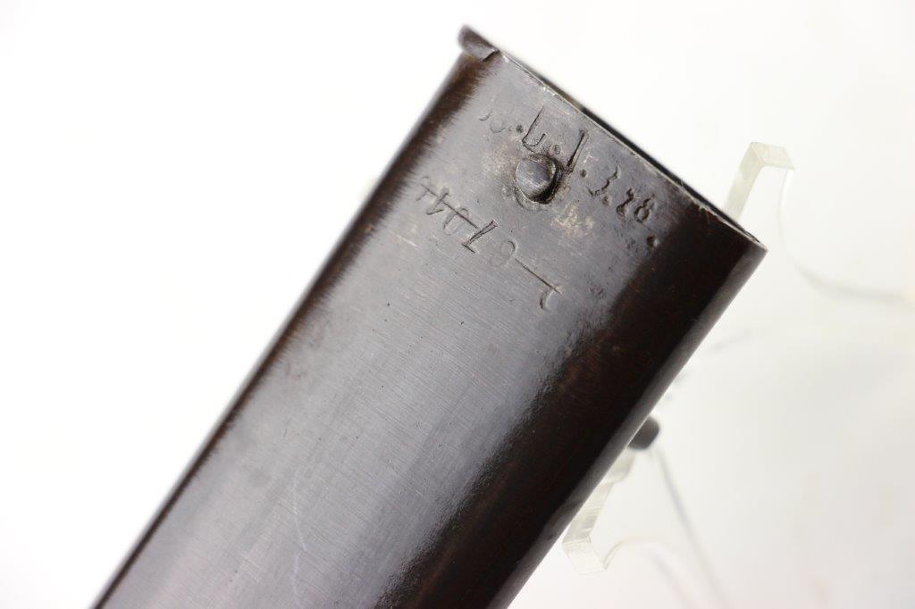 6/19/24 – This is an original French M1866 Chassepot Sword Bayonet. The bayonet blade is maker marked on the spine by St. Etienne and 1872 dated. The curved blade measures about 575mm long, and the overall length is about 698mm. There’s some light surface patina and oxidation on the blade, but overall this example is in great shape with a clean edge. Properly proofed at the base of the blade and on the hooked quillion. The brass handle is in great shape. Comes with an original scabbard that fits nicely and has dark patina throughout. No dents or major issues.