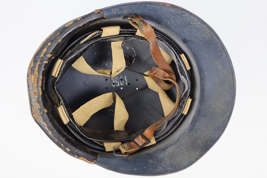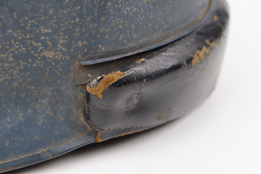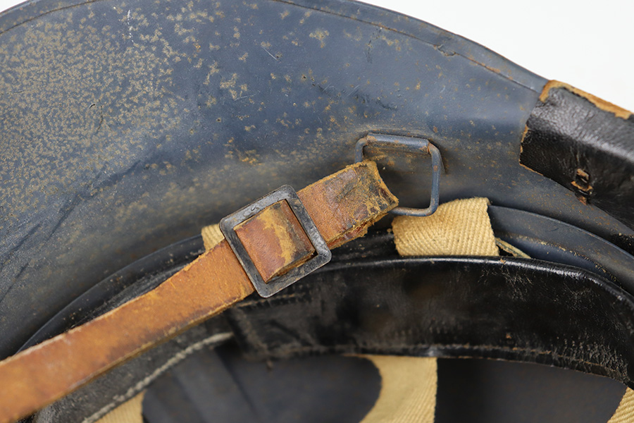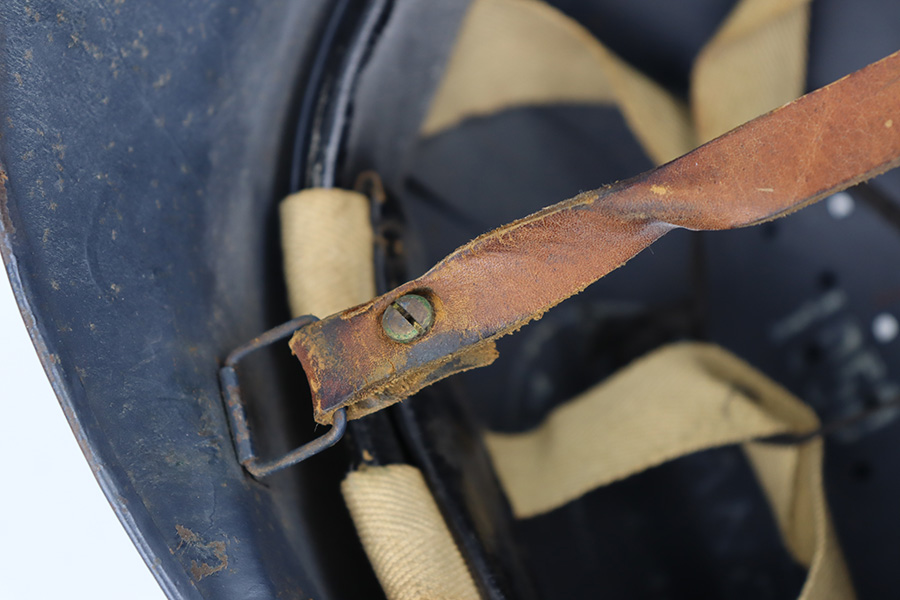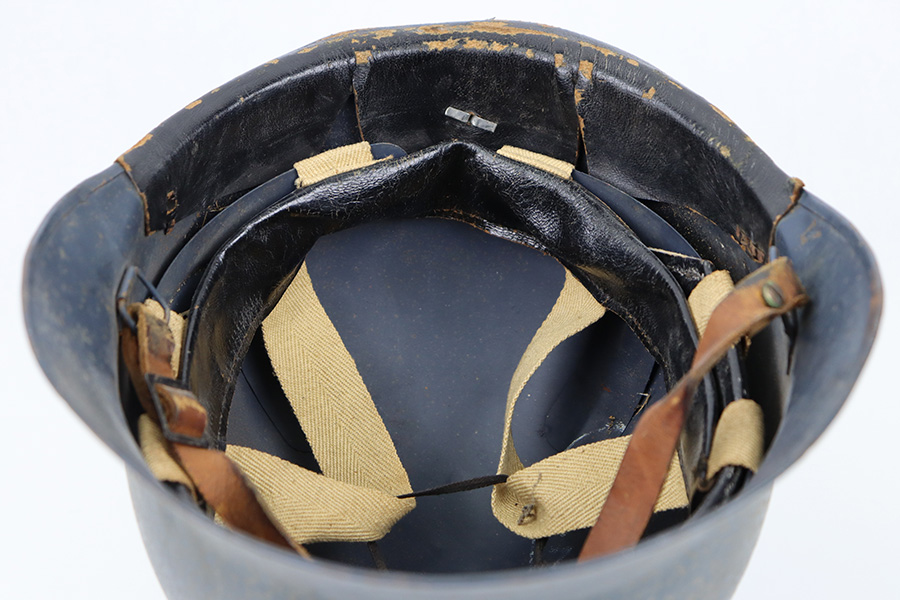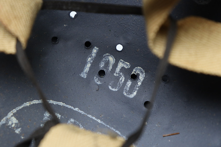 11/14/23 – This is a 1950 production French M45 Tanker Helmet. The helmet features a front leather “bump protection” exterior headband. The leather has some mild surface wear and signs of aging but is still completely intact and original. The helmet shell has no dents or major issues, but there’s mild surface speckling discoloration throughout the shell. Exterior metal comb intact. The interior of the shell is maker and date marked (interior crown), but the maker is too faint to read. Nice interior liner is in original configuration. Leather chinstrap intact as well.