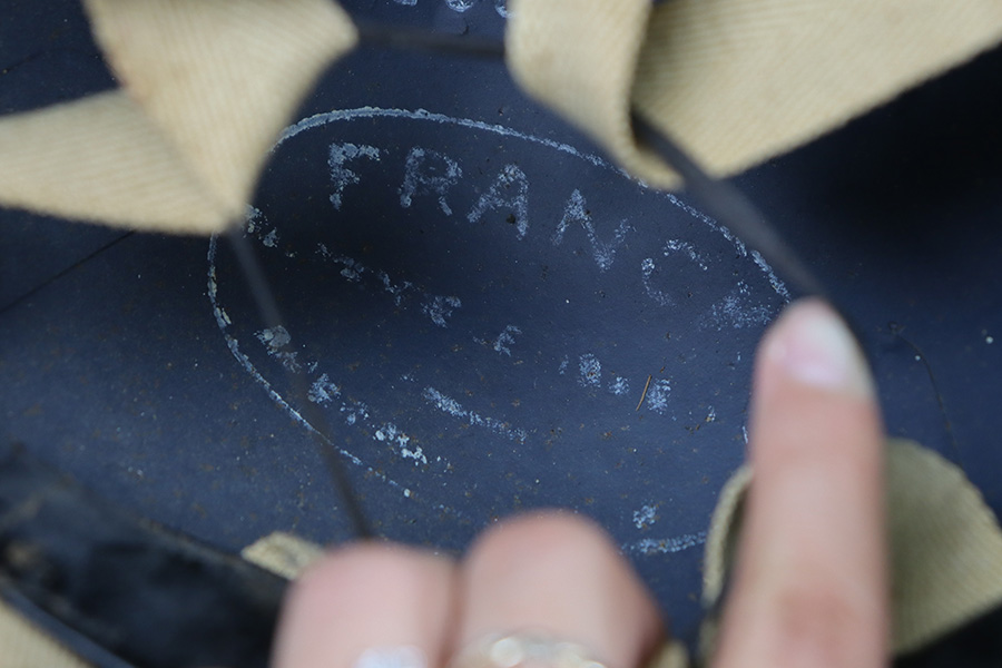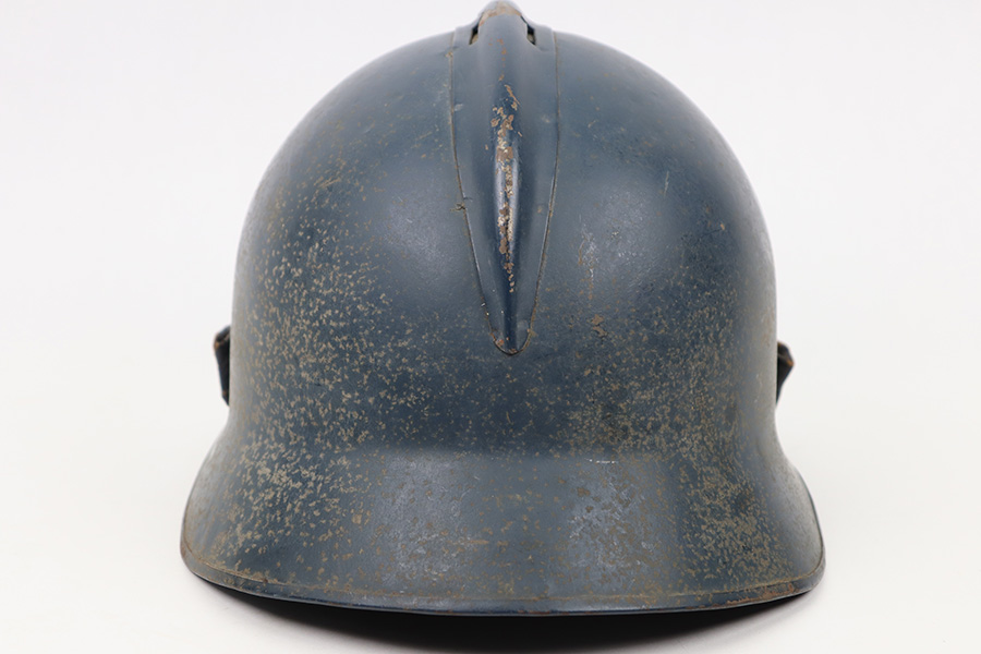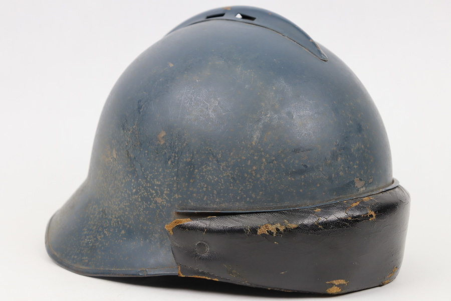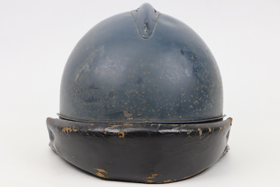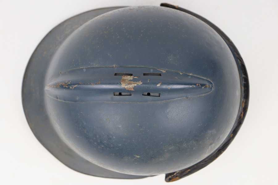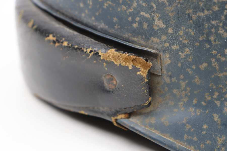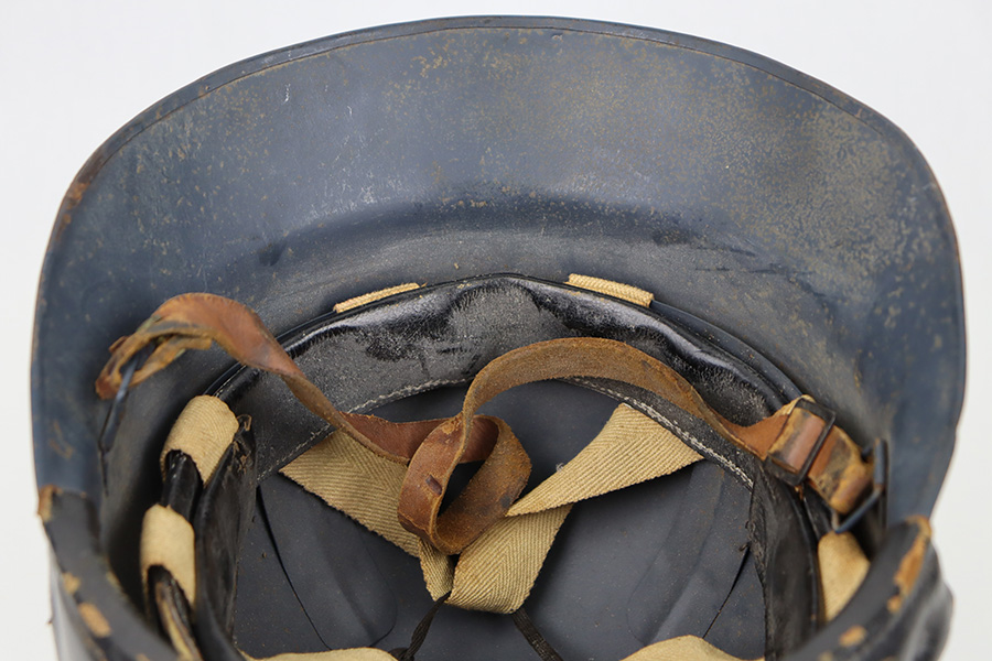 11/14/23 – This is a 1950 production French M45 Tanker Helmet. The helmet features a front leather “bump protection” exterior headband. The leather has some mild surface wear and signs of aging but is still completely intact and original. The helmet shell has no dents or major issues, but there’s mild surface speckling discoloration throughout the shell. Exterior metal comb intact. The interior of the shell is maker and date marked (interior crown), but the maker is too faint to read. Nice interior liner is in original configuration. Leather chinstrap intact as well.