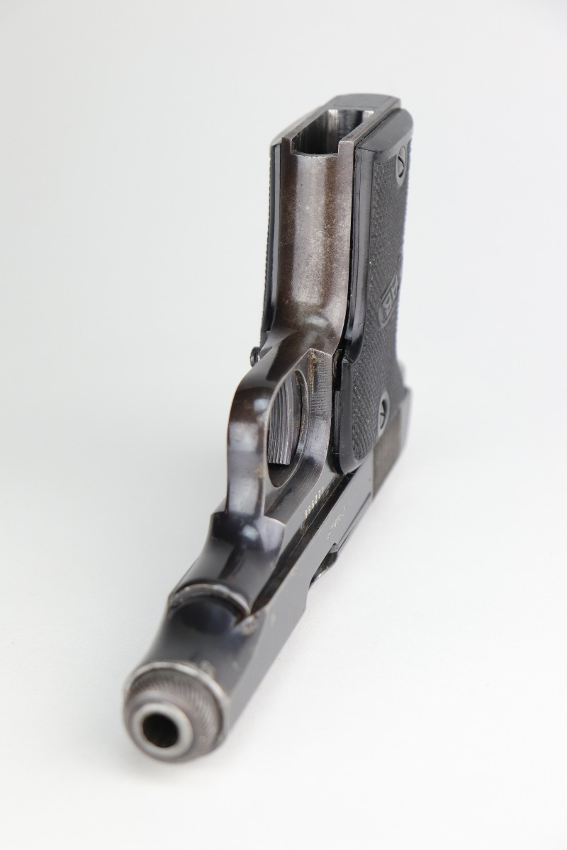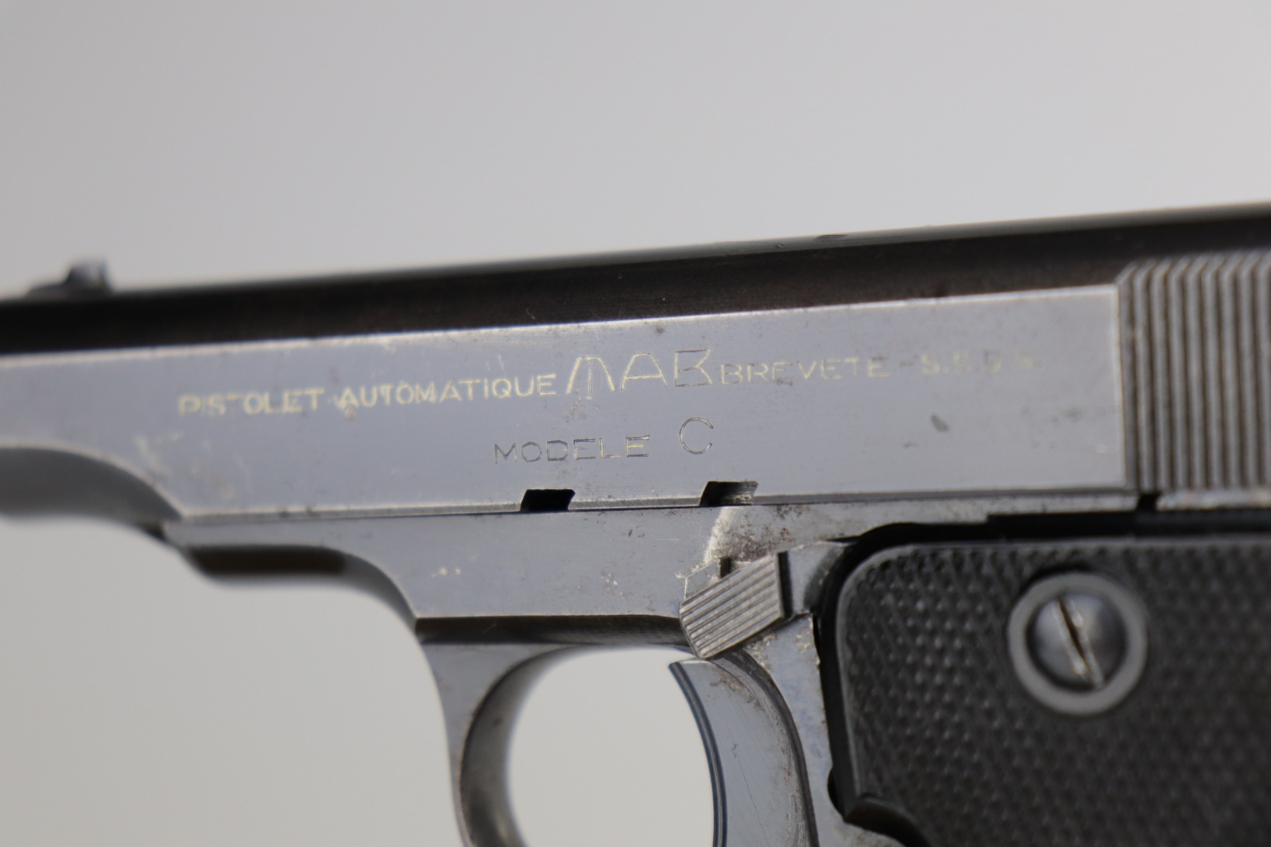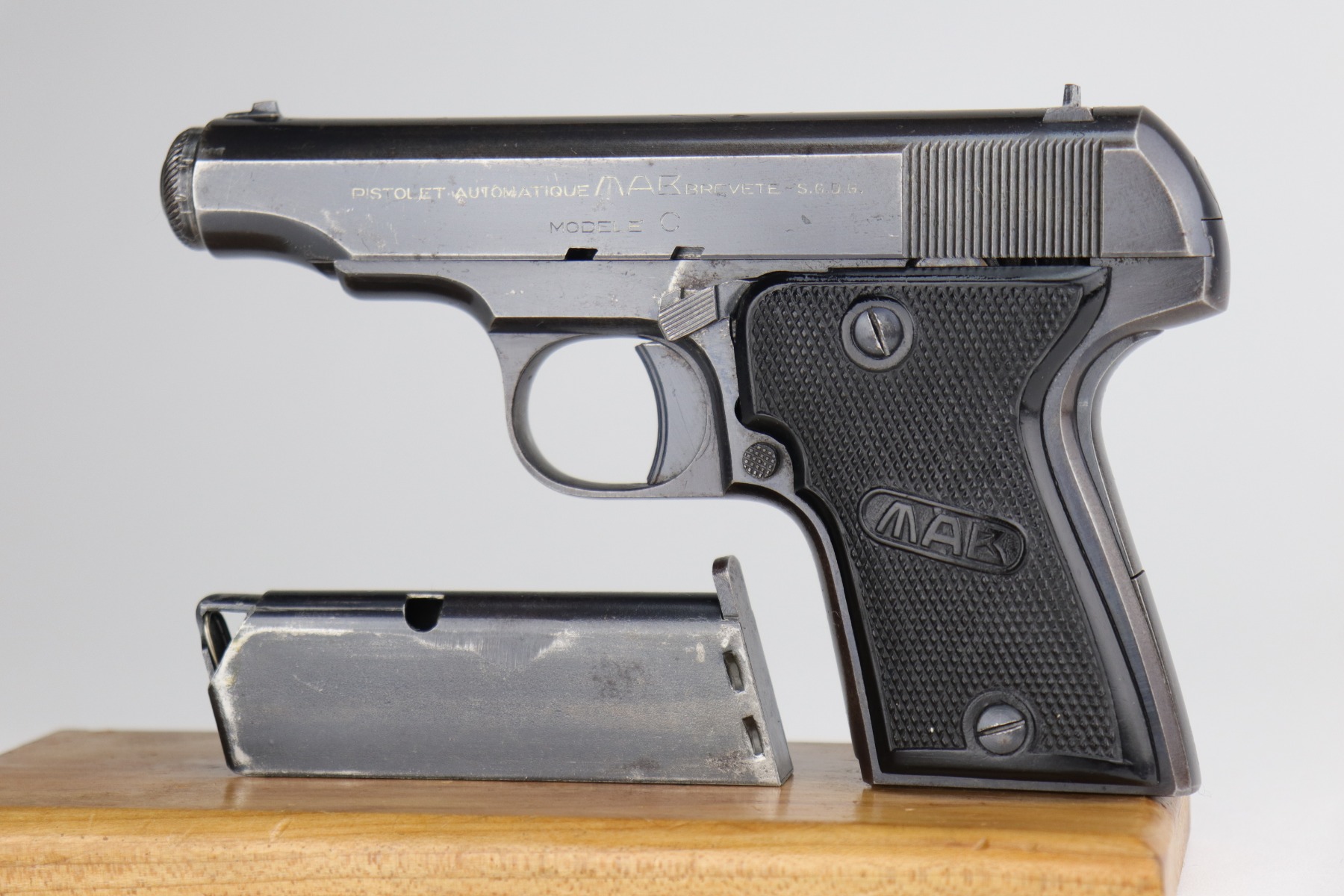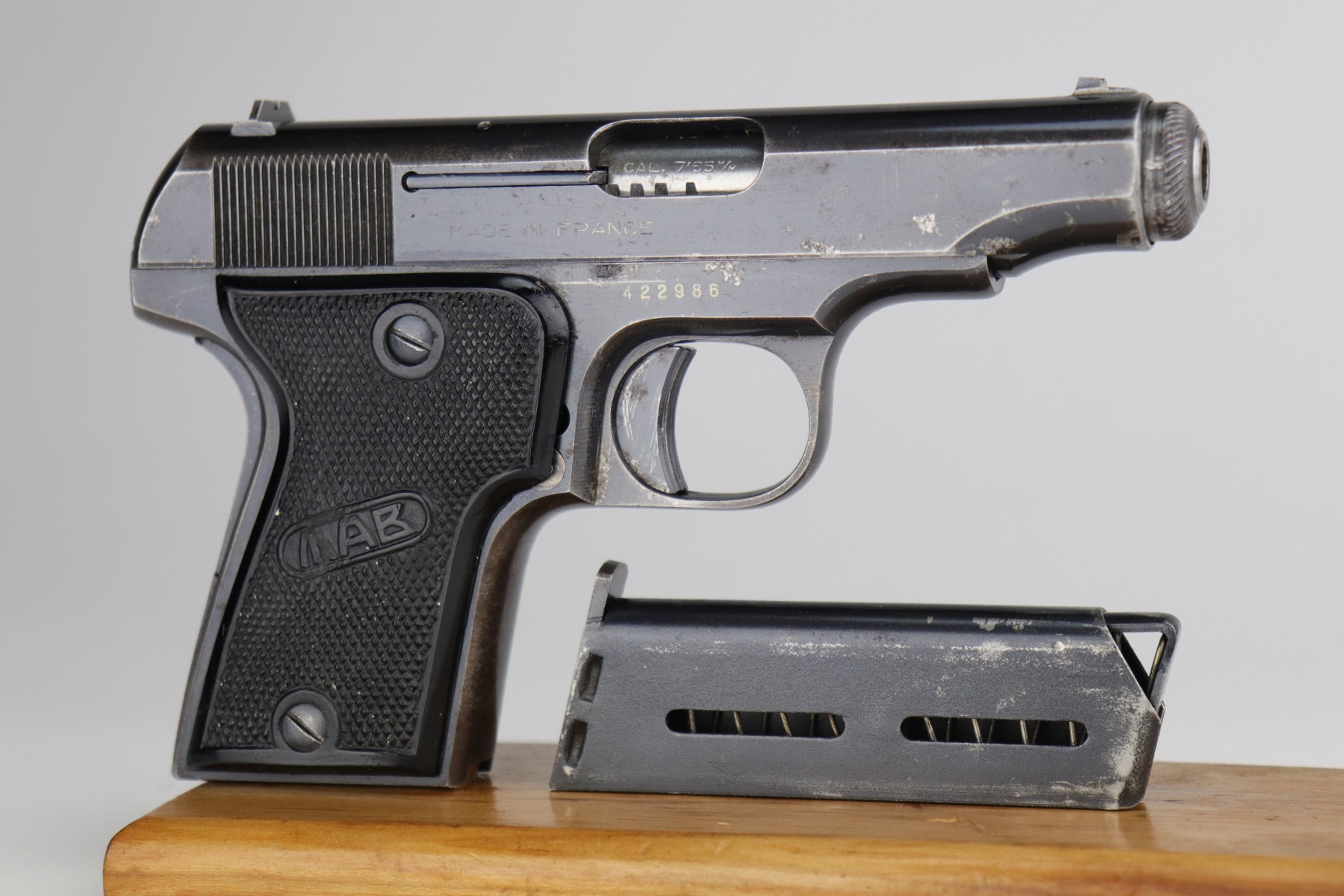 11/4/20 – This is a nice example of a French-made MAB Model C, chambered in 7.65mm. We believe it was likely manufactured just after WW2. It has a “Made in France” marking on the right side of the slide. The gun is fully functional and has retained roughly 85% of its original bluing. There is minor high edge wear on the slide and areas of splotchy discoloration, most noticeable on the right side of the gun. There is wear on the front strap and spotty oxidation on both straps. There is a scratch and a small ding on the top of the slide. Comes with nice original grips and one period-correct magazine. The bore has strong rifling, but there is minor oxidation throughout.