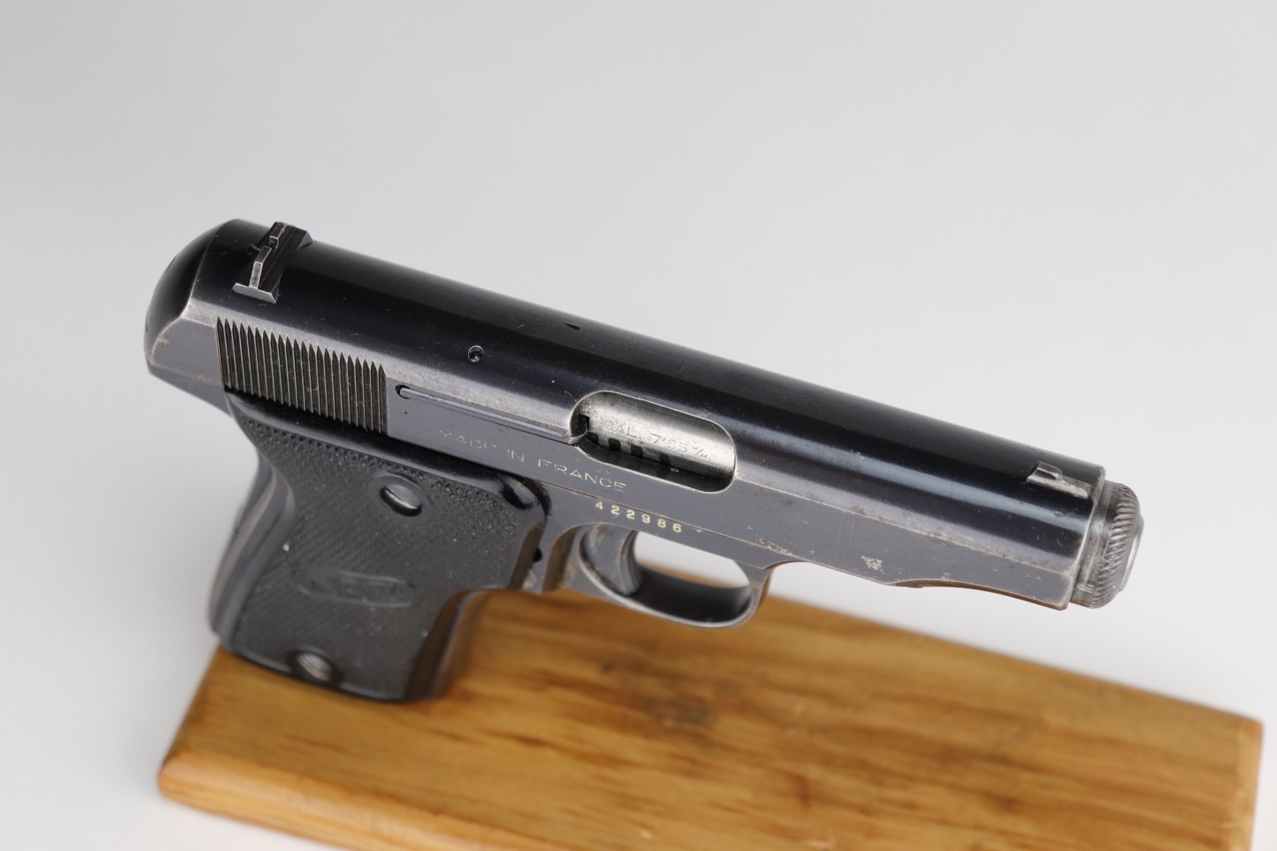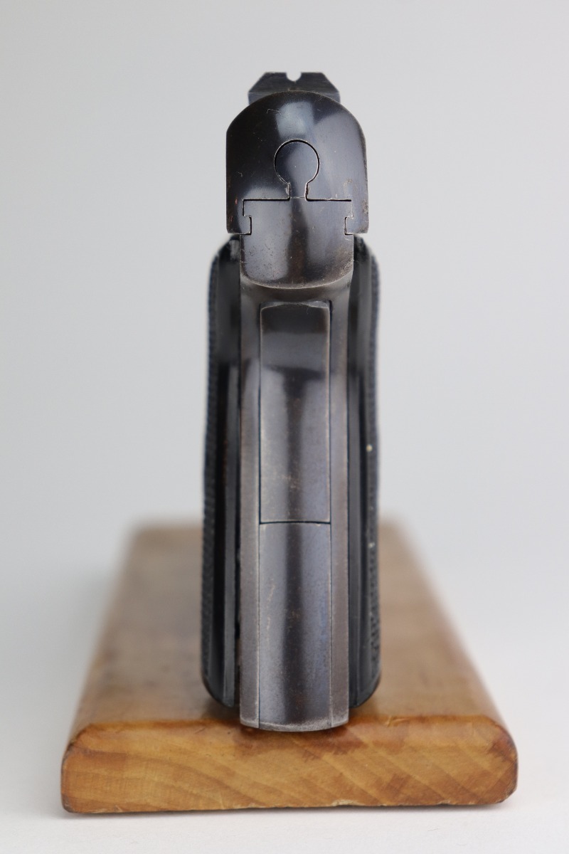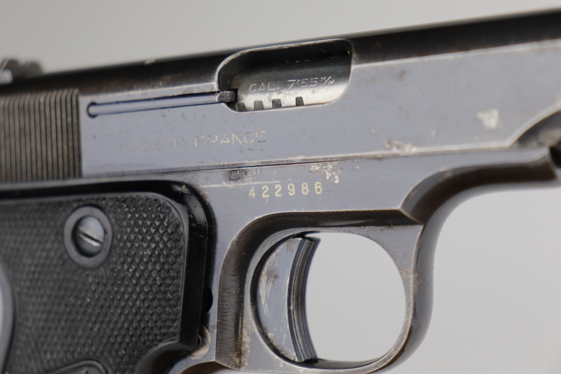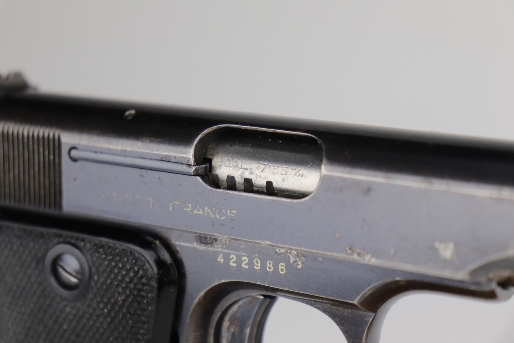 11/4/20 – This is a nice example of a French-made MAB Model C, chambered in 7.65mm. We believe it was likely manufactured just after WW2. It has a “Made in France” marking on the right side of the slide. The gun is fully functional and has retained roughly 85% of its original bluing. There is minor high edge wear on the slide and areas of splotchy discoloration, most noticeable on the right side of the gun. There is wear on the front strap and spotty oxidation on both straps. There is a scratch and a small ding on the top of the slide. Comes with nice original grips and one period-correct magazine. The bore has strong rifling, but there is minor oxidation throughout.