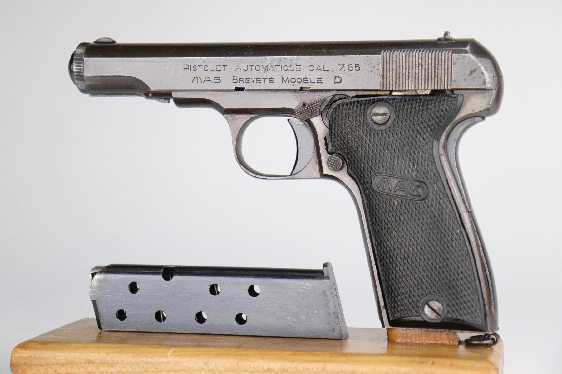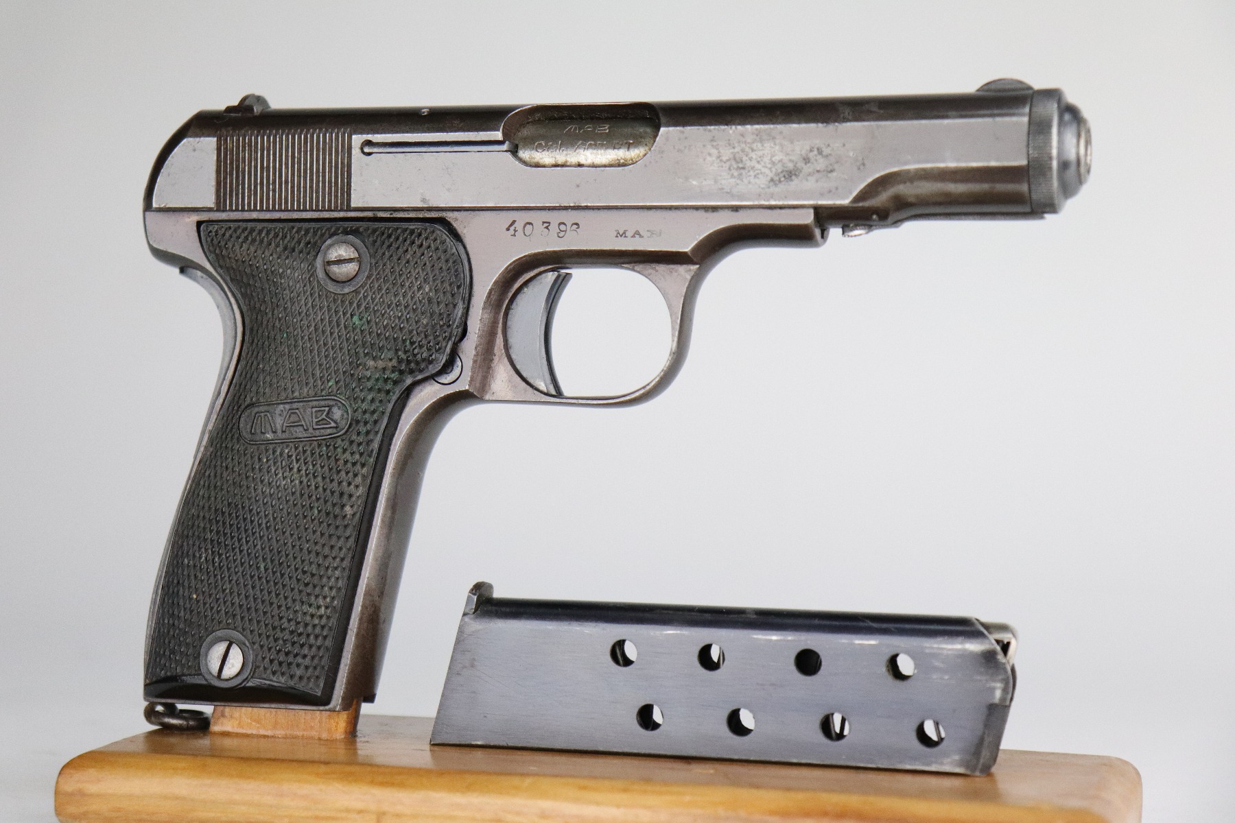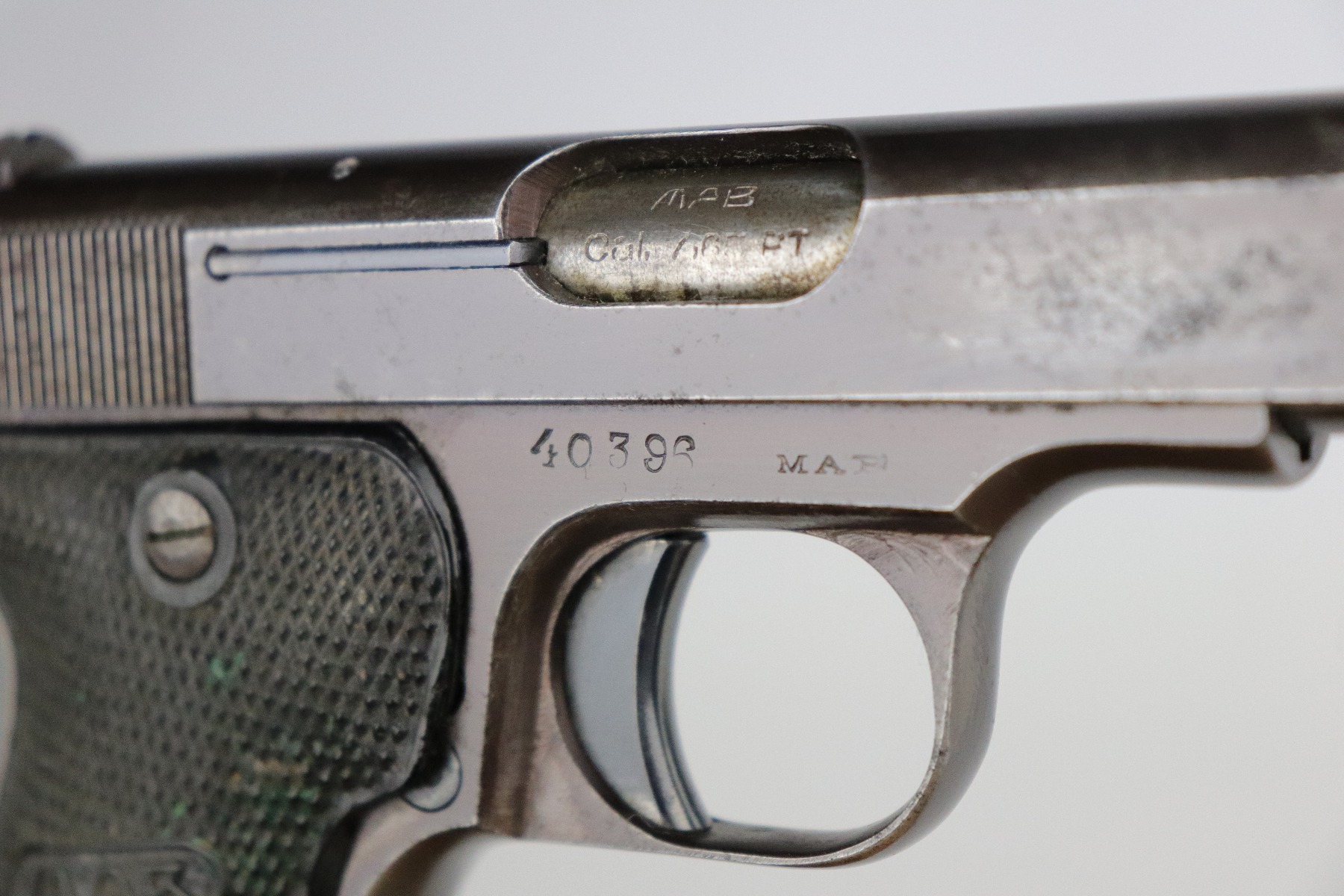 8/21/20 – This is an original French MAB Model D made for the commercial market in the late 1930’s. This gun has retained roughly 80-85% of its light plumb finish. Generally, there is thinning on the straps (especially the front strap), around some of the high edges, and a couple of areas on the right side of the slide. There are areas of minor pitting throughout but most noticeable toward the top edge of the left side of the slide, on the left side of the slide near the tang, and on the forward half of the right side of the slide. It comes with a period-correct magazine and period-correct MAB grips. The grips are in nice condition, but there is a chip toward the top of the left grip panel. The bore is nice, but there is some minor scratching.