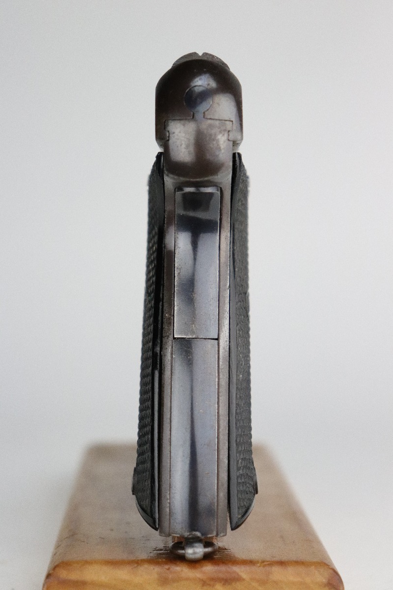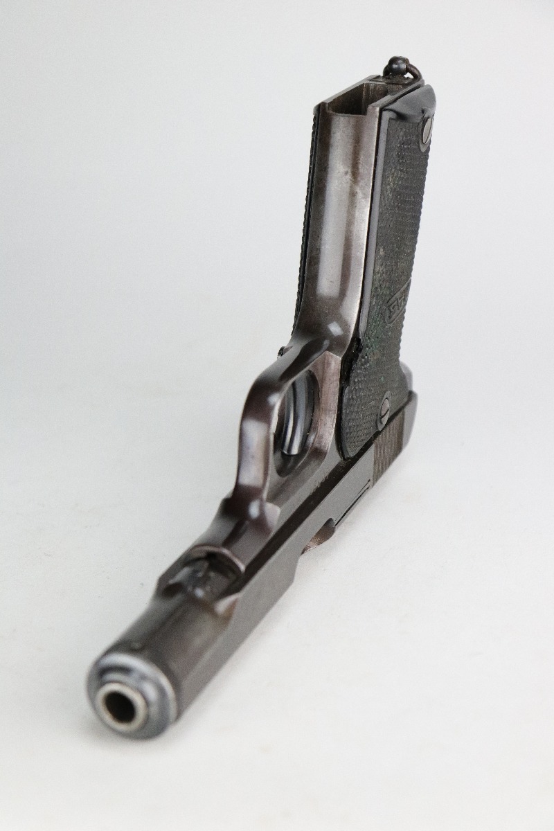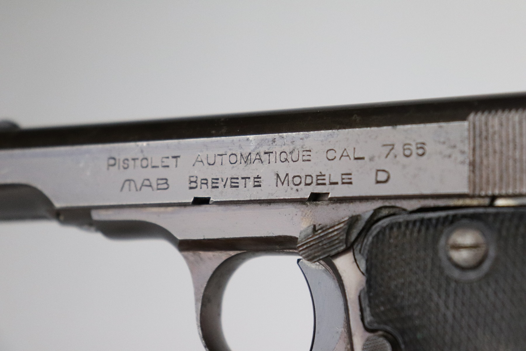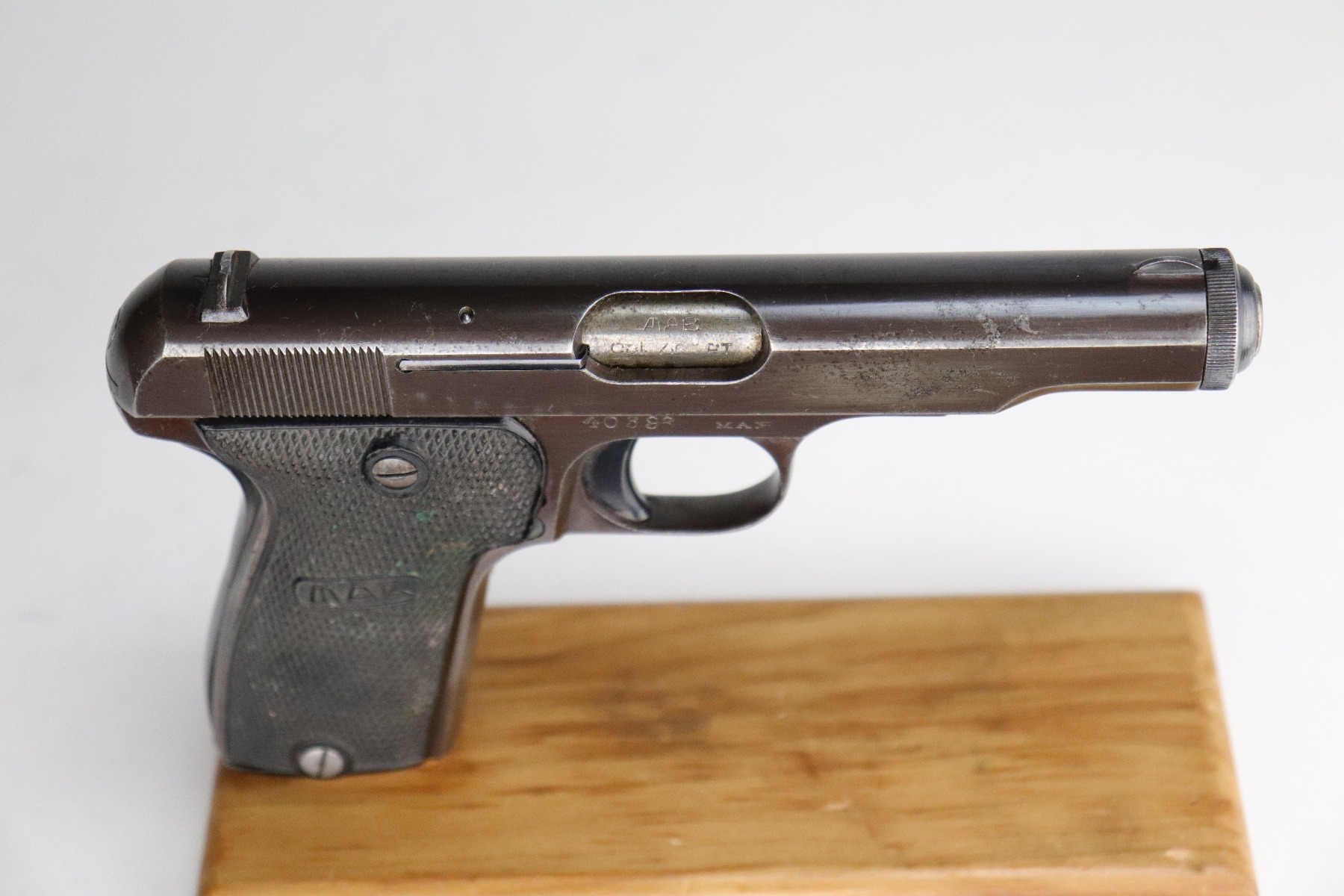 8/21/20 – This is an original French MAB Model D made for the commercial market in the late 1930’s. This gun has retained roughly 80-85% of its light plumb finish. Generally, there is thinning on the straps (especially the front strap), around some of the high edges, and a couple of areas on the right side of the slide. There are areas of minor pitting throughout but most noticeable toward the top edge of the left side of the slide, on the left side of the slide near the tang, and on the forward half of the right side of the slide. It comes with a period-correct magazine and period-correct MAB grips. The grips are in nice condition, but there is a chip toward the top of the left grip panel. The bore is nice, but there is some minor scratching.