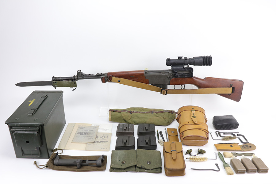 10/7/21 – This is a beautiful example of a French military rifle known as the Model 1949-56 and produced by MAS, and includes a large array of additional accessories. The MAS 1949-56 is a reliable, accurate, easy to maintain semi-automatic rifle with a detachable 10-round magazine and a side rail designed to allow for attachable rifle scopes. The MAS 49-56 is the 1956 adaptation of the MAS-49, which was adopted as standard issue for the French army in 1949. The 49/56 improved upon the original model based on its usage in Algeria, Indochina, and the Suez Crisis. The 49/56 was made shorter and lighter, a knife bayonet was added, and the built in grenade launcher was altered to combine a compensator with a rifle grenade launcher that fired 22mm rifle grenades. The MAS-49/56 saw significantly more production than the original MAS-49 (275,240 versus 20,600) and saw action in French conflicts around the world until it was replaced by the FAMAS in 1979. This particular rifle has a minty receiver and is chambered for 7.5mm. Original sling is present and stock is in excellent condition with no major flaws. There is a small import mark on the left side of the receiver. Excellent bore. The listing includes the sniper scope with mount, as well as the canvas cover. It also comes with a night sight device muzzle attachment, bayonet, four spare magazines, original manuals, the scope case and more. Just a fantastic grouping overall that you likely won’t upgrade any time soon.