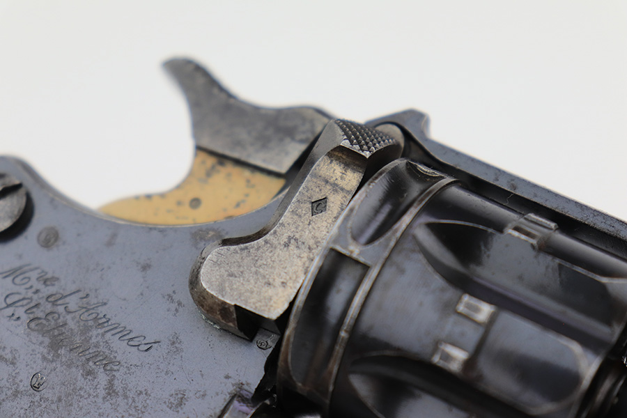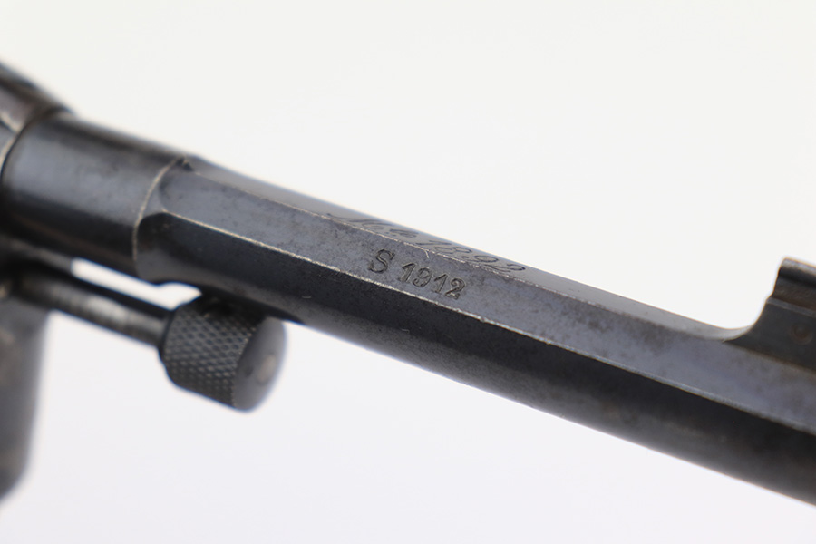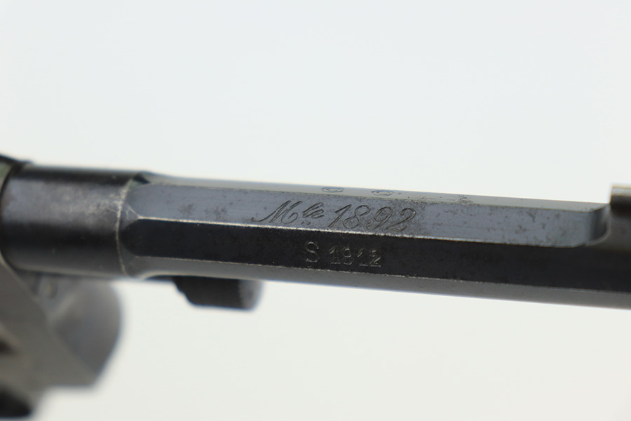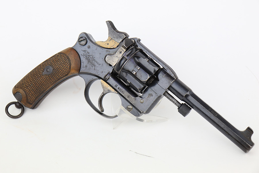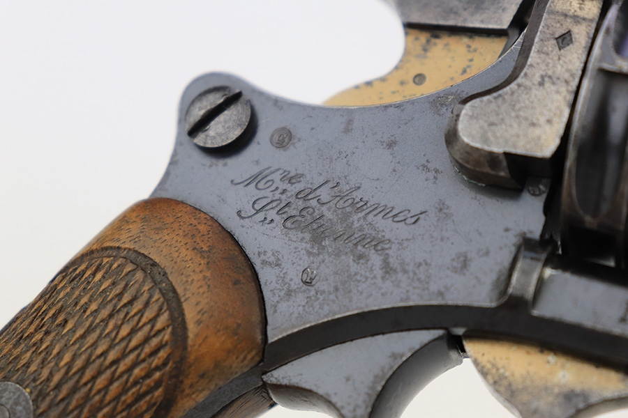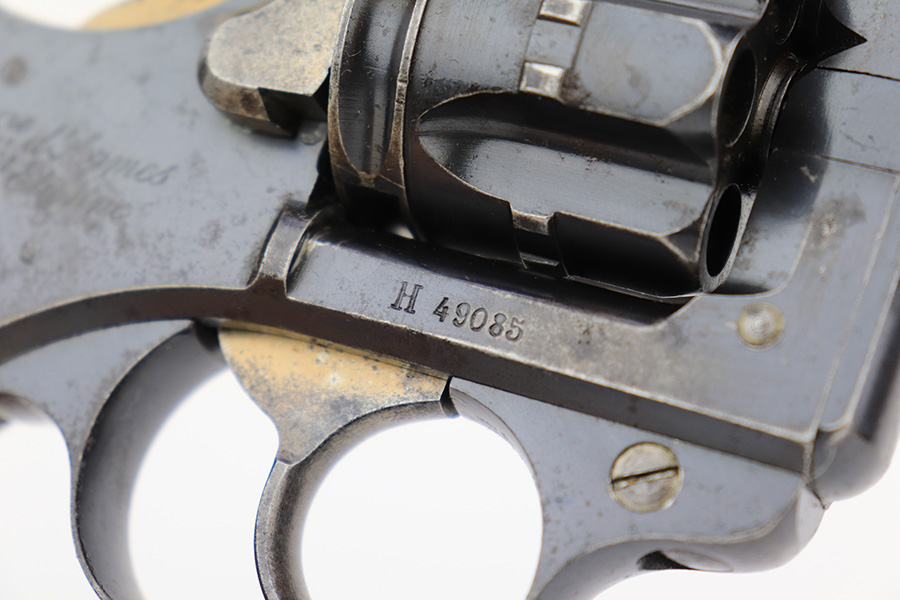 3/21/23 – This is a nice French MAS M1892 Lebel revolver from 1912. It is all matching, and there appears to be some sort of retailer marking on the left side of the frame. Generally, there is wear around the high edges and some light spotty oxidation with pin-pricking throughout. Some light scratching on the left side of the frame. Comes with nice wood grips. Very nice bore with strong rifling.