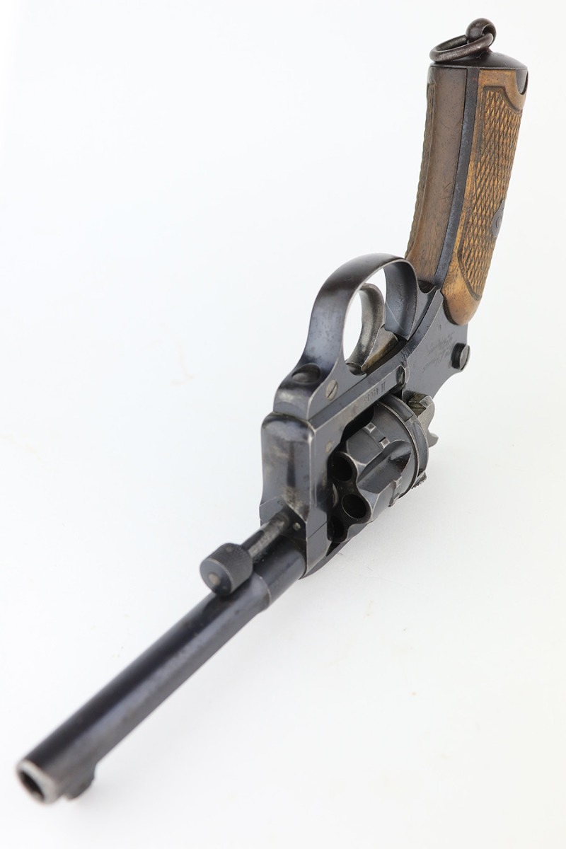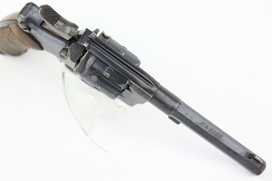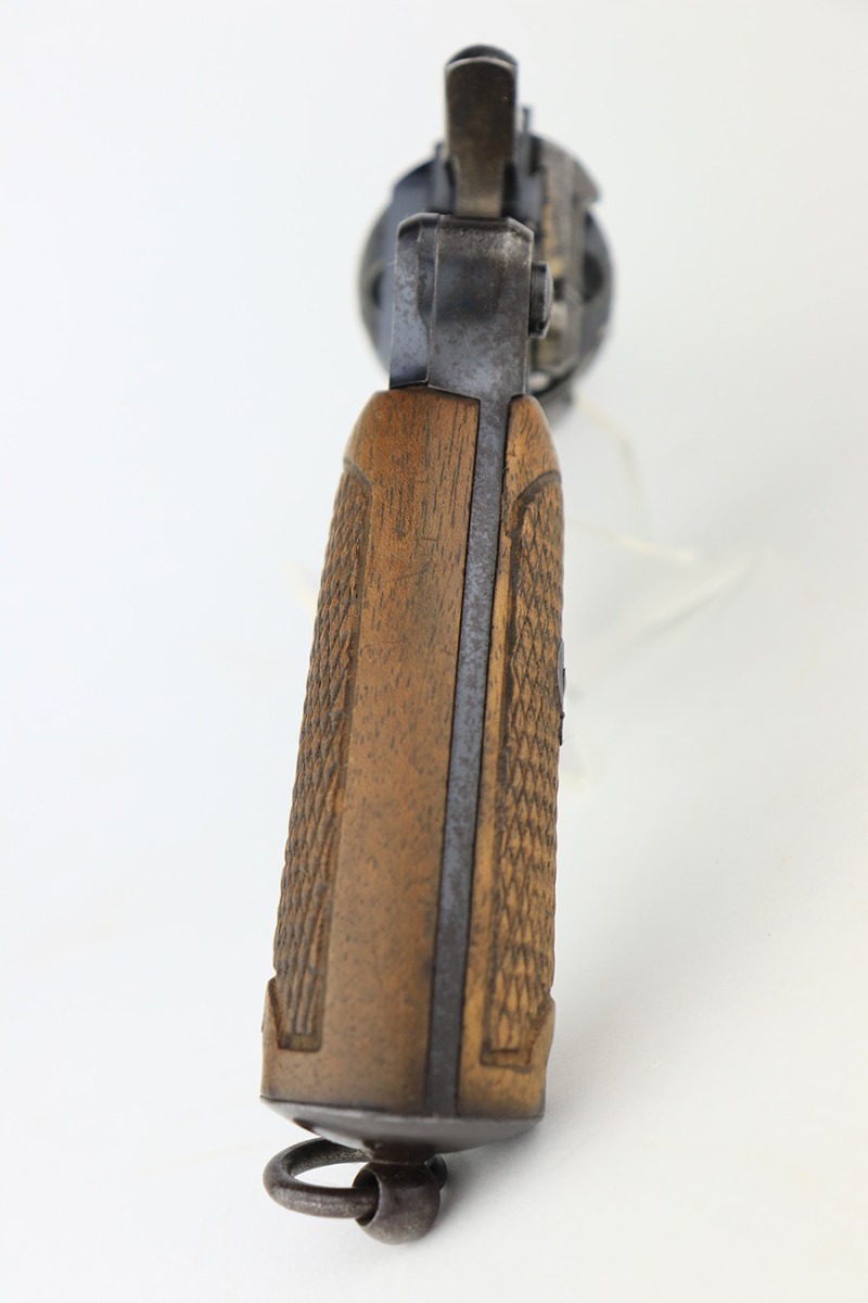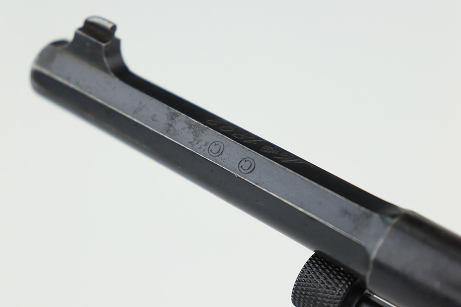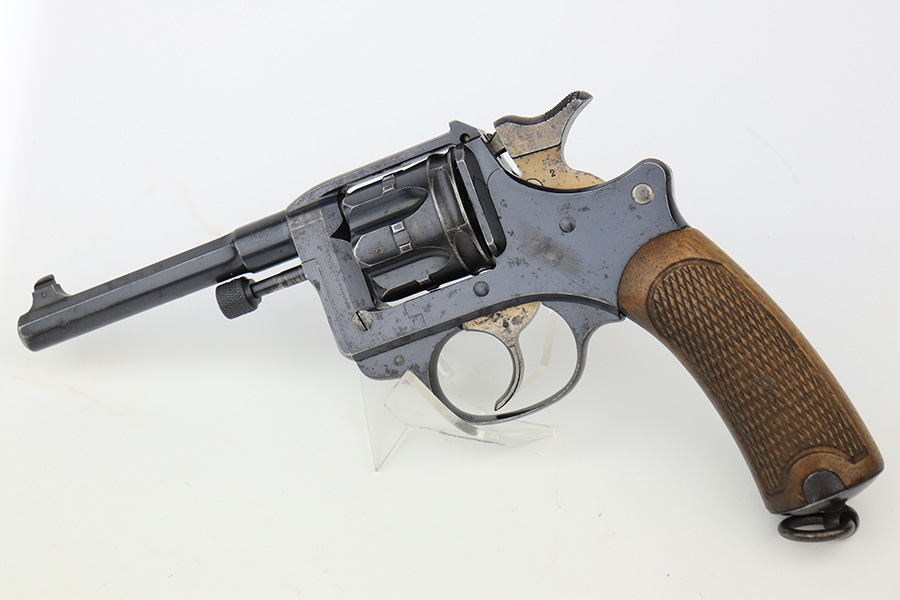 3/21/23 – This is a nice French MAS M1892 Lebel revolver from 1912. It is all matching, and there appears to be some sort of retailer marking on the left side of the frame. Generally, there is wear around the high edges and some light spotty oxidation with pin-pricking throughout. Some light scratching on the left side of the frame. Comes with nice wood grips. Very nice bore with strong rifling.