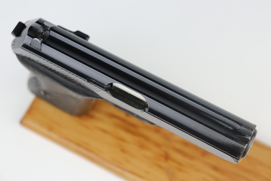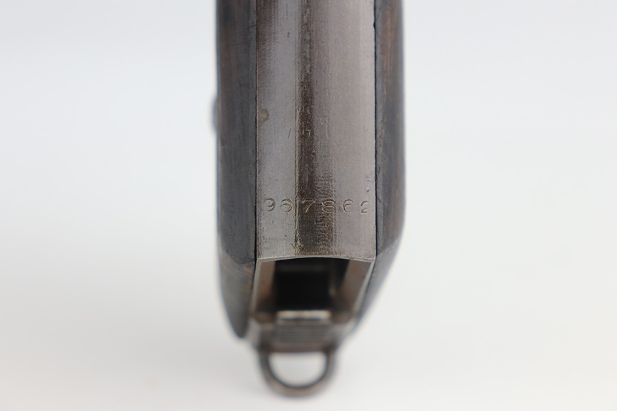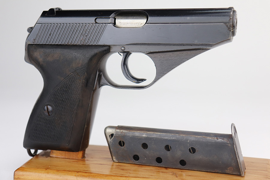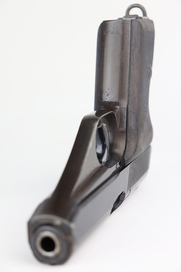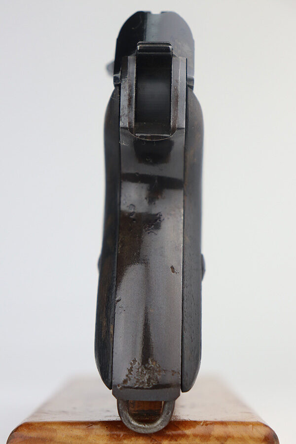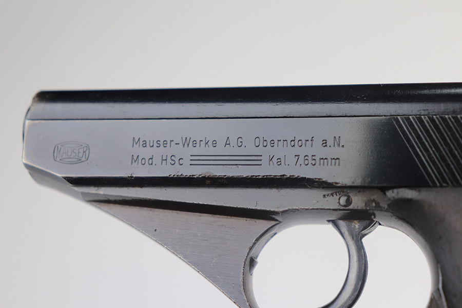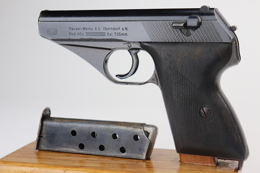 5/28/21 – This is a very nice example of a French-made Mauser HSC manufactured immediately after WW2. It is matching and has the French “RW” proof on the left side of the trigger guard. It has retained about 98% of its bluing. There is very minor thinning on the straps and a hint of wear around the muzzle. While there is very little actual finish loss, there are areas of significant pitting around the muzzle, bottom edge of the left side of the slide, back strap, and left side of the trigger guard. There are some heavy dots of oxidation on the straps. Comes with fairly worn wood grips and a proper magazine. Mint bore.